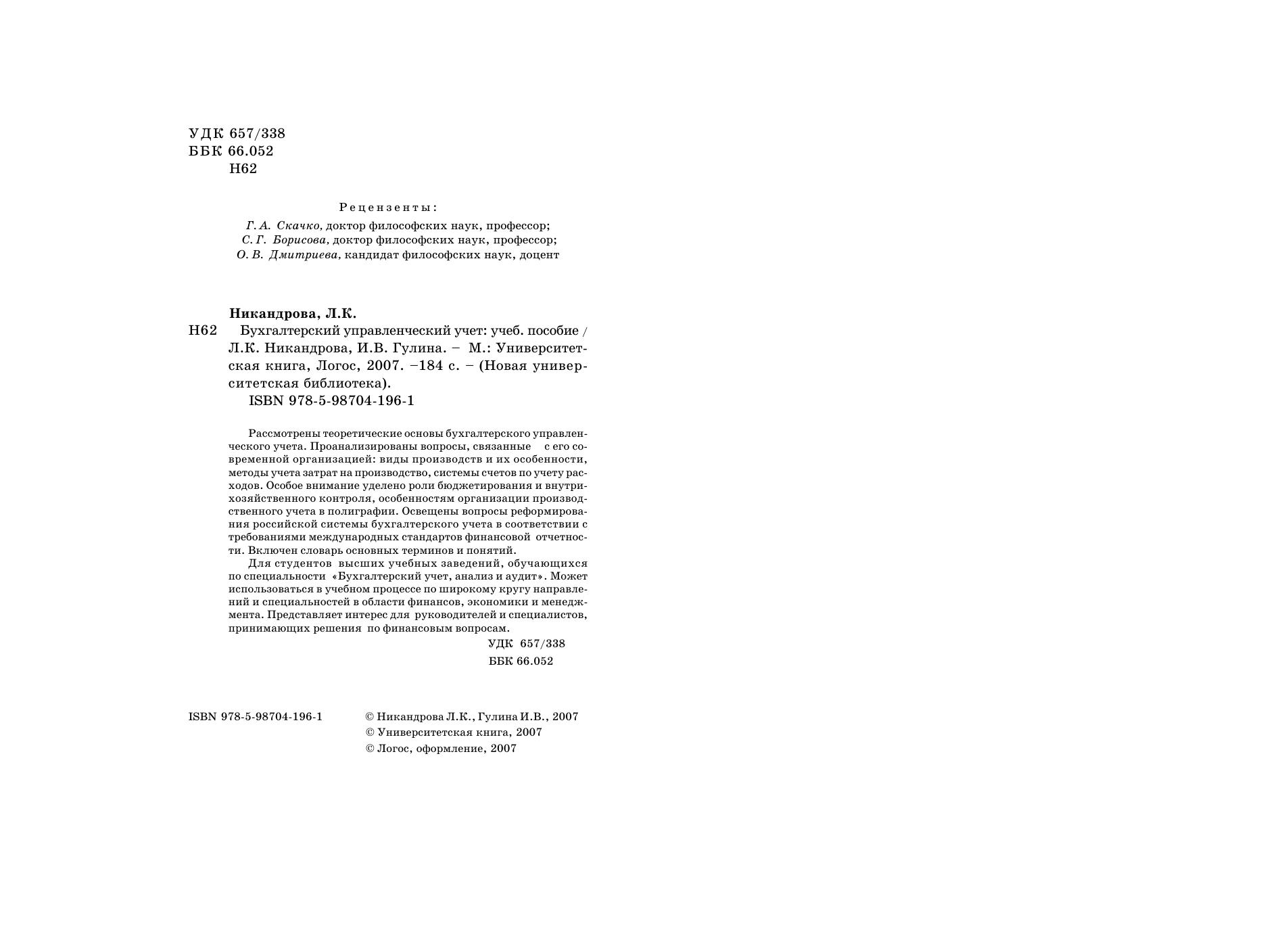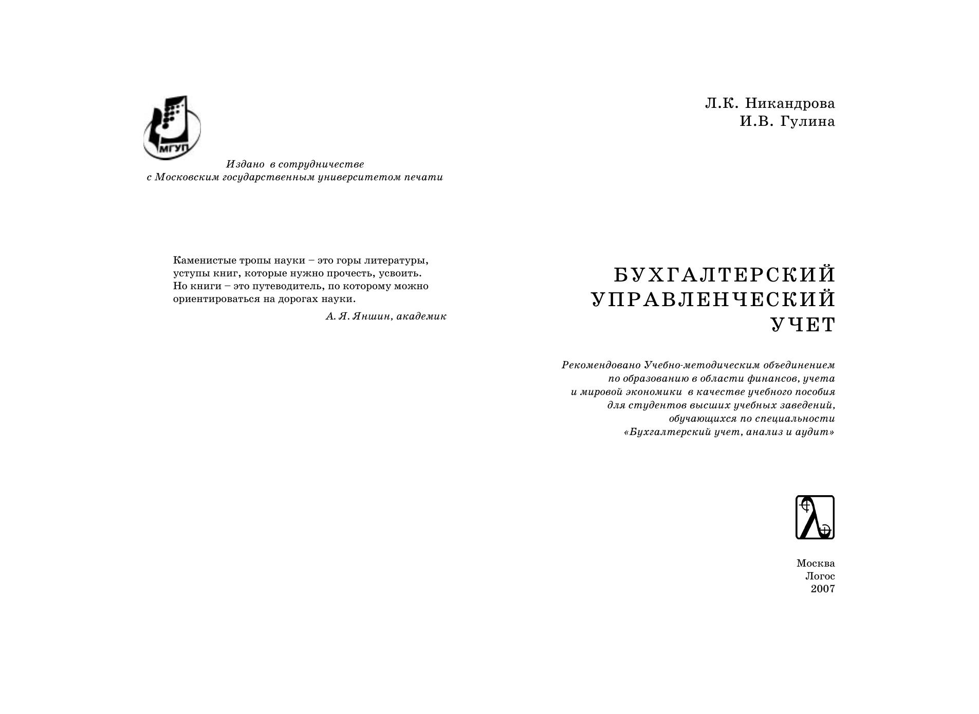 Рассмотрены теоретические основы бухгалтерского управленческого учета. Проанализированы вопросы, связанные с его современной организацией: виды производств и их особенности, методы учета затрат на производство, системы счетов по учету расходов. Особое внимание уделено роли бюджетирования и внутрихозяйственного контроля, особенностям организации производственного учета в полиграфии. Освещены вопросы реформирования российской системы бухгалтерского учета в соответствии с требованиями международных стандартов финансовой отчетности. Включен словарь основных терминов и понятий. Для студентов высших учебных заведений, обучающихся по специальности «Бухгалтерский учет, анализ и аудит». Может использоваться в учебном процессе по широкому кругу направлений и специальностей в области финансов, экономики и менеджмента. Представляет интерес для руководителей и специалистов, принимающих решения по финансовым вопросам.