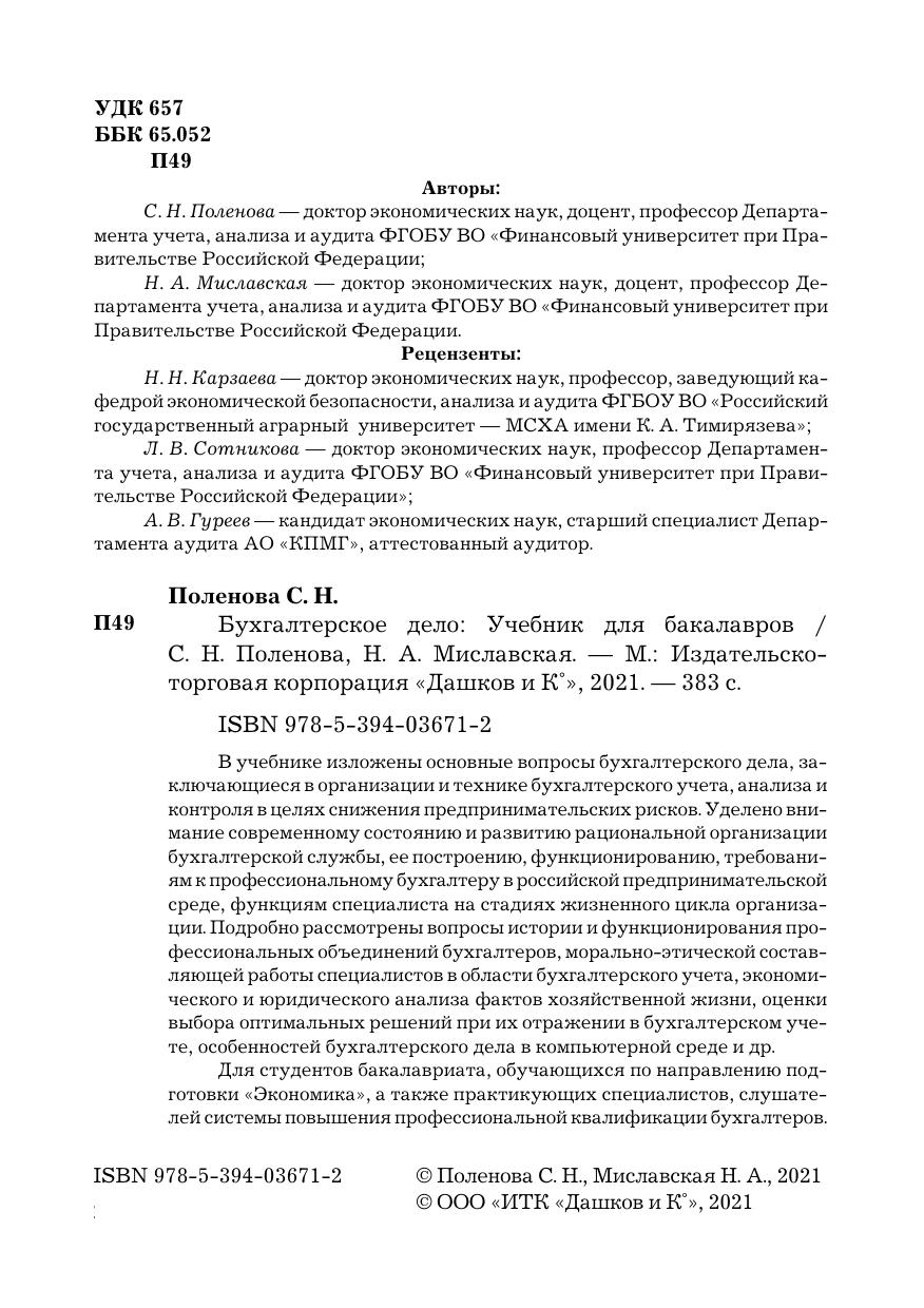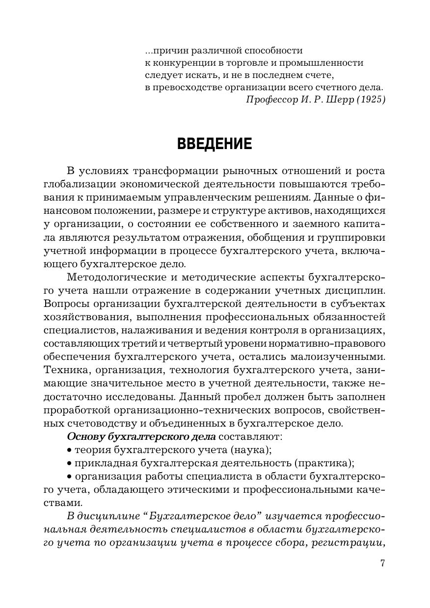 В учебнике изложены основные вопросы бухгалтерского дела, заключающиеся в организации и технике бухгалтерского учета, анализа и контроля в целях снижения предпринимательских рисков. Уделено внимание современному состоянию и развитию рациональной организации бухгалтерской службы, ее построению, функционированию, требованиям к профессиональному бухгалтеру в российской предпринимательской среде, функциям специалиста на стадиях жизненного цикла организации. Подробно рассмотрены вопросы истории и функционирования профессиональных объединений бухгалтеров, морально-этической составляющей работы специалистов в области бухгалтерского учета, экономического и юридического анализа фактов хозяйственной жизни, оценки выбора оптимальных решений при их отражении в бухгалтерском учете, особенностей бухгалтерского дела в компьютерной среде и др.