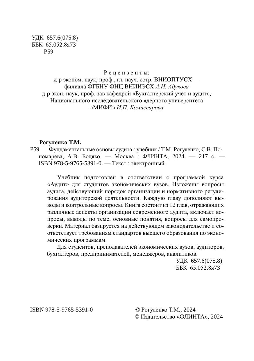 Учебник подготовлен в соответствии с программой курса «Аудит» для студентов экономических вузов. Изложены вопросы аудита, действующий порядок организации и нормативного регулирования аудиторской деятельности. Каждую главу дополняют выводы и контрольные вопросы. Книга состоит из 12 глав, отражающих различные аспекты организации современного аудита, включает вопросы, выводы по теме, основные понятия, вопросы для самопроверки. Материал базируется на действующем законодательстве и соответствует требованиям стандартов высшего образования по экономических программам.