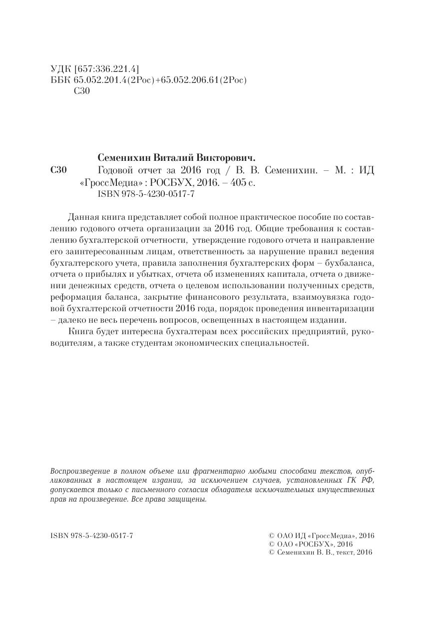 Данная книга представляет собой полное практическое пособие по составлению годового отчета организации за 2016 год. Общие требования к составлению бухгалтерской отчетности, утверждение годового отчета и направление его заинтересованным лицам, ответственность за нарушение правил ведения бухгалтерского учета, правила заполнения бухгалтерских форм – бухбаланса, отчета о прибылях и убытках, отчета об изменениях капитала, отчета о движении денежных средств, отчета о целевом использовании полученных средств, реформация баланса, закрытие финансового результата, взаимоувязка годовой бухгалтерской отчетности 2016 года, порядок проведения инвентаризации – далеко не весь перечень вопросов, освещенных в настоящем издании. Книга будет интересна бухгалтерам всех российских предприятий, руководителям, а также студентам экономических специальностей.