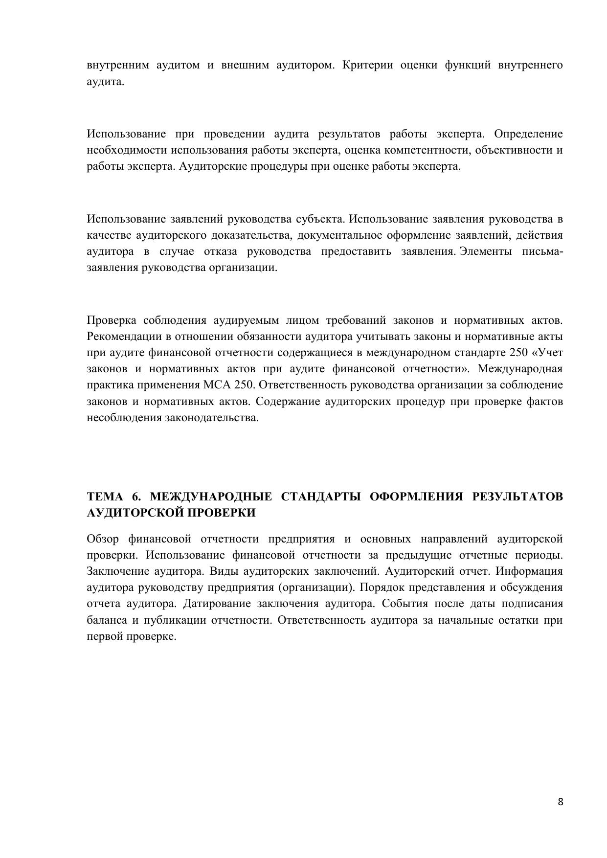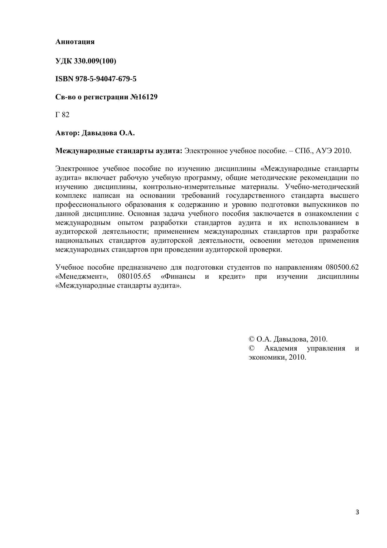 Электронное учебное пособие по изучению дисциплины «Международные стандарты аудита» включает рабочую учебную программу, общие методические рекомендации по изучению дисциплины, контрольно-измерительные материалы. Учебно-методический комплекс написан на основании требований государственного стандарта высшего профессионального образования к содержанию и уровню подготовки выпускников по данной дисциплине. Основная задача учебного пособия заключается в ознакомлении с международным опытом разработки стандартов аудита и их использованием в аудиторской деятельности применением международных стандартов при разработке национальных стандартов аудиторской деятельности, освоении методов применения международных стандартов при проведении аудиторской проверки. Учебное пособие предназначено для подготовки студентов по направлениям 080500.62 «Менеджмент», 080105.65 «Финансы и кредит» при изучении дисциплины «Международные стандарты аудита». Электронное учебное пособие для дистанционного обучения
