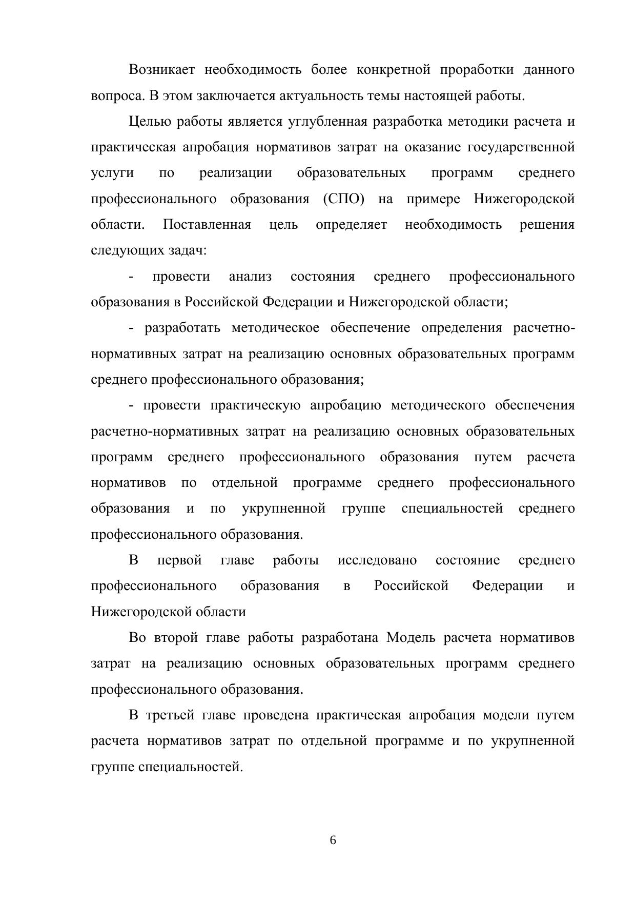 Исследовано состояние среднего профессионального образования в Российской Федерации и Нижегородской области, разработана модель расчета нормативов затрат на реализацию основных образовательных программ среднего профессионального образования, проведена практическая апробация модели путем расчета нормативов затрат по отдельной программе и по укрупненной группе специальностей.
