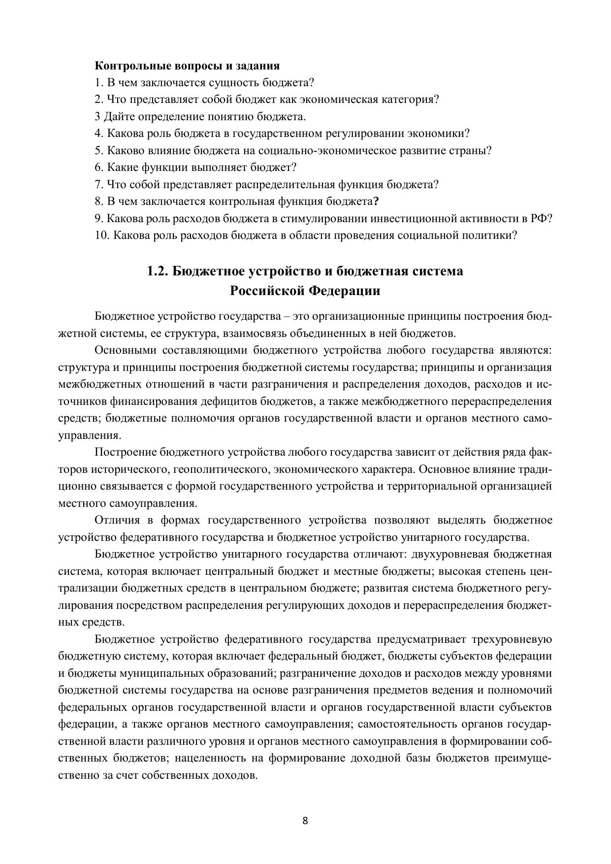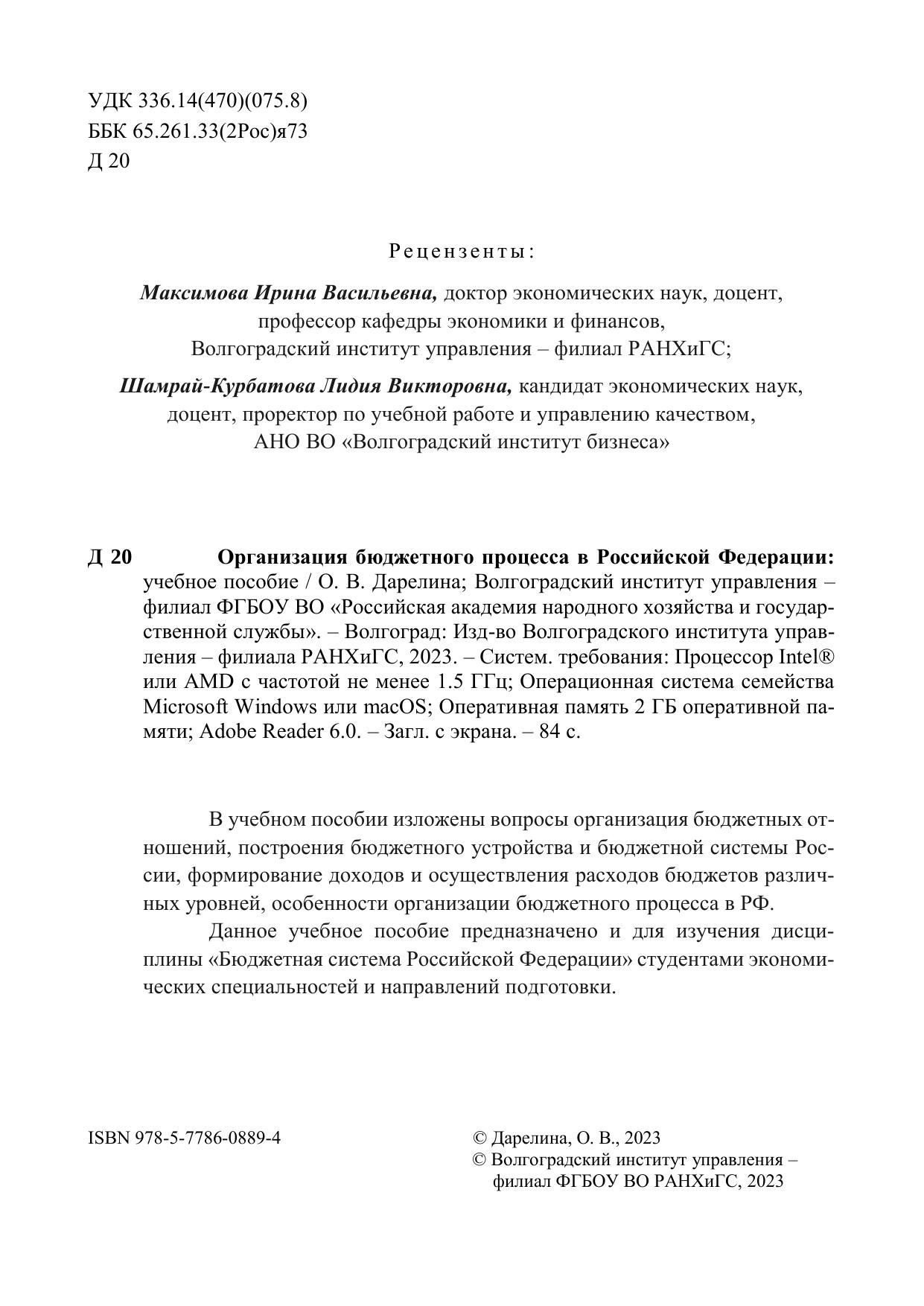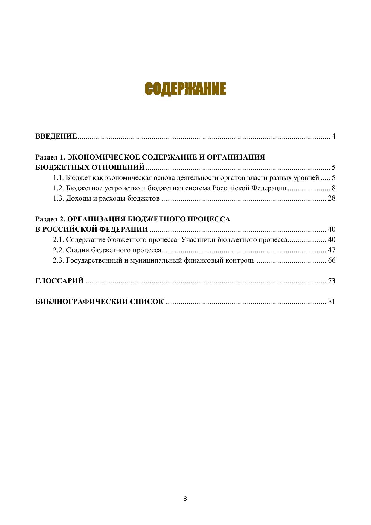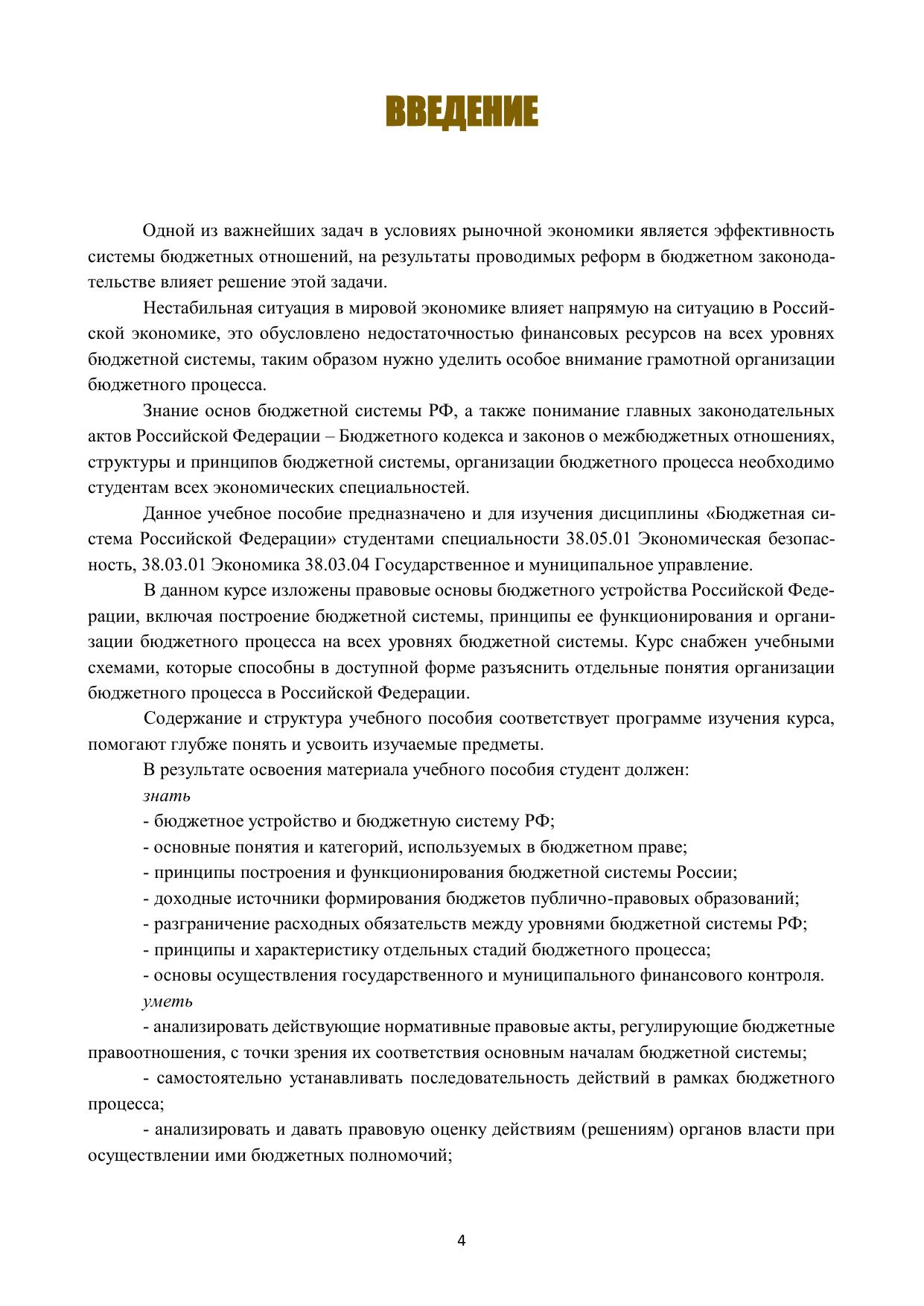 В учебном пособии изложены вопросы организация бюджетных от-ношений, построения бюджетного устройства и бюджетной системы Рос-сии, формирование доходов и осуществления расходов бюджетов различ-ных уровней, особенности организации бюджетного процесса в РФ. Данное учебное пособие предназначено и для изучения дисци-плины «Бюджетная система Российской Федерации» студентами экономи-ческих специальностей и направлений подготовки.