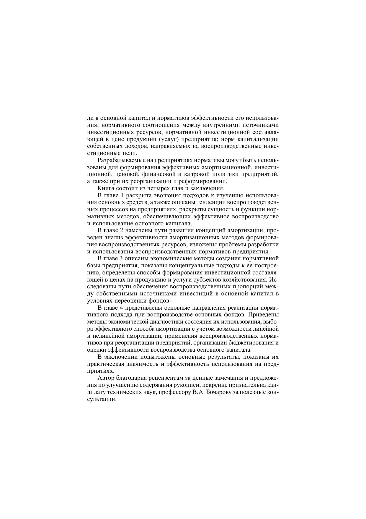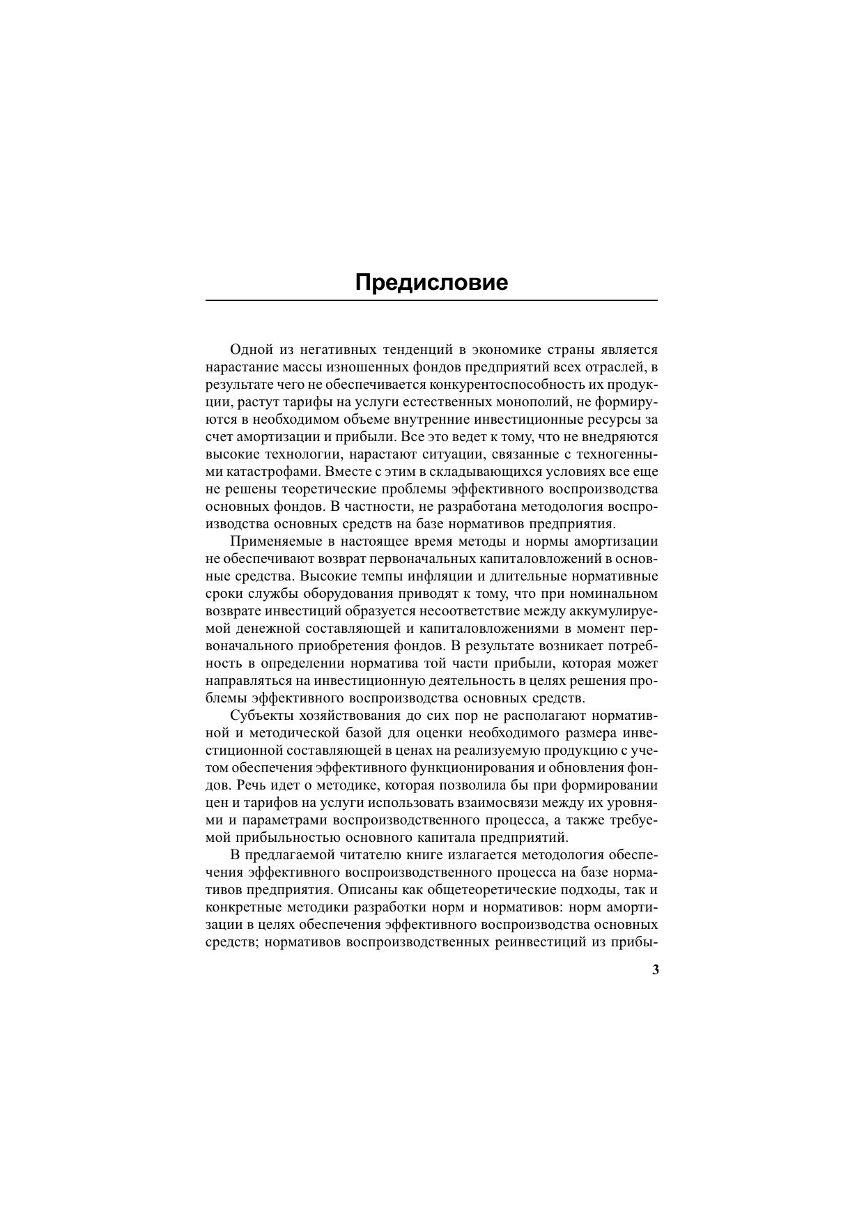 Исследуется проблема создания методологии воспроизводства основных средств на базе нормативов предприятия. Показаны методы разработки: норм амортизации; нормативов минимально необходимых реинвестиций из прибыли в основной капитал для обеспечения его самопроизводства; норм прибыли на основной капитал; нормативного соотношения между внутренними источниками инвестиционных ресурсов; нормативов инвестиционных ресурсов в цене продукции (услуг); нормативов капитализации дохода. Изложены методы использования нормативов для формирования эффективной амортизационной, ценовой и экономической политики предприятия. Для руководителей, экономистов и финансистов; представляет интерес для преподавателей, аспирантов, студентов.