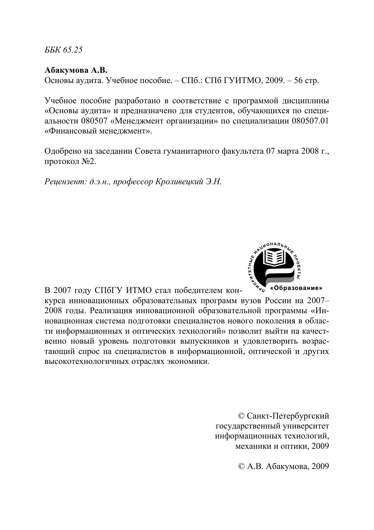 Учебное пособие разработано в соответствие с программой дисциплины «Основы аудита» и предназначено для студентов, обучающихся по специальности 080507 «Менеджмент организации» по специализации 080507.01 «Финансовый менеджмент».