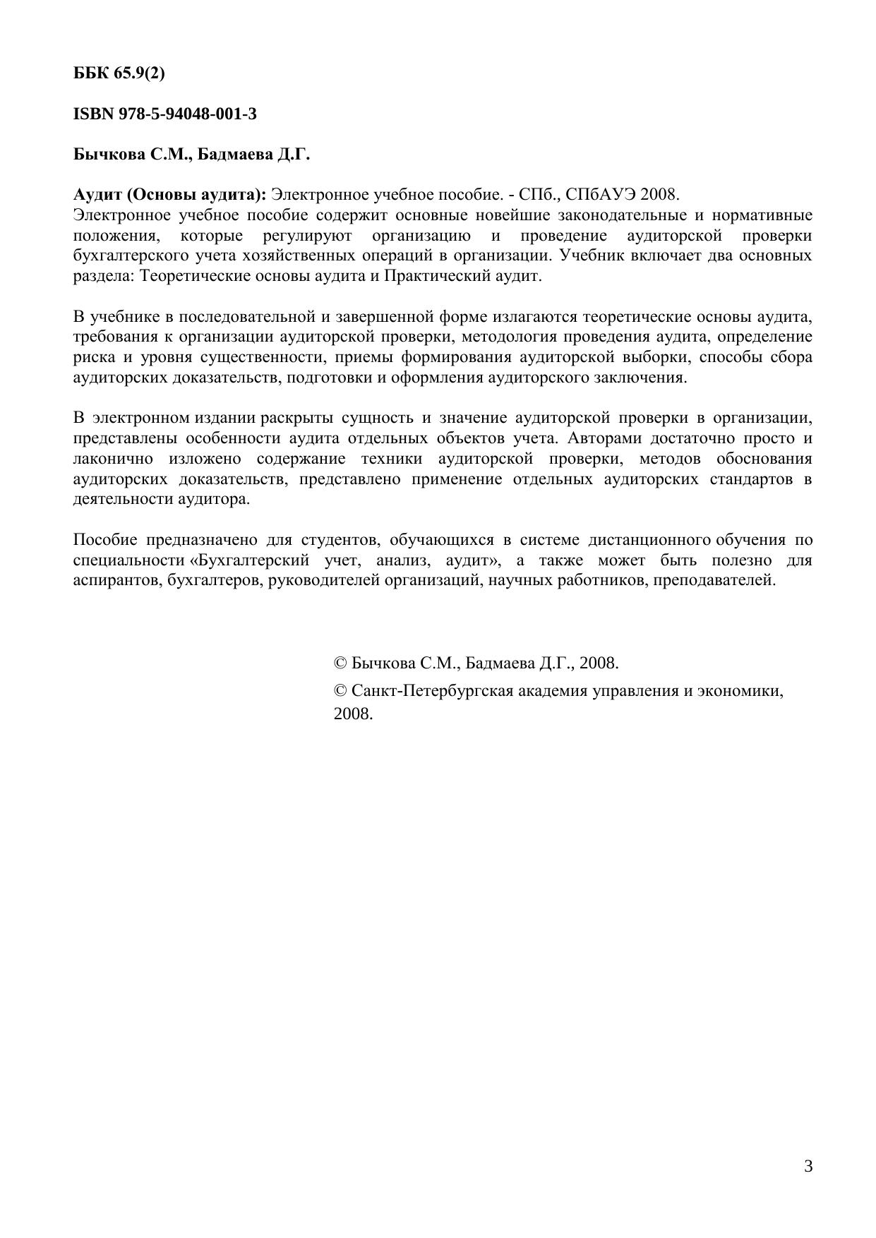 Электронное учебное пособие содержит основные новейшие законодательные и нормативные положения, которые регулируют организацию и проведение аудиторской проверки бухгалтерского учета хозяйственных операций в организации. Учебник включает два основных раздела: Теоретические основы аудита и Практический аудит. В учебнике в последовательной и завершенной форме излагаются теоретические основы аудита, требования к организации аудиторской проверки, методология проведения аудита, определение риска и уровня существенности, приемы формирования аудиторской выборки, способы сбора аудиторских доказательств, подготовки и оформления аудиторского заключения. В электронном издании раскрыты сущность и значение аудиторской проверки в организации, представлены особенности аудита отдельных объектов учета. Авторами достаточно просто и лаконично изложено содержание техники аудиторской проверки, методов обоснования аудиторских доказательств, представлено применение отдельных аудиторских стандартов в деятельности аудитора. Пособие предназначено для студентов, обучающихся в системе дистанционного обучения по специальности «Бухгалтерский учет, анализ, аудит», а также может быть полезно для аспирантов, бухгалтеров, руководителей организаций, научных работников, преподавателей