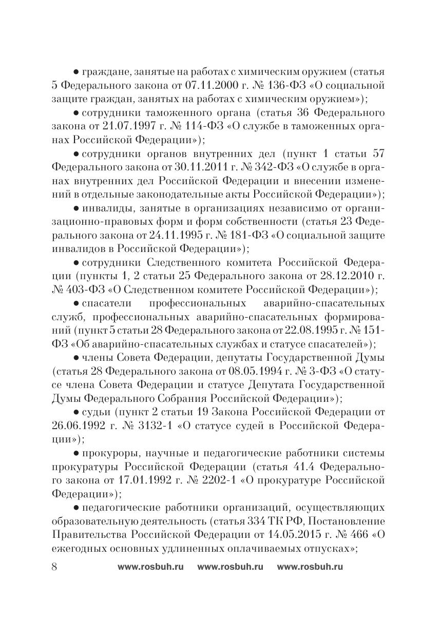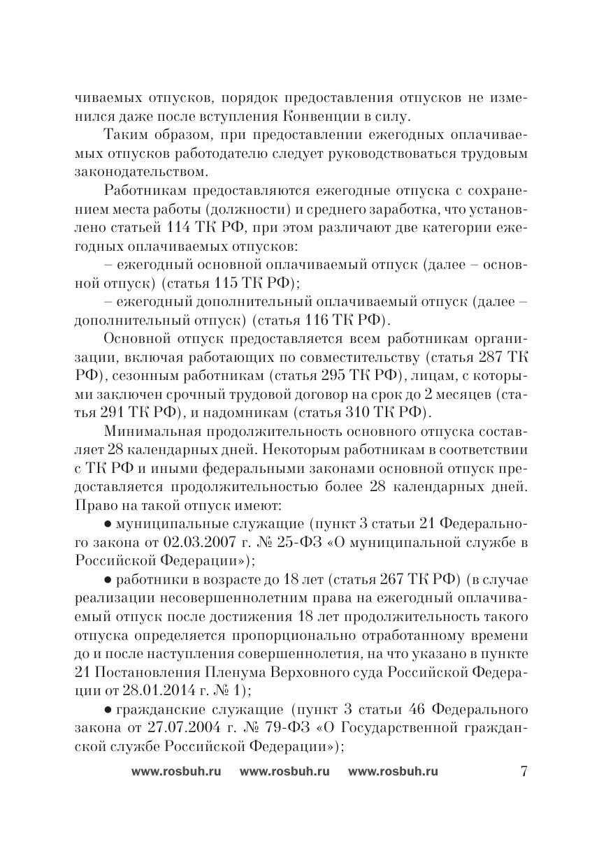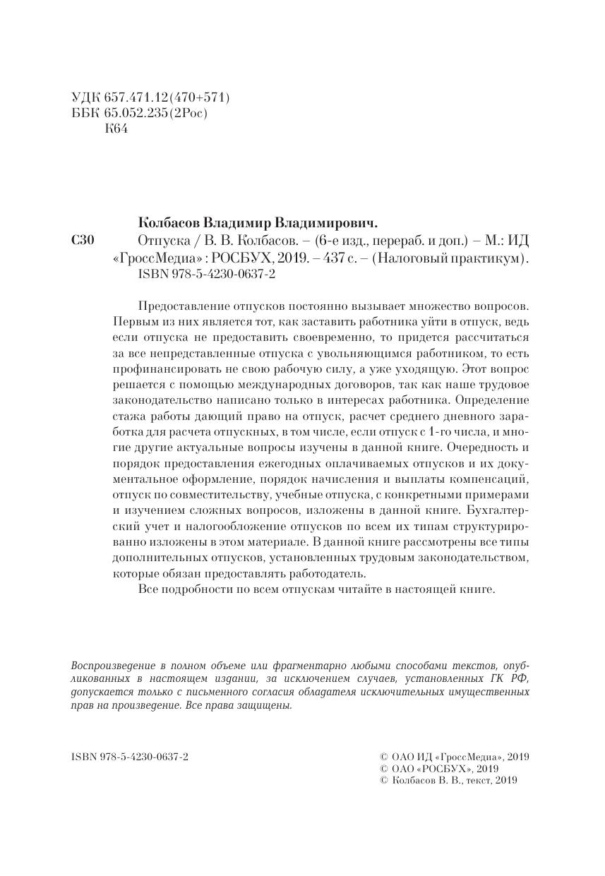 Предоставление отпусков постоянно вызывает множество вопросов. Первым из них является тот, как заставить работника уйти в отпуск, ведь если отпуска не предоставить своевременно, то придется рассчитаться за все непредставленные отпуска с увольняющимся работником, то есть профинансировать не свою рабочую силу, а уже уходящую. Этот вопрос решается с помощью международных договоров, так как наше трудовое законодательство написано только в интересах работника. Определение стажа работы дающий право на отпуск, расчет среднего дневного заработка для расчета отпускных, в том числе, если отпуск с 1-го числа, и многие другие актуальные вопросы изучены в данной книге. Очередность и порядок предоставления ежегодных оплачиваемых отпусков и их документальное оформление, порядок начисления и выплаты компенсаций, отпуск по совместительству, учебные отпуска, с конкретными примерами и изучением сложных вопросов, изложены в данной книге. Бухгалтерский учет и налогообложение отпусков по всем их типам структурированно изложены в этом материале. В данной книге рассмотрены все типы дополнительных отпусков, установленных трудовым законодательством, которые обязан предоставлять работодатель. Все подробности по всем отпускам читайте в настоящей книге.