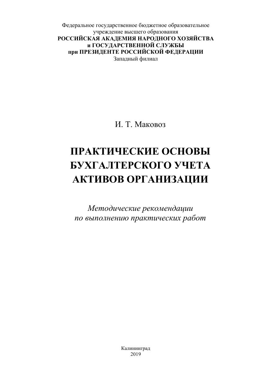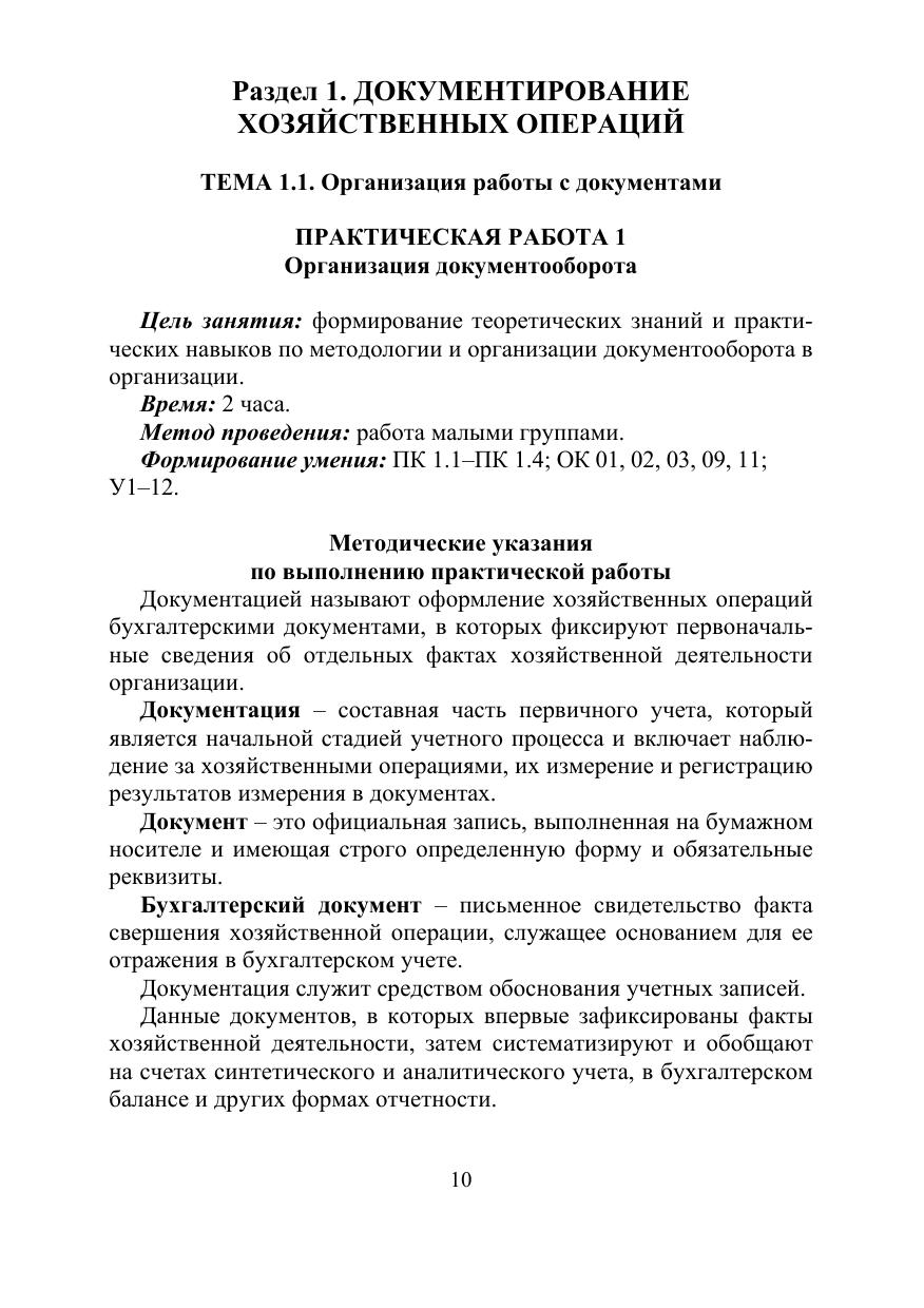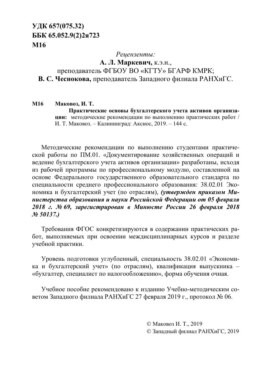 Методические рекомендации по выполнению студентами практической работы по ПМ.01. «Документирование хозяйственных операций и ведение бухгалтерского учета активов организации» разработаны, исходя из рабочей программы по профессиональному модулю, составленной на основе Федерального государственного образовательного стандарта по специальности среднего профессионального образования: 38.02.01 Экономика и бухгалтерский учет (по отраслям), (утвержден приказом Министерства образования и науки Российской Федерации от 05 февраля 2018 г. № 69, зарегистрирован в Минюсте России 26 февраля 2018 № 50137.) Требования ФГОС конкретизируются в содержании практических работ, выполняемых при освоении междисциплинарных курсов и разделе учебной практики. Уровень подготовки углубленный, специальность 38.02.01 «Экономика и бухгалтерский учет» (по отраслям), квалификация выпускника – «бухгалтер, специалист по налогообложению», форма обучения очная.