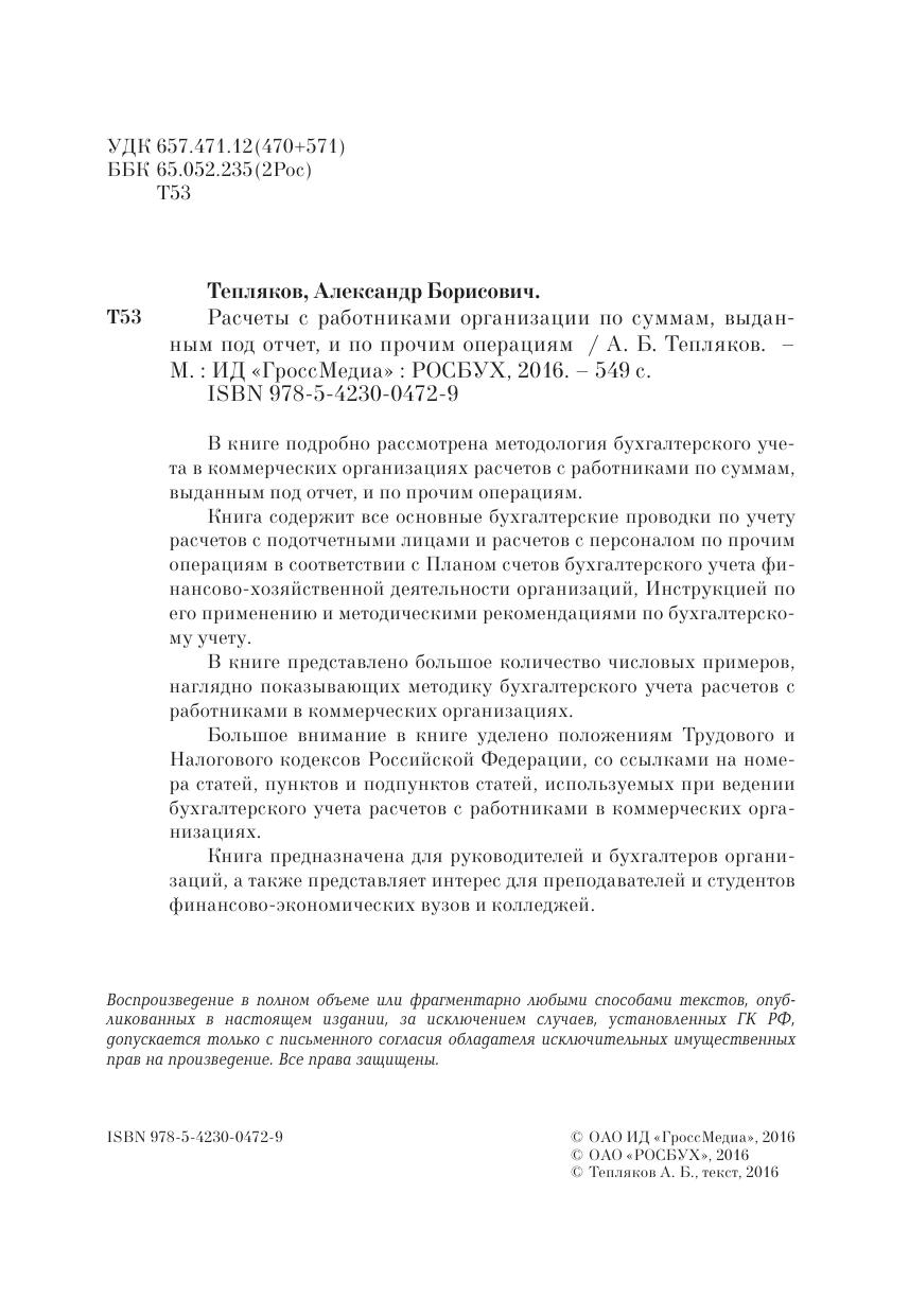 В книге подробно рассмотрена методология бухгалтерского учета в коммерческих организациях расчетов с работниками по суммам, выданным под отчет, и по прочим операциям. Книга содержит все основные бухгалтерские проводки по учету расчетов с подотчетными лицами и расчетов с персоналом по прочим операциям в соответствии с Планом счетов бухгалтерского учета финансово-хозяйственной деятельности организаций, Инструкцией по его применению и методическими рекомендациями по бухгалтерскому учету. В книге представлено большое количество числовых примеров, наглядно показывающих методику бухгалтерского учета расчетов с работниками в коммерческих организациях. Большое внимание в книге уделено положениям Трудового и Налогового кодексов Российской Федерации, со ссылками на номера статей, пунктов и подпунктов статей, используемых при ведении бухгалтерского учета расчетов с работниками в коммерческих организациях. Книга предназначена для руководителей и бухгалтеров организаций, а также представляет интерес для преподавателей и студентов финансово-экономических вузов и колледжей.