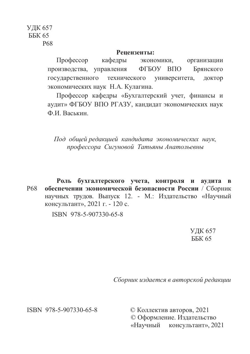 Роль бухгалтерского учета, контроля и аудита в обеспечении экономической безопасности России. Выпуск 12