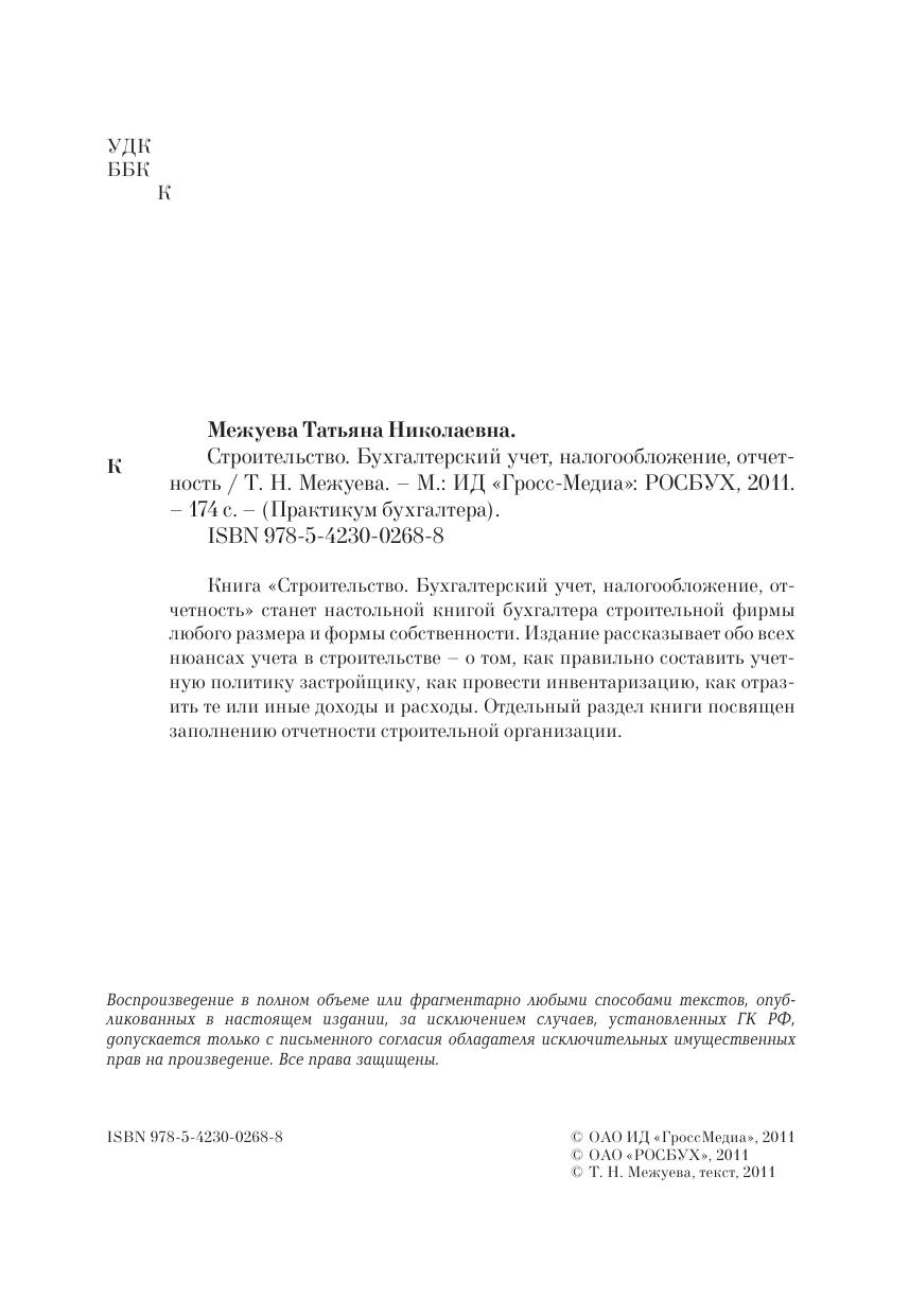 Книга «Строительство. Бухгалтерский учет, налогообложение, отчетность» станет настольной книгой бухгалтера строительной фирмы любого размера и формы собственности. Издание рассказывает обо всех нюансах учета в строительстве – о том, как правильно составить учетную политику застройщику, как провести инвентаризацию, как отразить те или иные доходы и расходы. Отдельный раздел книги посвящен заполнению отчетности строительной организации.
