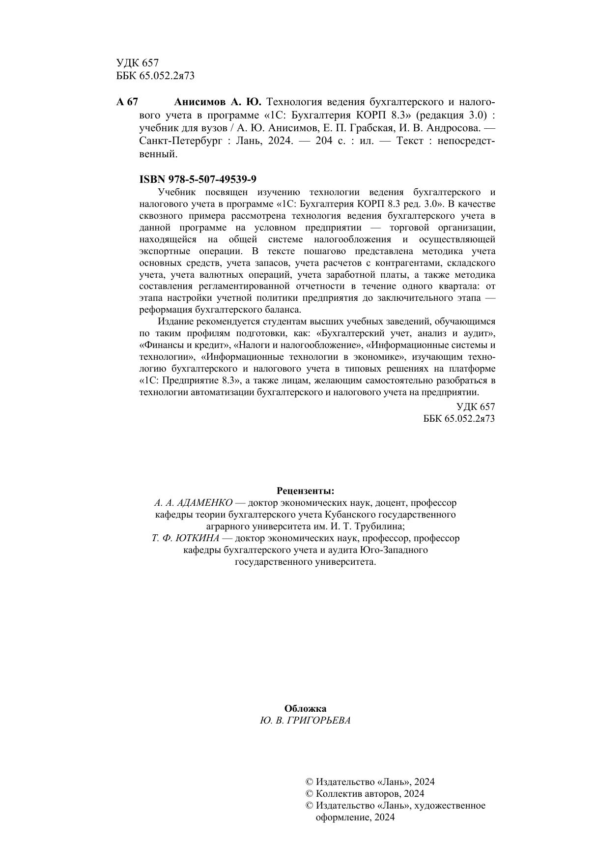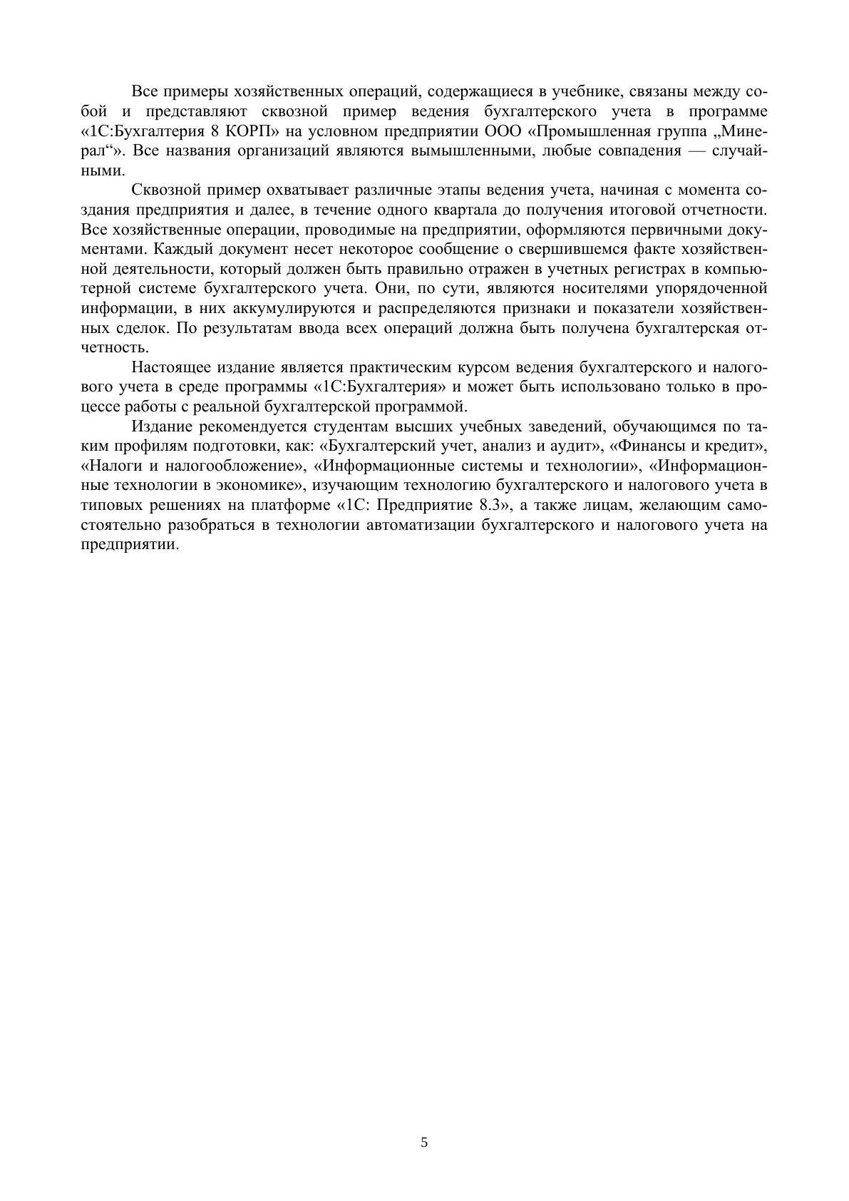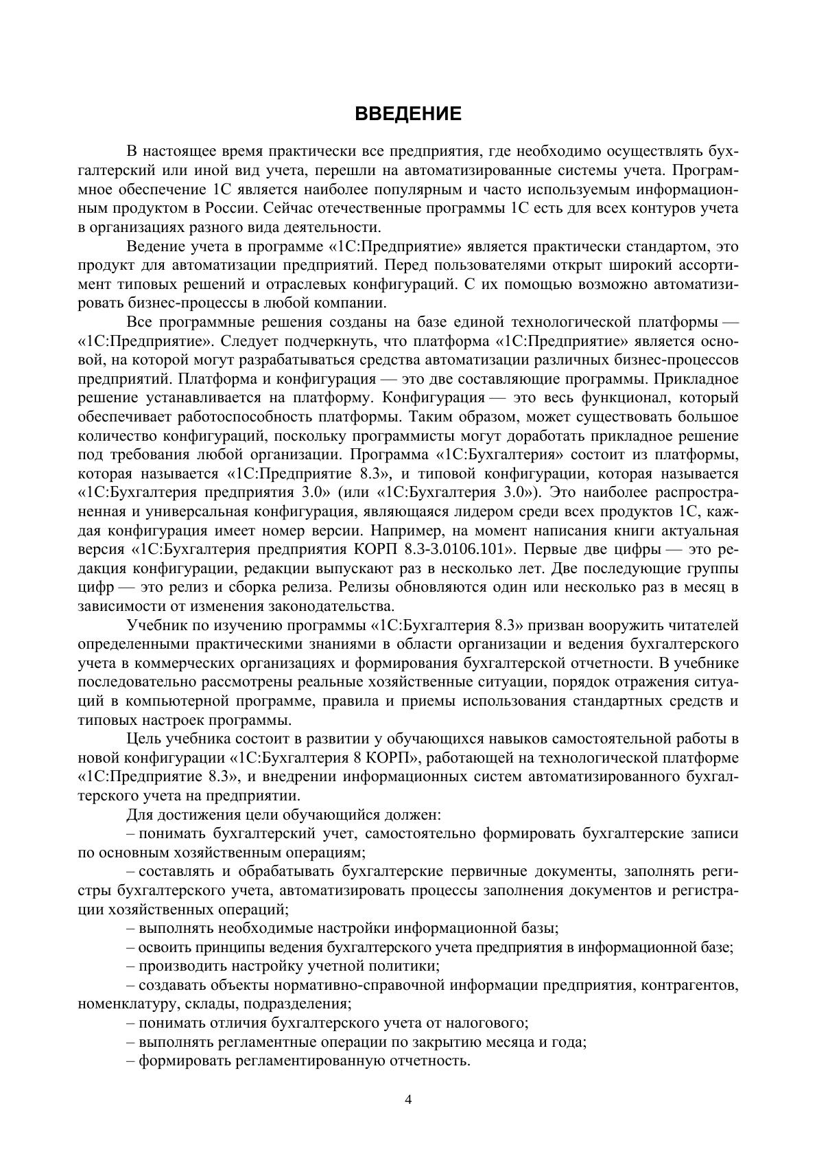 Учебник посвящен изучению технологии ведения бухгалтерского и налогового учета в программе «1С: Бухгалтерия КОРП 8.3 ред. 3.0». На сквозном примере рассмотрена технология ведения бухгалтерского учета на условном предприятии – торговой организации, находящейся на общей системе налогообложения, осуществляющей экспортные операции (учет основных средств, учет запасов, учет расчетов с контрагентами, складской учет, учет валютных операций, учет заработной платы, регламентированная отчетность), в течение одного квартала от этапа настройки учетной политики предприятия до заключительного этапа – реформация бухгалтерского баланса. Издание рекомендуется для студентов, обучающихся по программам бакалавриата и магистратуры по направлению «Бухгалтерский учет, анализ и аудит», «Финансы и кредит», «Налоги и налогообложение», «Информационные системы и технологии», «Информационные технологии в экономике», изучающих информационные технологии бухгалтерского и налогового учета в типовых решениях на платформе «1С: Предприятие 8.3», а также для лиц, желающих освоить технологию автоматизации бухгалтерского и налогового учета на предприятии.