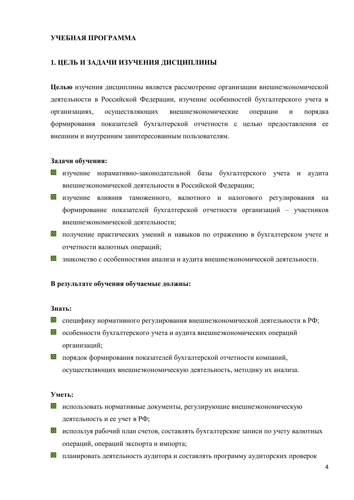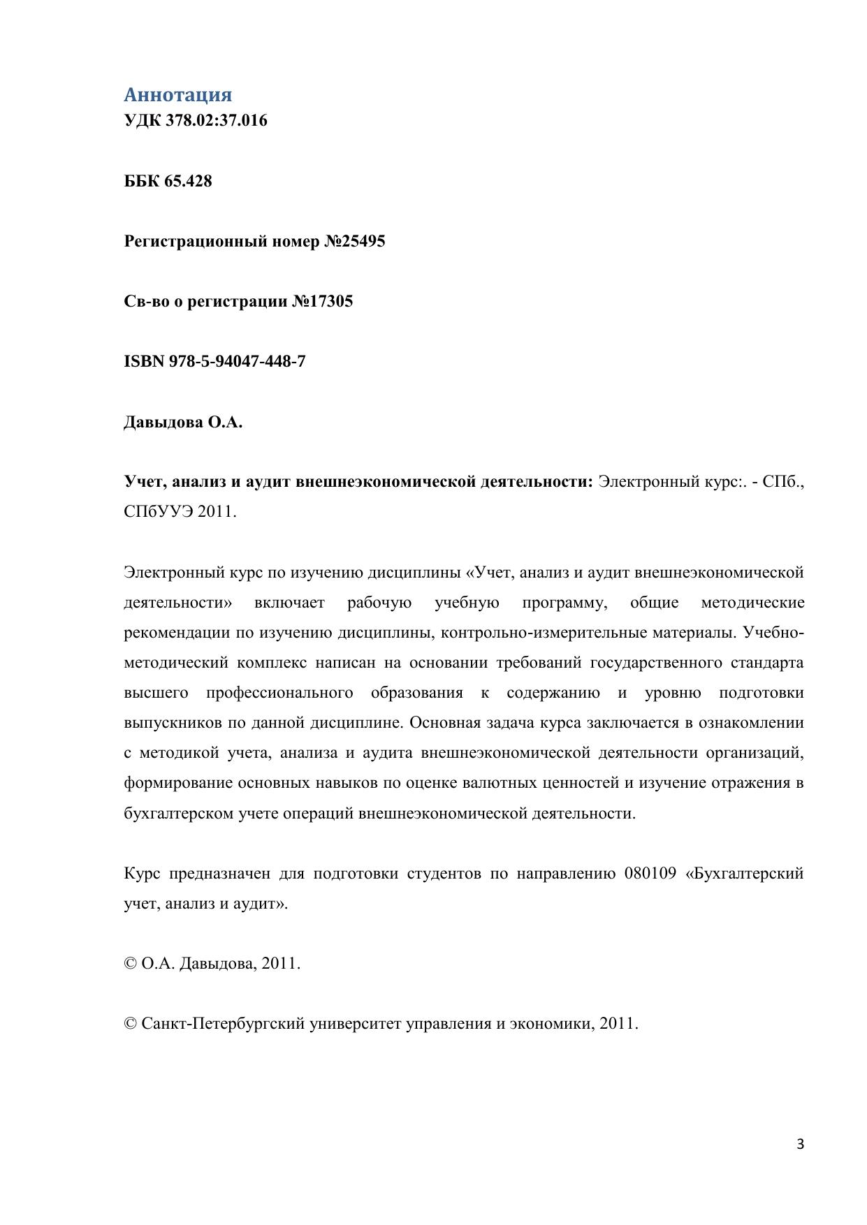 Электронный курс по изучению дисциплины «Учет, анализ и аудит внешнеэкономической деятельности» включает рабочую учебную программу, общие методические рекомендации по изучению дисциплины, контрольно-измерительные материалы. Учебно-методический комплекс написан на основании требований государственного стандарта высшего профессионального образования к содержанию и уровню подготовки выпускников по данной дисциплине. Основная задача курса заключается в ознакомлении с методикой учета, анализа и аудита внешнеэкономической деятельности организаций, формирование основных навыков по оценке валютных ценностей и изучение отражения в бухгалтерском учете операций внешнеэкономической деятельности. Курс предназначен для подготовки студентов по направлению 080109 «Бухгалтерский учет, анализ и аудит».