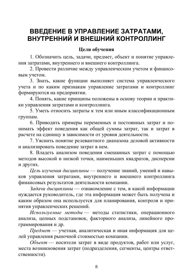 В учебном пособии подробно рассмотрены ключевые разделы методологии управления затратами и контроллинга (внутреннего и внешнего), а именно: классификация затрат для целей управления, управленческий учет и контроллинг производственных затрат по процессам и заказам, калькулирование себестоимости и ценообразование неполной себестоимости, управление прибылью на основе CVP-анализа, сегментирование отчетов о финансовых результатах, бюджетирование и оценка эффективности управления центрами ответственности, контроллинг затрат и финансовых результатов. Кроме того, пособие снабжено практикумом, в который включены контрольные вопросы, тесты и задания, а также имеется глоссарий и список литературы. Для студентов вузов экономических направлений подготовки и факультетов повышения квалификации, руководителей экономических служб, профессиональных бухгалтеров (аналитиков и контроллеров), финансовых менеджеров.