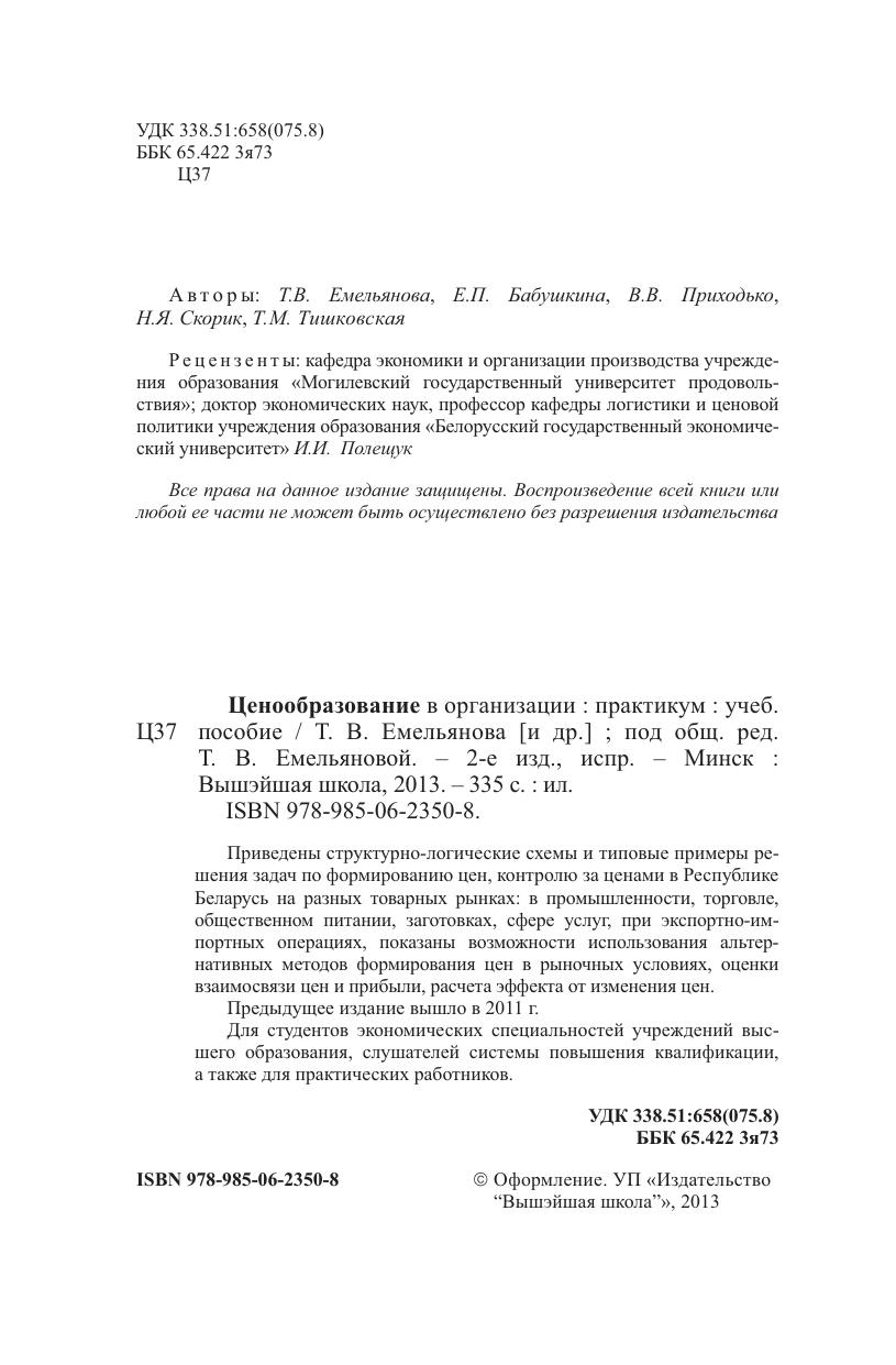 Приведены структурно-логические схемы и типовые примеры решения задач по формированию цен, контролю за ценами в Республике Беларусь на разных товарных рынках: в промышленности, торговле, общественном питании, заготовках, сфере услуг, при экспортно-импортных операциях, показаны возможности использования альтернативных методов формирования цен в рыночных условиях, оценки взаимосвязи цен и прибыли, расчета эффекта от изменения цен. Для студентов экономических специальностей вузов, слушателей системы повышения квалификации. Может быть полезно практическим работникам.