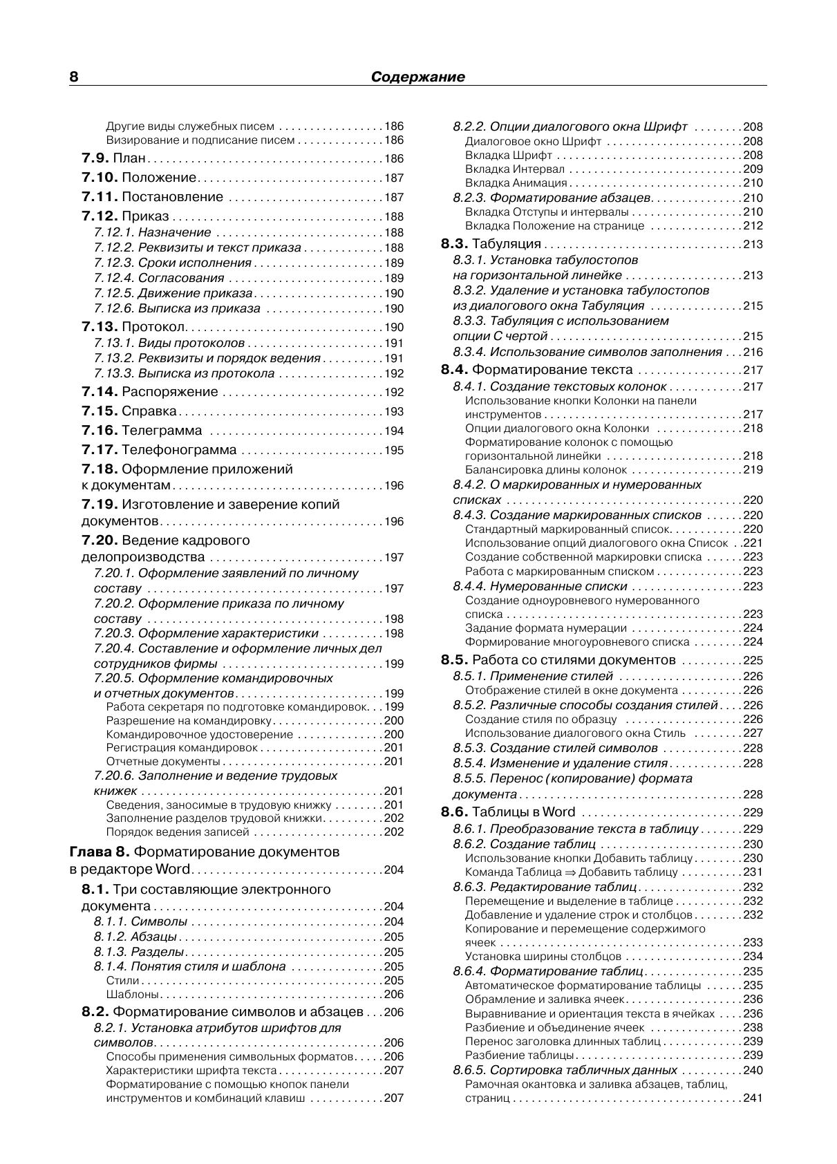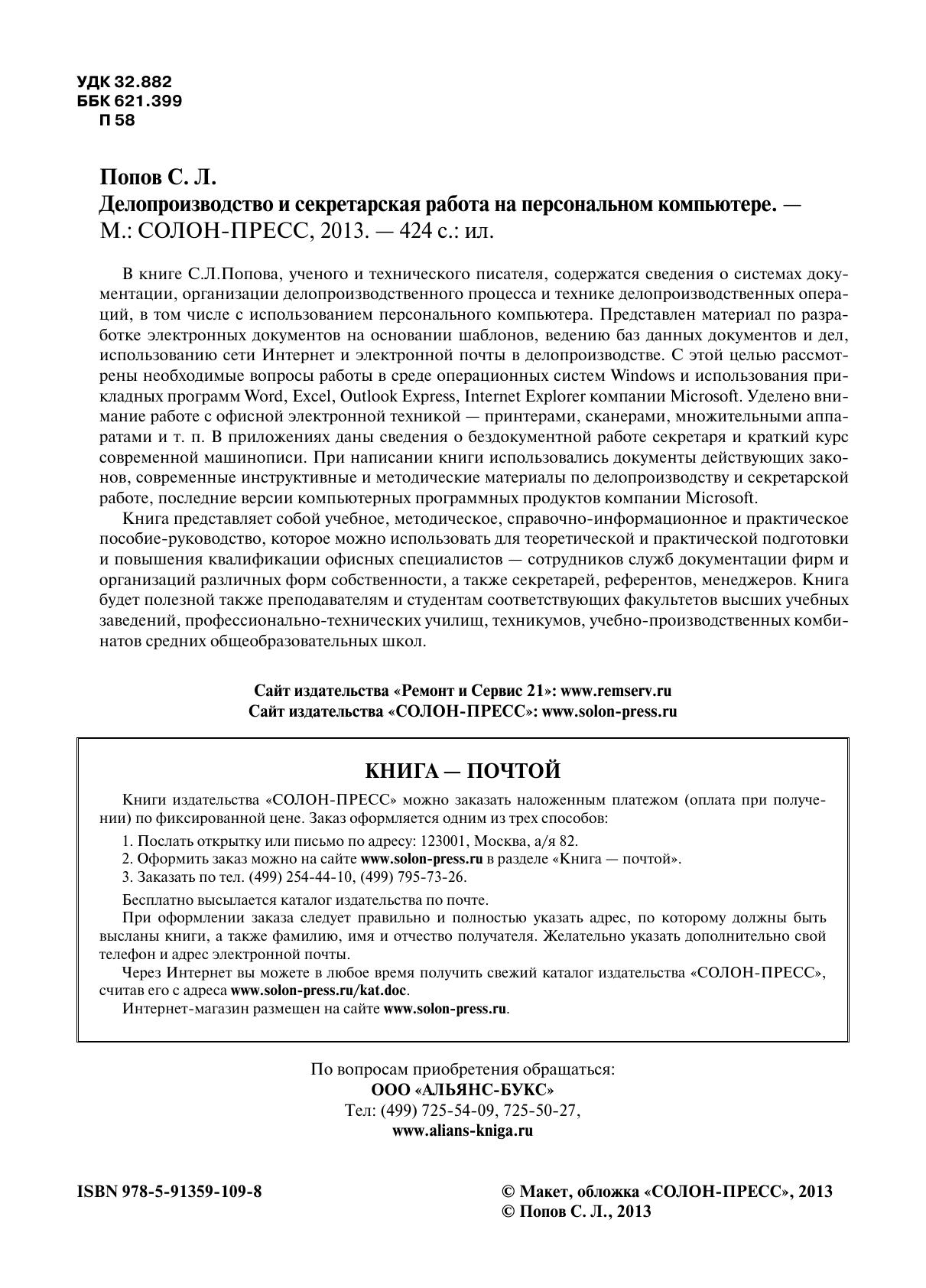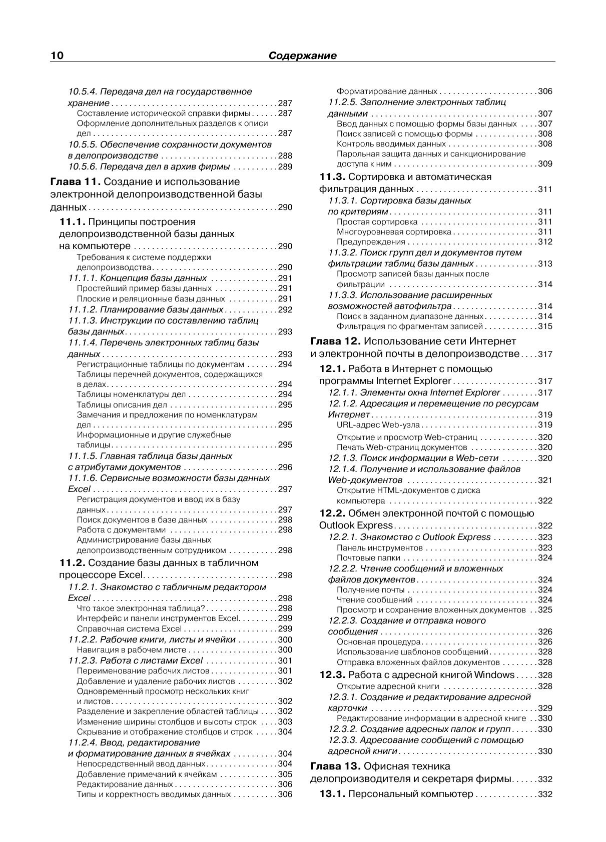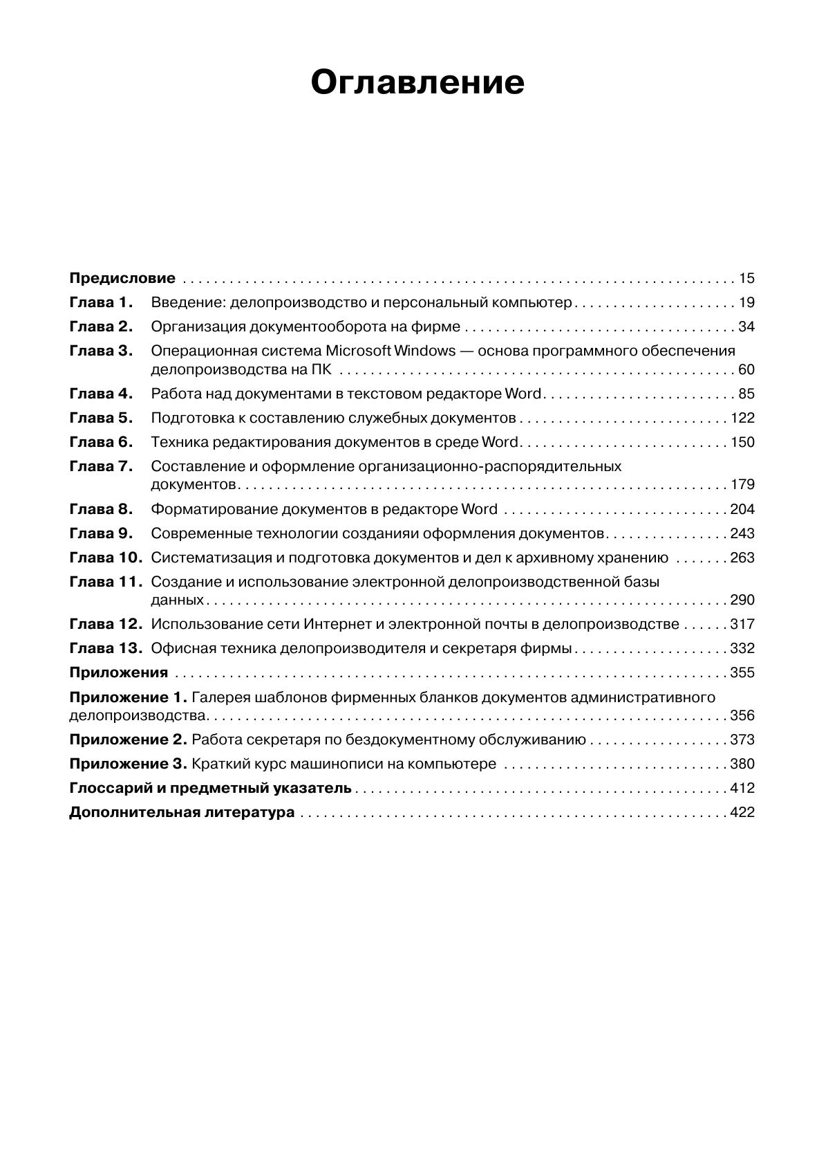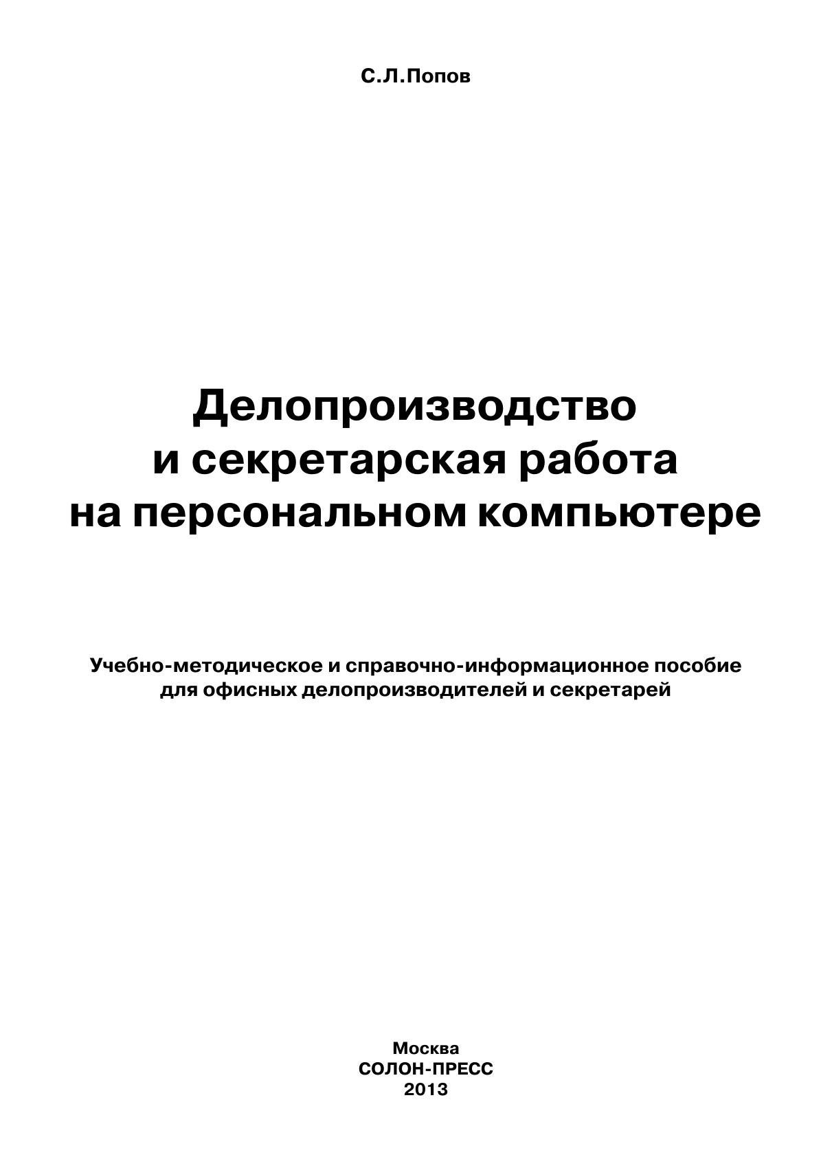В книге С.Л.Попова, ученого и технического писателя, содержатся сведения о системах документации, организации делопроизводственного процесса и технике делопроизводственных операций, в том числе с использованием персонального компьютера. Представ лен материал по разработке электронных документов на основании шаблонов, ведению баз данных документов и дел, использованию сети Интернет и электронной почты в делопроизводстве. С этой целью рассмотрены необходимые вопросы работы в среде операционных систем Windows и использования прикладных программ Word, Excel, Outlook Express, Internet Explorer компании Microsoft. Уделено внимание работе с офис ной электронной техникой — принтерами, сканерами, множительными аппаратами и т. п. В приложениях даны сведения о бездокументной работе секретаря и краткий курс современной машинописи. При написании книги использовались документы действующих законов, современные инструктивные и методические материалы по делопроизводству и секретарской работе, последние версии компьютерных программных продуктов компании Microsoft. Книга представляет собой учебное, методическое, справочно-информационное и практическое пособие-руководство, которое можно использовать для теоретической и практи ческой подготовки и повышения квалификации офисных специалистов — сотрудников служб документации фирм и организаций различных форм собственности, а также секретарей, референтов, менеджеров. Книга будет полезной также преподавателям и студен там соответствующих факультетов высших учебных заведений, профессионально-техни ческих училищ, техникумов, учебно-производственных комбинатов средних общеобра зовательных школ.