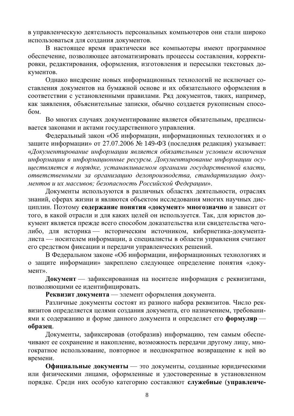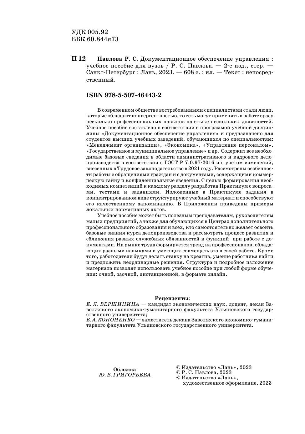В современном обществе востребованными специалистами стали люди, которые обладают конвергентностью, то есть могут применять в работе сразу несколько профессиональных навыков на стыке нескольких должностей. Учебное пособие составлено в соответствии с программой учебной дисциплины «Документационное обеспечение управления» и предназначено для студентов высших учебных заведений, обучающихся по специальностям: «Менеджмент организации», «Экономика», «Управление персоналом», «Государственное и муниципальное управление» и др. Содержит все необходимые базовые сведения в области административного и кадрового делопроизводства в соответствии с ГОСТ Р 7.0.972016 и с учетом изменений, внесенных в Трудовое законодательство в 2021 году. Рассмотрены особенности работы с обращениями граждан и с документами, содержащими коммерческую тайну и конфиденциальные сведения. С целью формирования необходимых компетенций к каждому разделу разработан Практикум с вопросами, тестами и заданиями. Изложенные в Практикуме задания в концентрированном виде структурируют учебный материал и способствуют его качественному запоминанию. В Приложении приведены примеры локальных нормативных актов. Учебное пособие может быть полезным преподавателям, руководителям малых предприятий, а также для обучающихся в Центрах дополнительного профессионального образования и всех, кто самостоятельно желает освоить базовые знания курса делопроизводства и рассмотреть процесс развития и сближения разных служебных обязанностей и функций при работе с документами. На рынке труда формируется тренд на профессионалов, обладающих разными навыками и умеющих совмещать это в своей работе. Кроме того, работодатели будут делать ставку на креатив, умение работника найти и предложить неординарные решения. Структура и подробное изложение материала позволят использовать учебное пособие при любой форме обучения: очной, заочной, дистанционной, в формате онлайн.