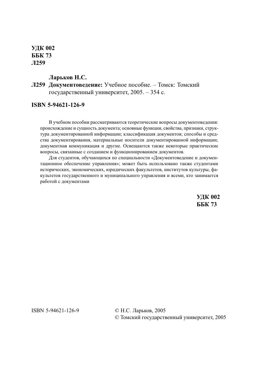 В учебном пособии рассматриваются теоретические вопросы документоведения: происхождение и сущность документа, основные функции, свойства, признаки, структура документированной информации, классификация документов, способы и средства документирования, материальные носители документированной информации, документная коммуникация и другие. Освещаются также некоторые практические вопросы, связанные с созданием и функционированием документов. Для студентов, обучающихся по специальности «Документоведение и документационное обеспечение управления», может быть использовано также студентами исторических, экономических, юридических факультетов, институтов культуры, факультетов государственного и муниципального управления и всеми, кто занимается работой с документами