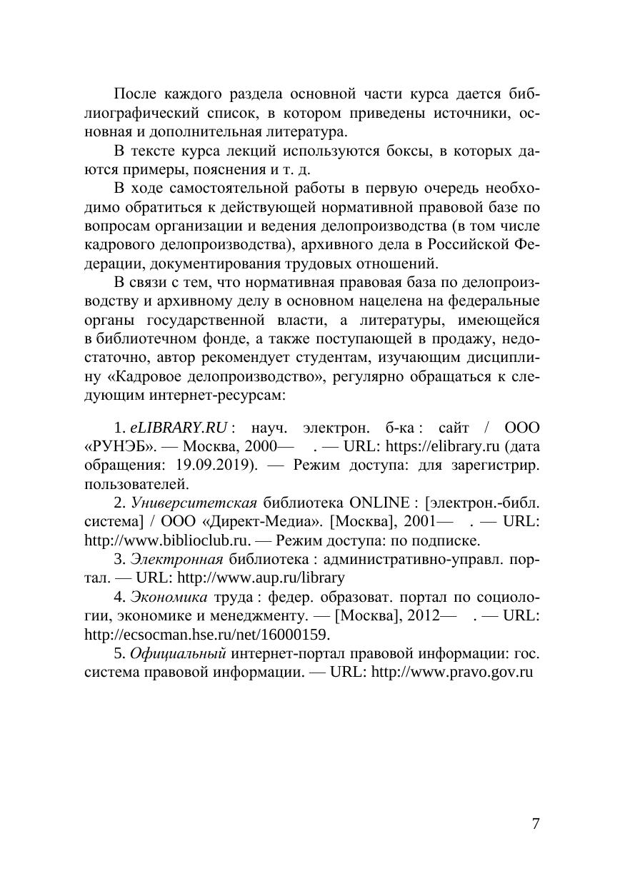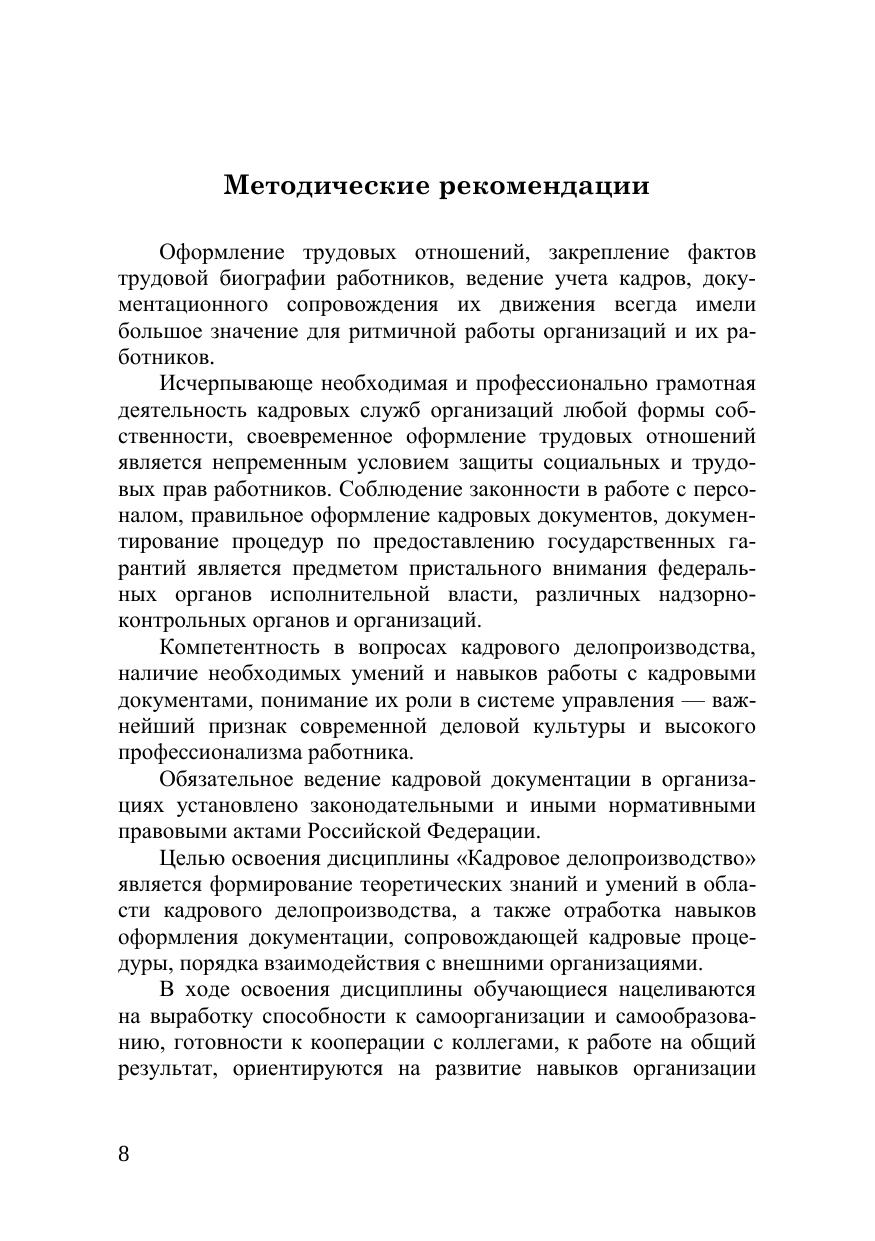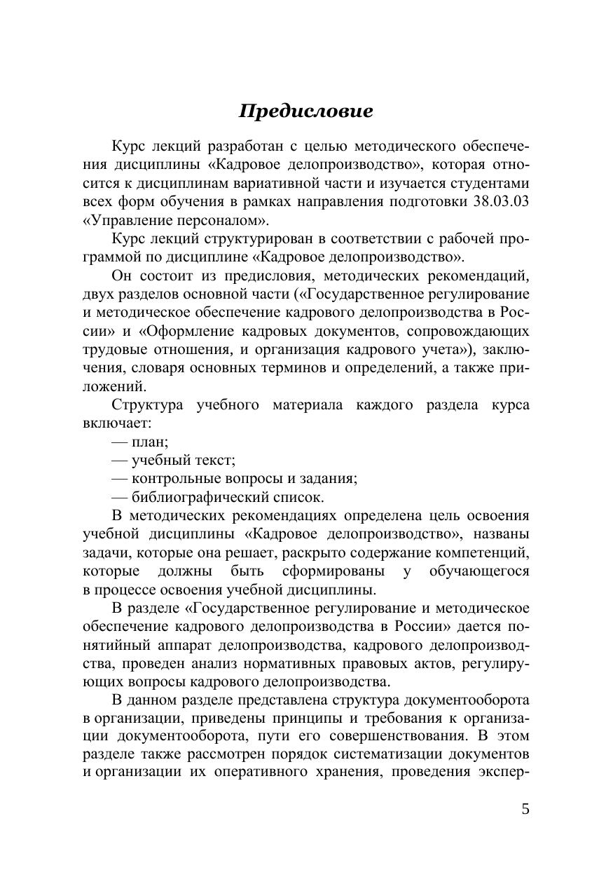 Подготовлен с целью методического обеспечения дисциплины «Кадровое делопроизводство», которая относится к дисциплинам вариативной части и изучается студентами всех форм обучения в рамках направления подготовки 38.03.03 «Управление персоналом». Данный курс лекций может быть полезен специалистам делопроизвод-ственных и кадровых служб, а также руководителям организаций и их струк-турных подразделений, другим практическим работникам.