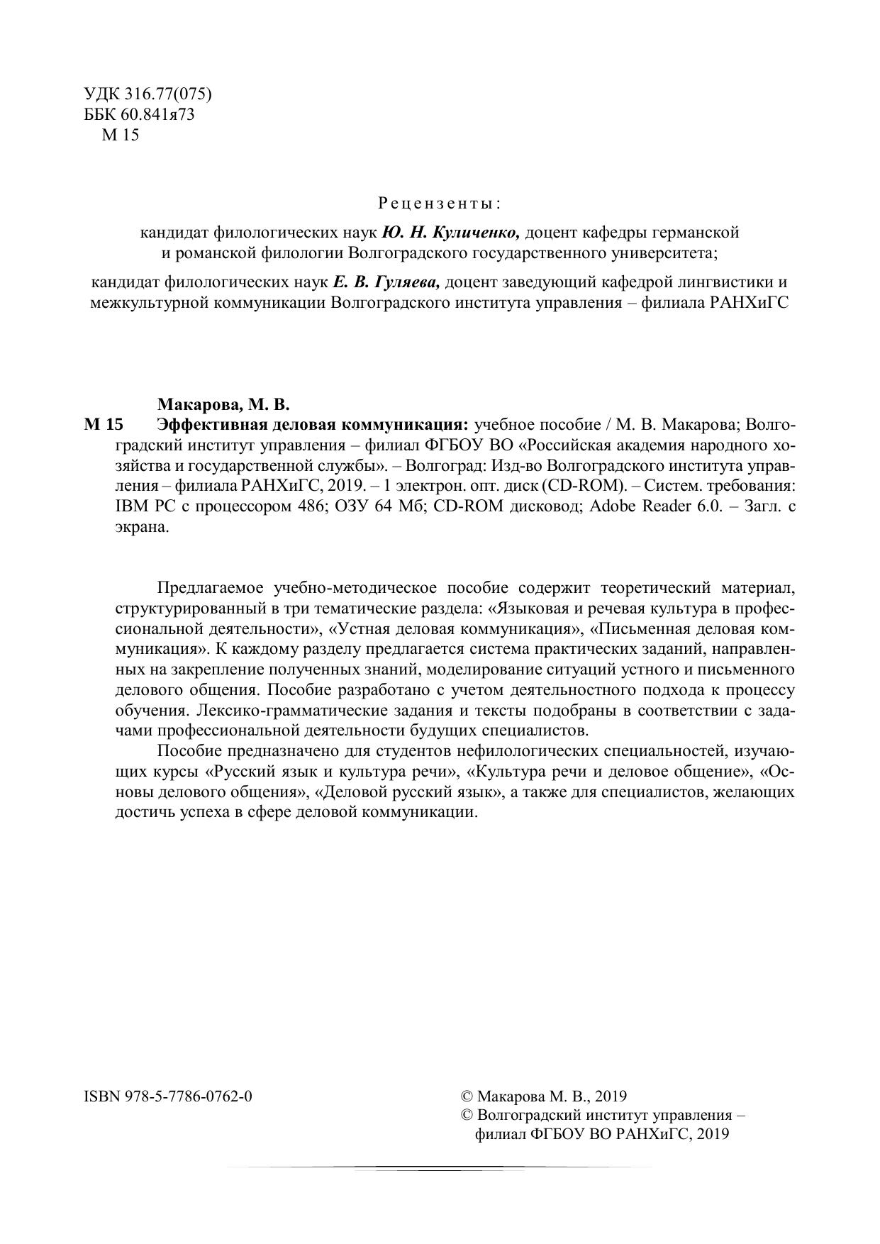 Предлагаемое учебно-методическое пособие содержит теоретический материал, структурированный в три тематические раздела: «Языковая и речевая культура в профес-сиональной деятельности», «Устная деловая коммуникация», «Письменная деловая ком-муникация». К каждому разделу предлагается система практических заданий, направлен-ных на закрепление полученных знаний, моделирование ситуаций устного и письменного делового общения. Пособие разработано с учетом деятельностного подхода к процессу обучения. Лексико-грамматические задания и тексты подобраны в соответствии с зада-чами профессиональной деятельности будущих специалистов. Пособие предназначено для студентов нефилологических специальностей, изучаю-щих курсы «Русский язык и культура речи», «Культура речи и деловое общение», «Ос-новы делового общения», «Деловой русский язык», а также для специалистов, желающих достичь успеха в сфере деловой коммуникации.