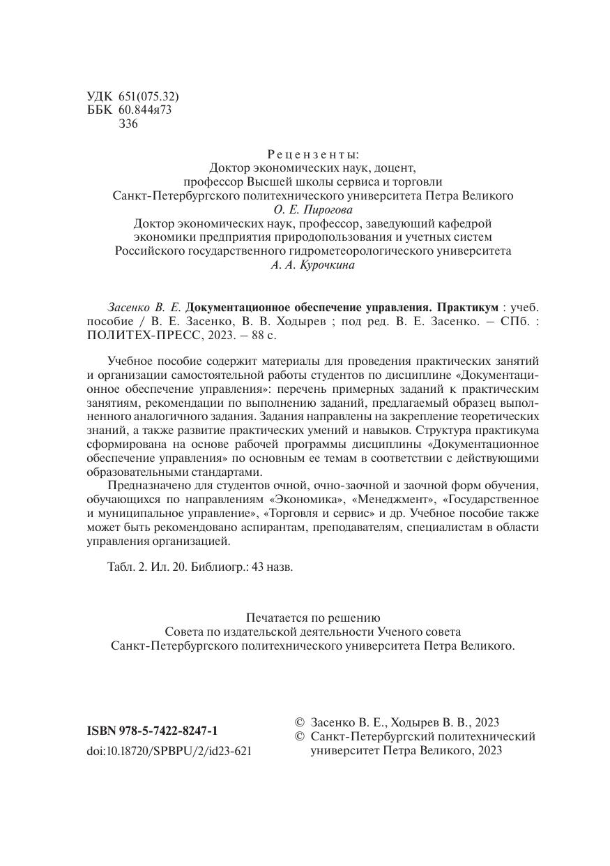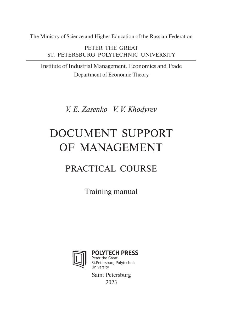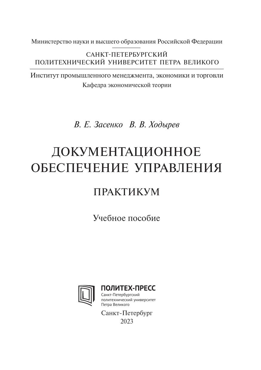 Учебное пособие содержит материалы для проведения практических занятий и организации самостоятельной работы студентов по дисциплине «Документационное обеспечение управления»: перечень примерных заданий к практическим занятиям, рекомендации по выполнению заданий, предлагаемый образец выполненного аналогичного задания. Задания направлены на закрепление теоретических знаний, а также развитие практических умений и навыков. Структура практикума сформирована на основе рабочей программы дисциплины «Документационное обеспечение управления» по основным ее темам в соответствии с действующими образовательными стандартами. Предназначено для студентов очной, очно-заочной и заочной форм обучения, обучающихся по направлениям «Экономика», «Менеджмент», «Государственное и муниципальное управление», «Торговля и сервис» и др. Учебное пособие также может быть рекомендовано аспирантам, преподавателям, специалистам в области управления организацией.