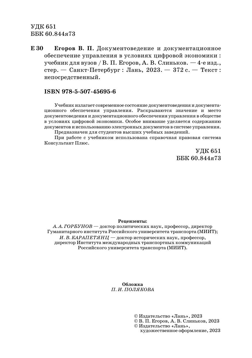 Учебник излагает современное состояние документоведения и документаци-онного обеспечения управления. Раскрываются значение и место документоведения и документационного обеспечения управления в обществе в условиях цифровой экономики. Особое внимание уделяется содержанию документов и использованию электронных документов в системе управления. При работе с учебником использована справочная правовая система Консультант Плюс.