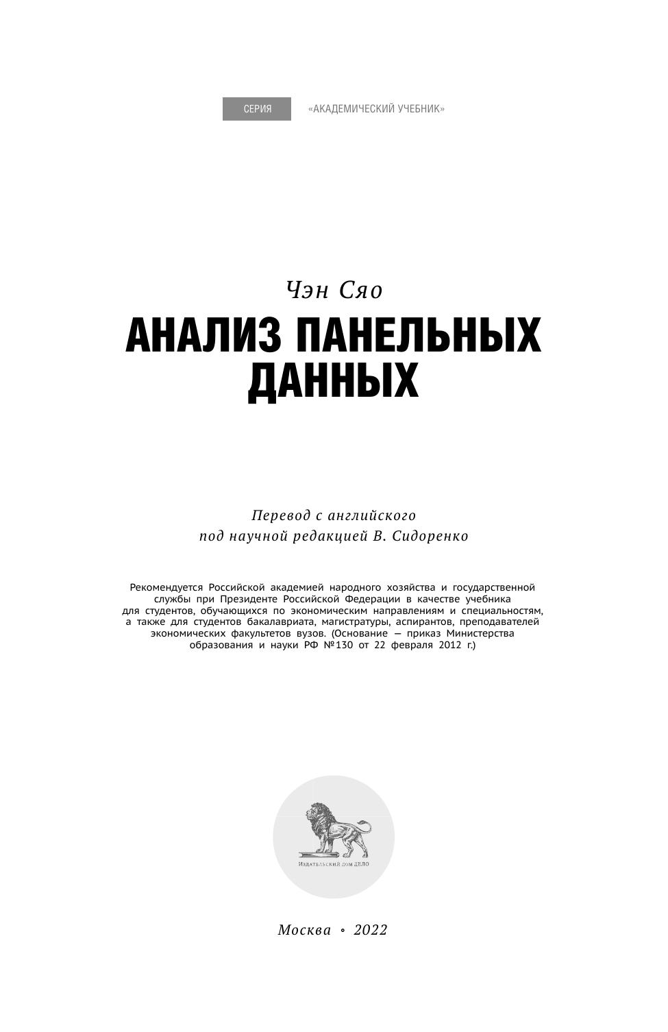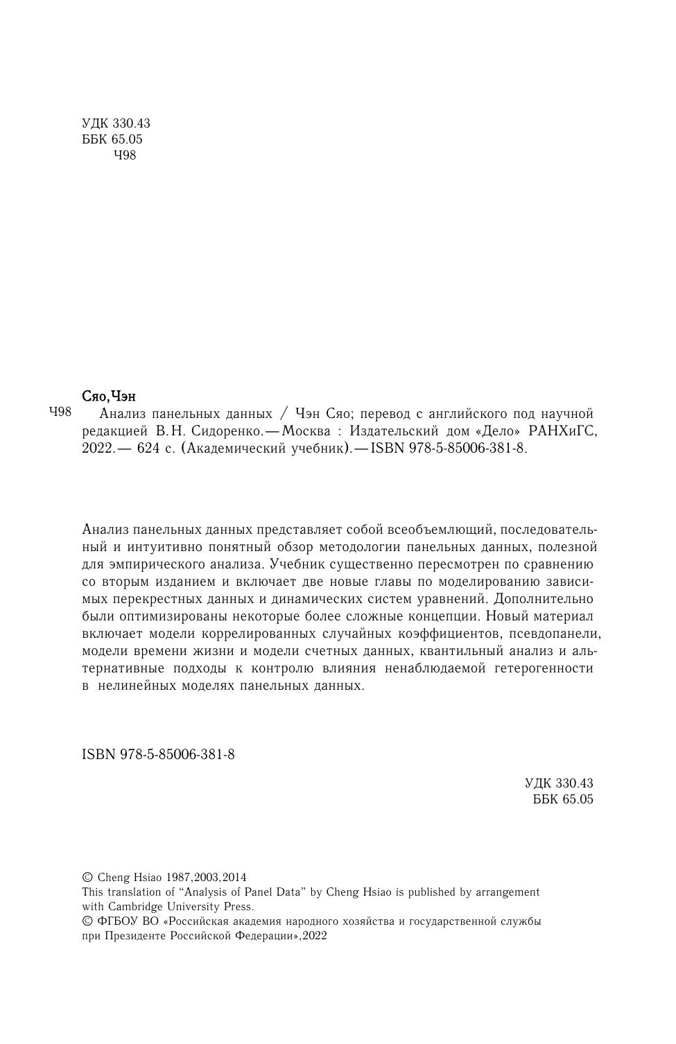 Анализ панельных данных представляет собой всеобъемлющий, последовательный и интуитивно понятный обзор методологии панельных данных, полезных для эмпирического анализа. Учебник существенно пересмотрен по сравнению со вторым изданием и включает две новые главы по моделированию зависимых перекрестных данных и динамических систем уравнений. Дополнительно были оптимизированы некоторые более сложные концепции. Новый материал включает модели коррелированных случайных коэффициентов, псевдопанели, модели времени жизни и модели счетных данных, квантильный анализ и альтернативные подходы к контролю влияния ненаблюдаемой гетерогенности в нелинейных моделях панельных данных.