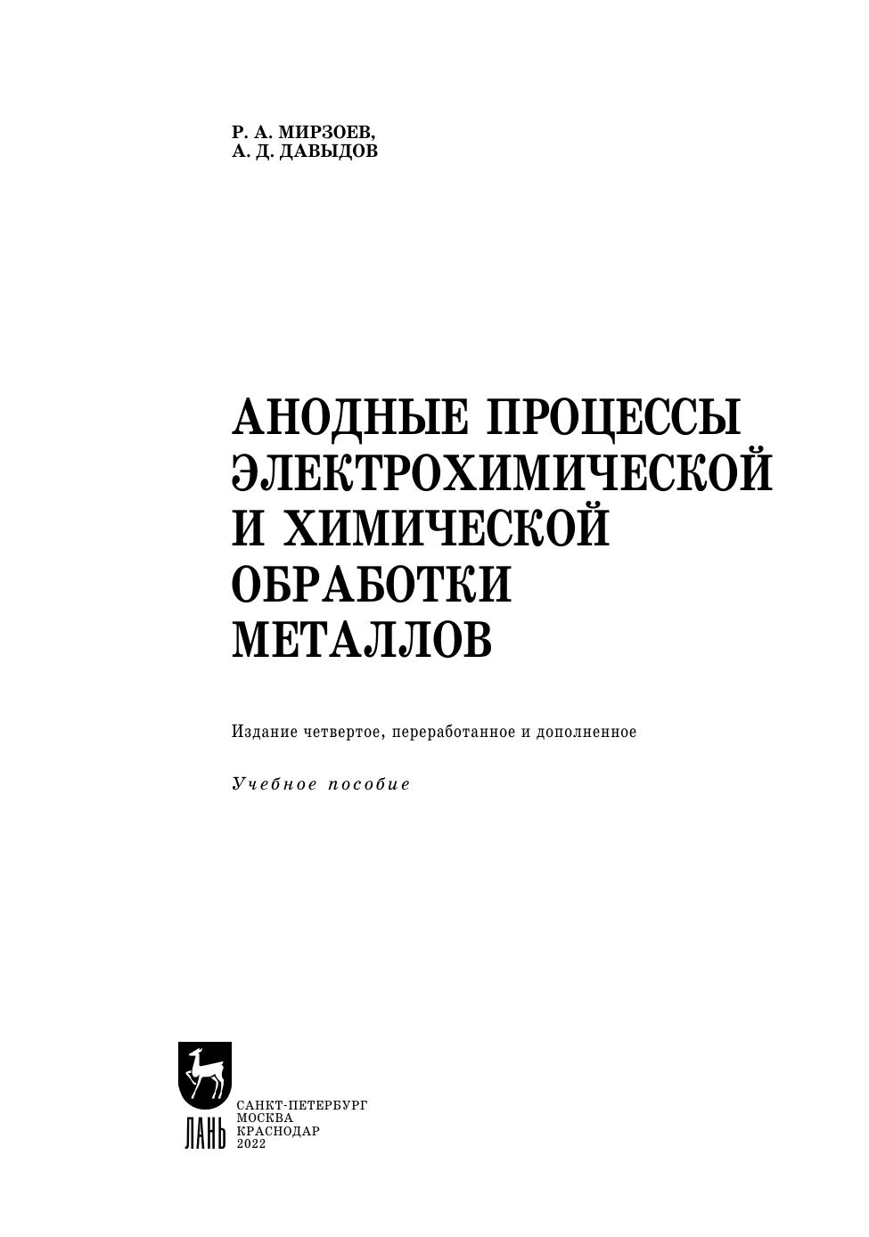 Учебное пособие посвящено анодным процессам в электрохимических и химических технологиях получения цветных металлов, обработки поверхности чёрных и цветных металлов (травление, полирование, оксидирование) и формообразования (размерная электрохимическая обработка). Рассмотрены также комбинированные процессы, в которых наряду с анодными реакциями имеют место иные механизмы воздействия на металл, например плазменно-электролитическое оксидирование и полирование, анодно-механическое и химико-механическое полирование.