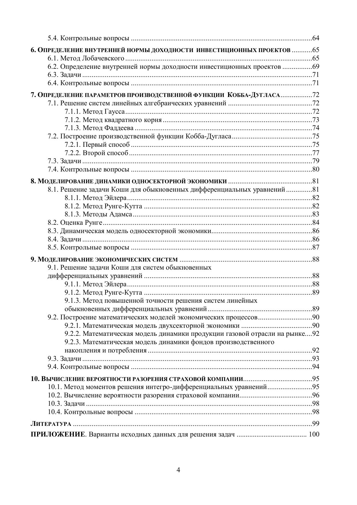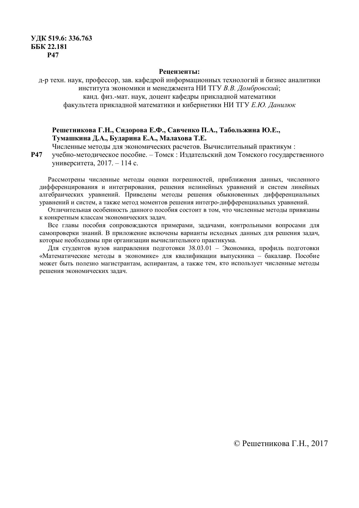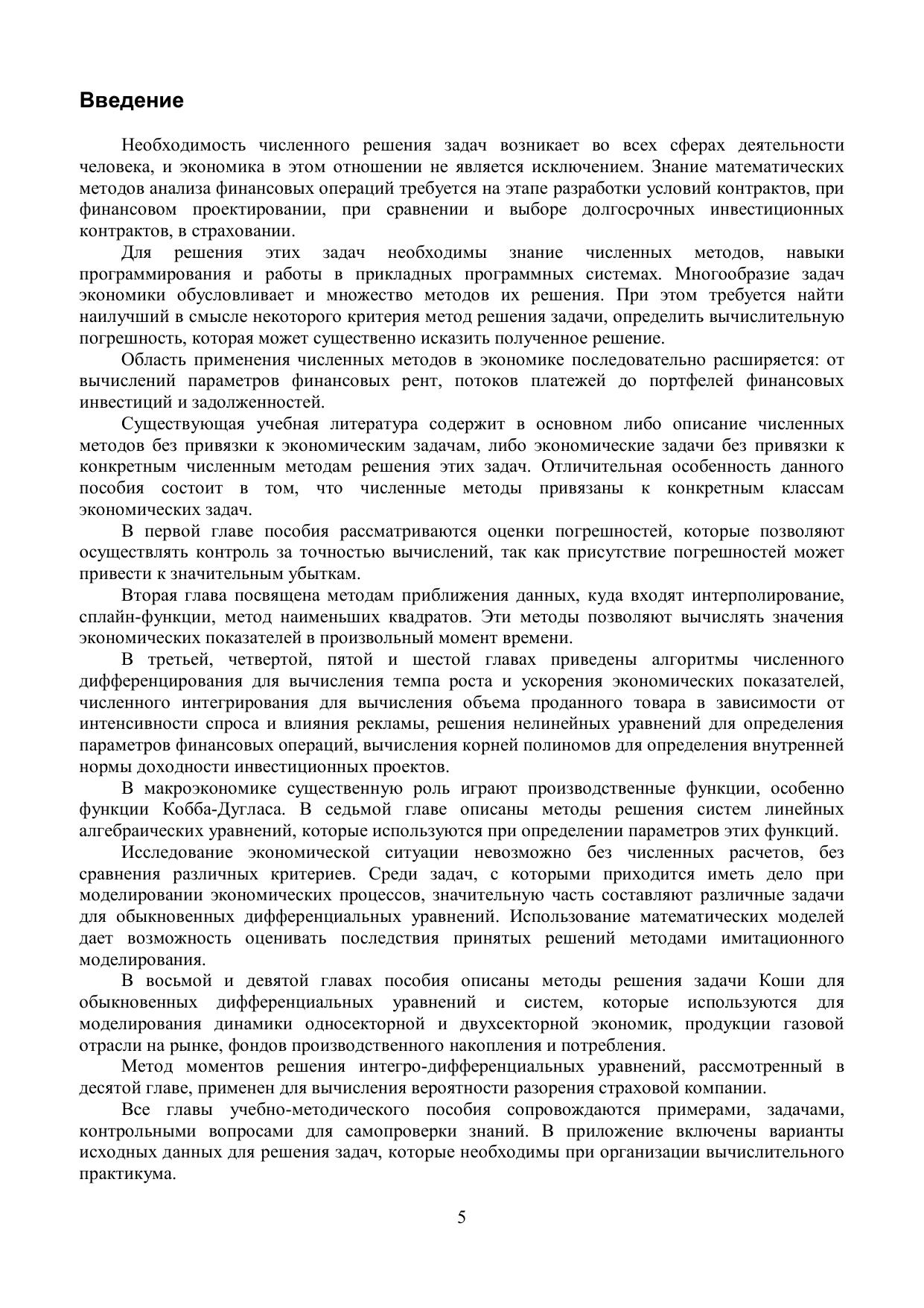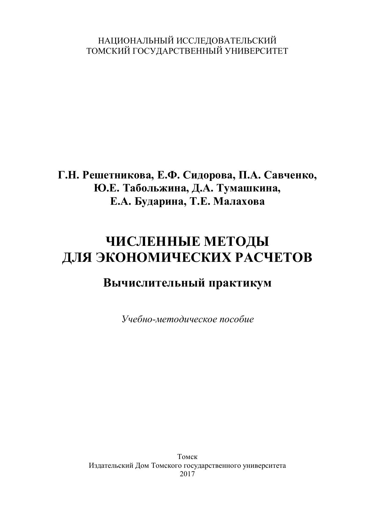 Рассмотрены численные методы оценки погрешностей, приближения данных, численного дифференцирования и интегрирования, решения нелинейных уравнений и систем линейных алгебраических уравнений. Приведены методы решения обыкновенных дифференциальных уравнений и систем, а также метод моментов решения интегро-дифференциальных уравнений. Отличительная особенность данного пособия состоит в том, что численные методы привязаны к конкретным классам экономических задач. Все главы пособия сопровождаются примерами, задачами, контрольными вопросами для самопроверки знаний. В приложение включены варианты исходных данных для решения задач, которые необходимы при организации вычислительного практикума. Для студентов вузов направления подготовки 38.03.01 – Экономика, профиль подготовки «Математические методы в экономике» для квалификации выпускника – бакалавр. Пособие может быть полезно магистрантам, аспирантам, а также тем, кто использует численные методы решения экономических задач.