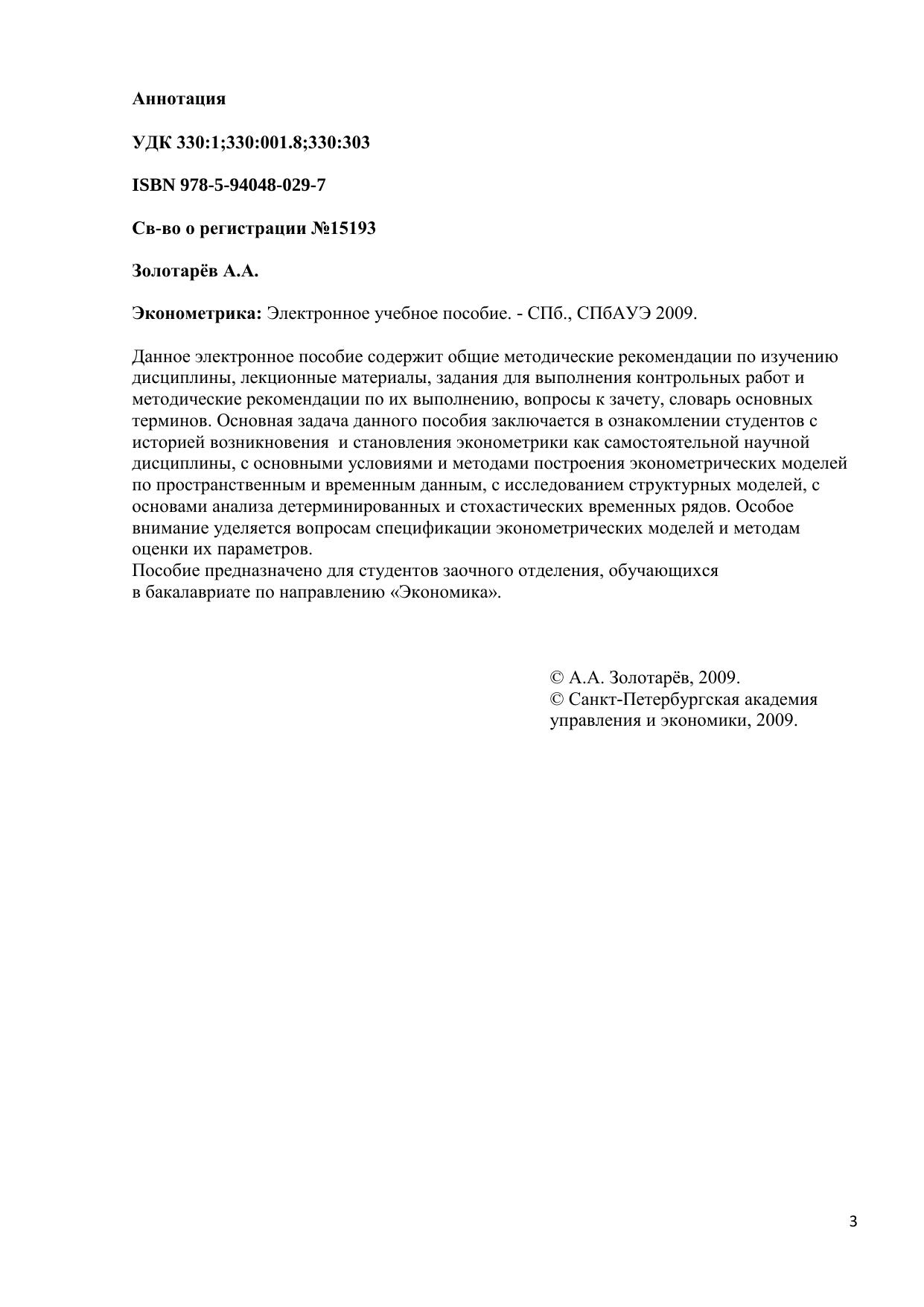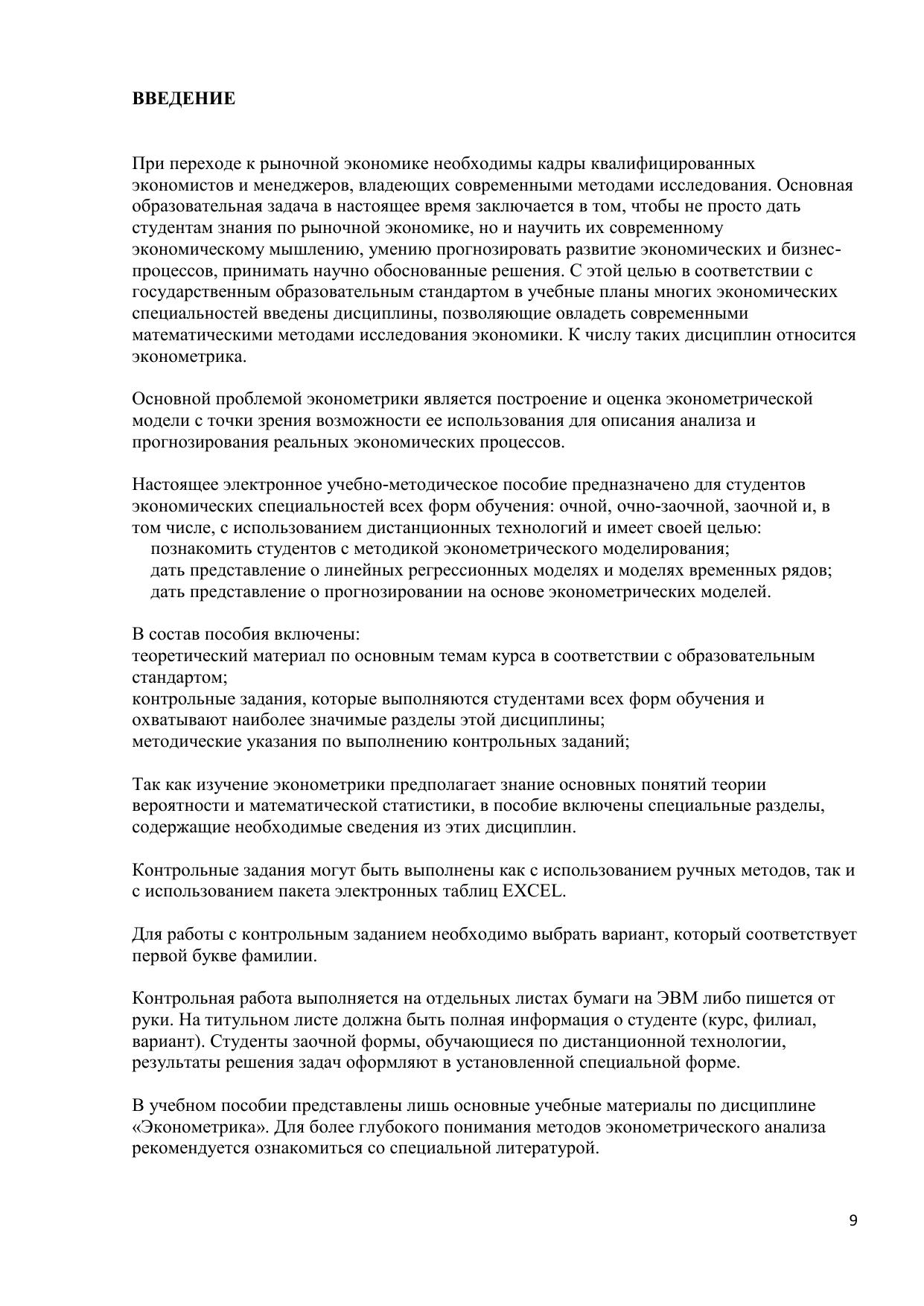 Данное электронное пособие содержит общие методические рекомендации по изучению дисциплины, лекционные материалы, задания для выполнения контрольных работ и методические рекомендации по их выполнению, вопросы к зачету, словарь основных терминов. Основная задача данного пособия заключается в ознакомлении студентов с историей возникновения и становления эконометрики как самостоятельной научной дисциплины, с основными условиями и методами построения эконометрических моделей по пространственным и временным данным, с исследованием структурных моделей, с основами анализа детерминированных и стохастических временных рядов. Особое внимание уделяется вопросам спецификации эконометрических моделей и методам оценки их параметров. Пособие предназначено для студентов заочного отделения, обучающихся в бакалавриате по направлению «Экономика». Электронное учебное пособие для дистанционного обучения