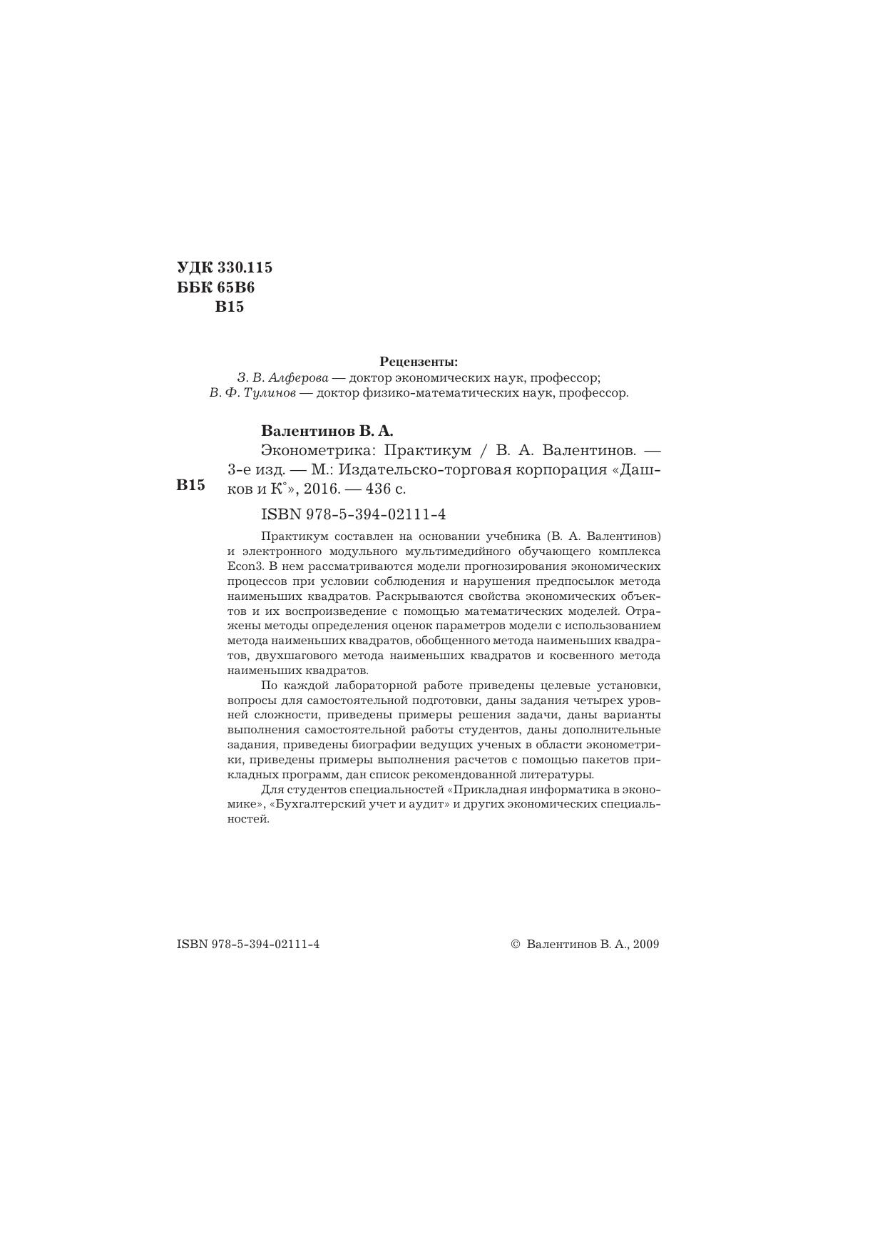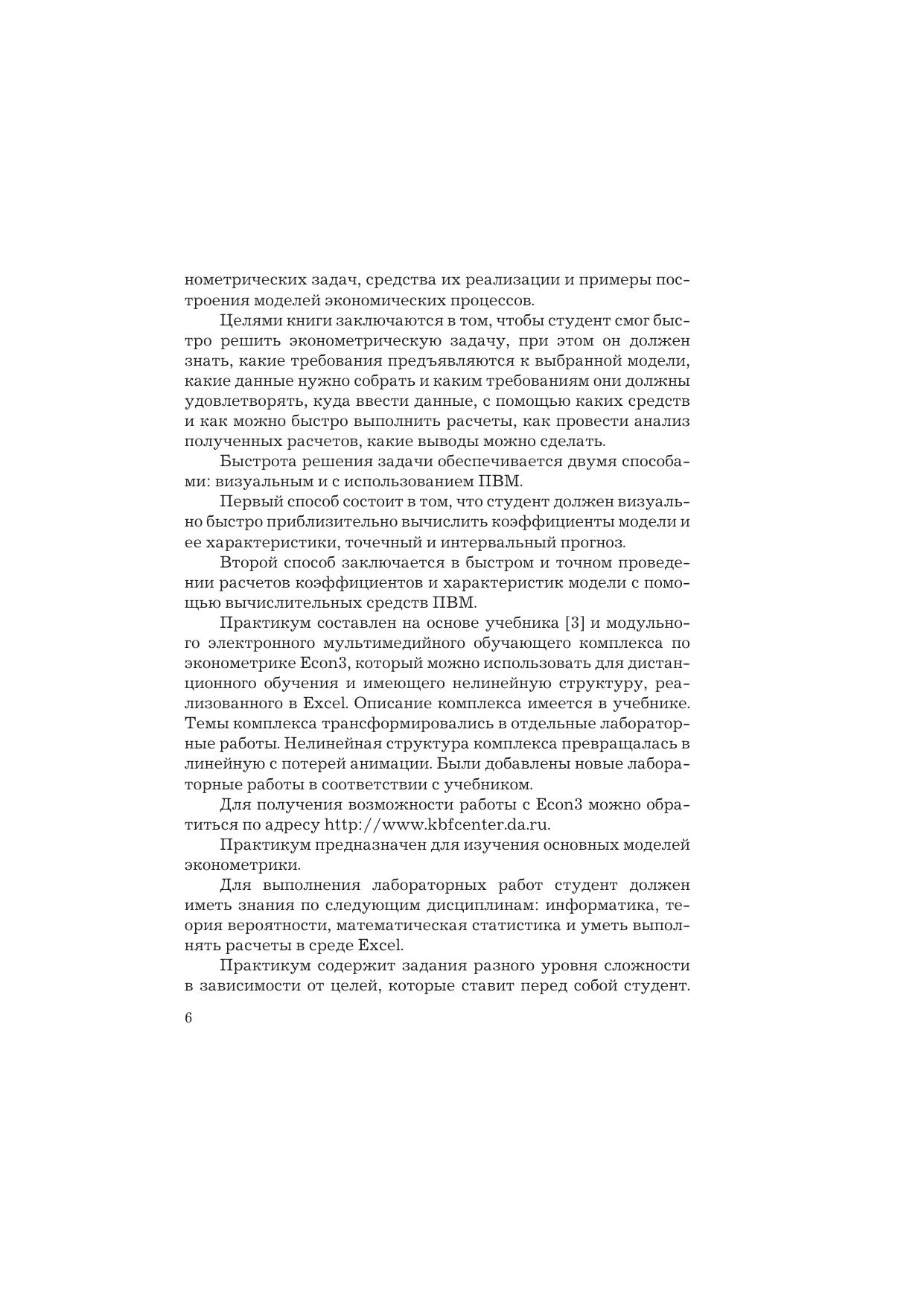 Практикум составлен на основании учебника (В.А. Валентинов) и электронного модульного мультимедийного обучающего комплекса Econ3. В нем рассматриваются модели прогнозирования экономических процессов при условии соблюдения и нарушения предпосылок метода наименьших квадратов. Раскрываются свойства экономических объектов и их воспроизведение с помощью математических моделей. Отражены методы определения оценок параметров модели с использованием метода наименьших квадратов, обобщенного метода наименьших квадратов. По каждой лабораторной работе приведены целевые установки, вопросы для самостоятельной подготовки, даны задания четырех уровней сложности, приведены примеры решения задачи, даны варианты выполнения самостоятельной работы студентов, даны дополнительные задания, приведены биографии ведущих ученых в области эконометрики, приведены примеры выполнения расчетов с помощью пакетов прикладных программ, дан список рекомендательной литературы.