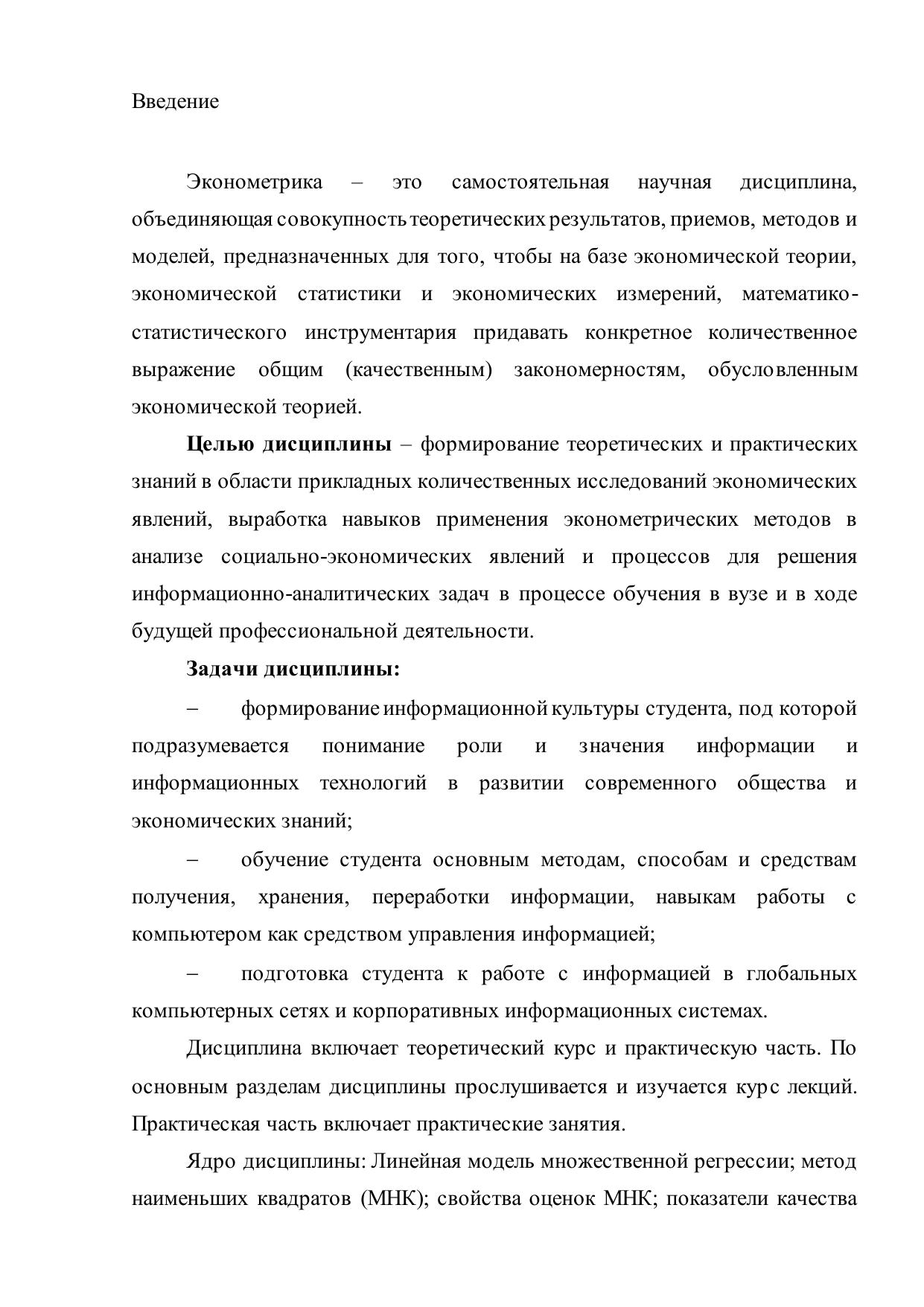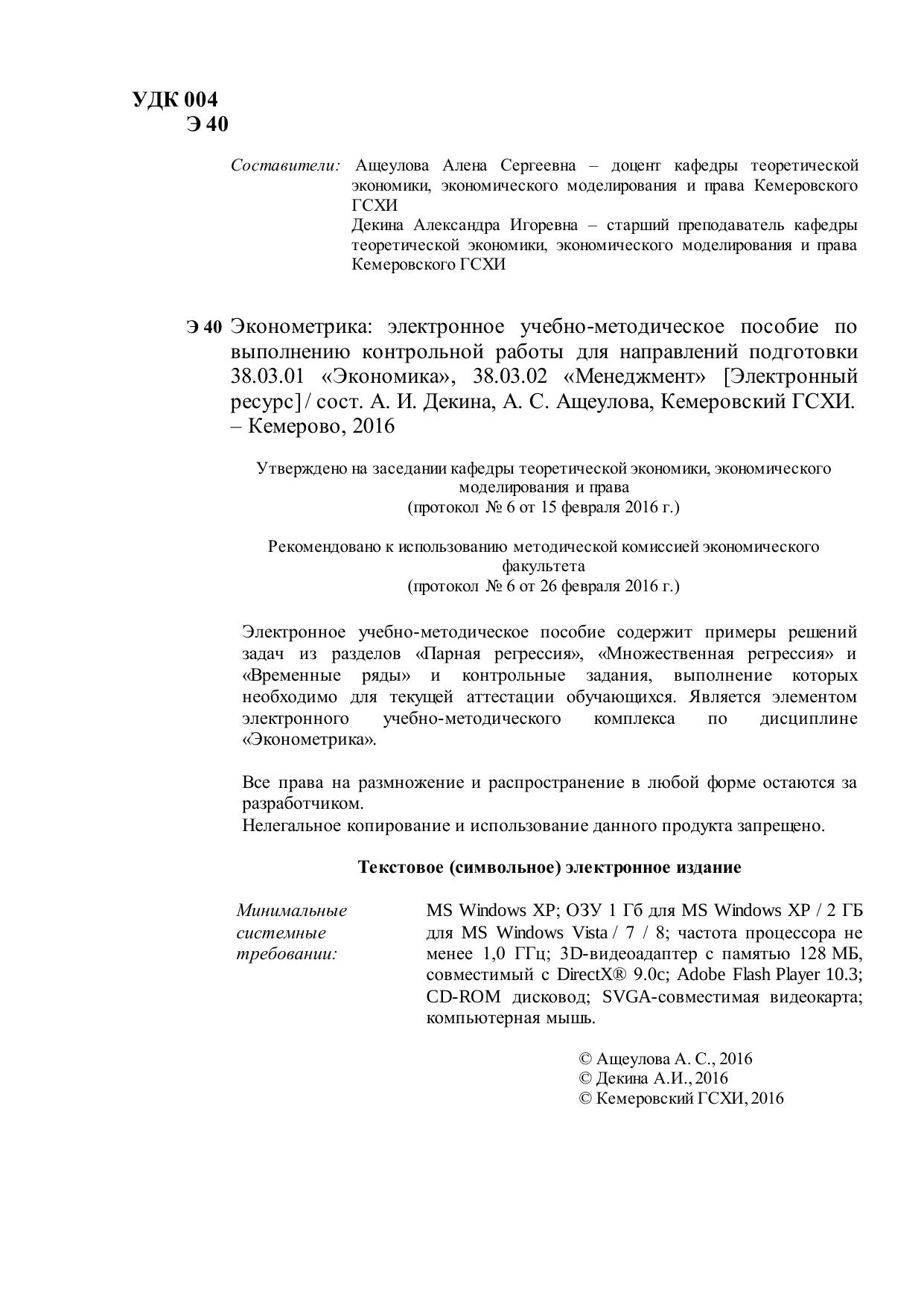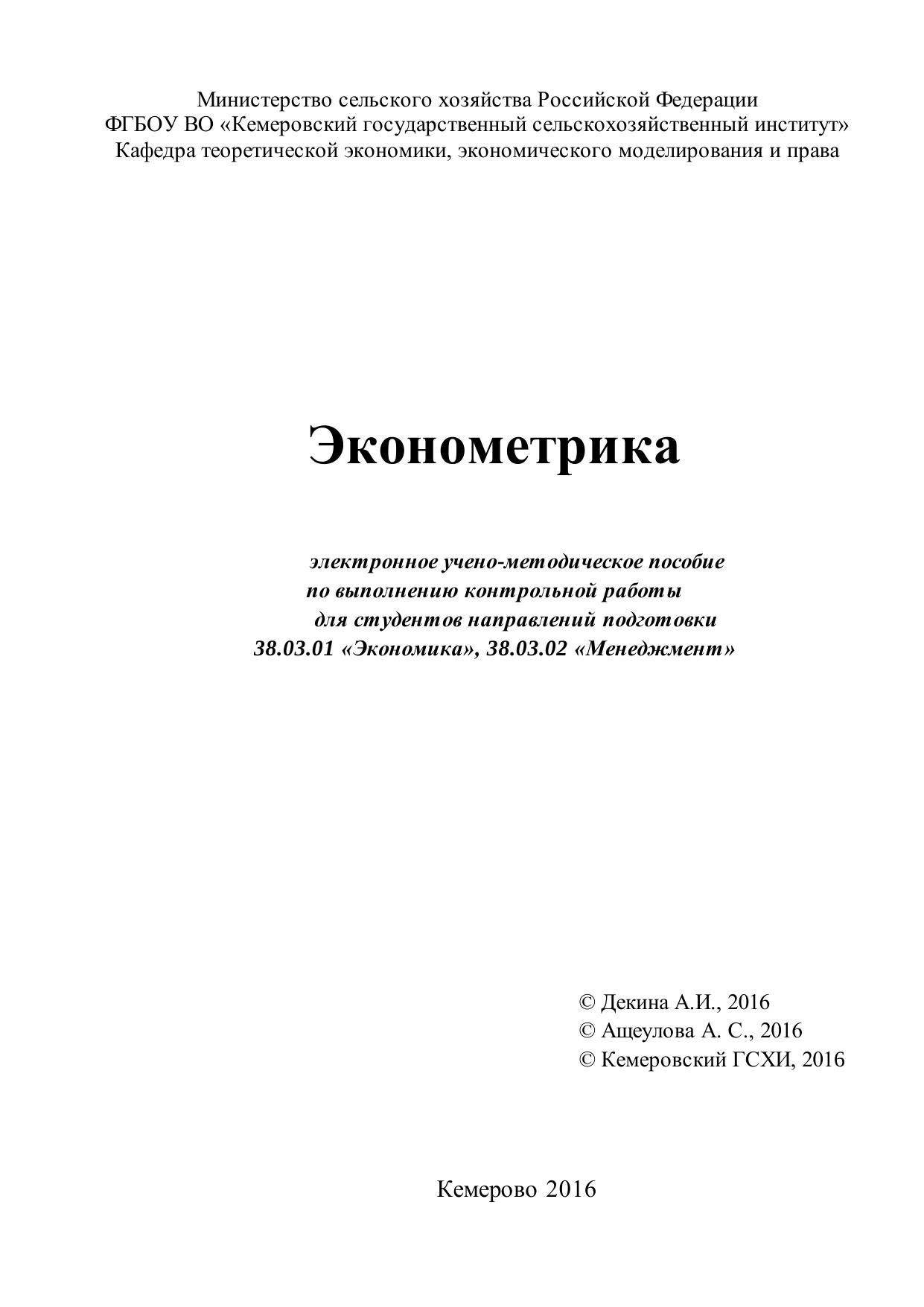 Электронное учебно-методическое пособие содержит примеры решений задач из разделов «Парная регрессия», «Множественная регрессия» и «Временные ряды» и контрольные задания, выполнение которых необходимо для текущей аттестации обучающихся. Является элементом электронного учебно-методического комплекса по дисциплине «Эконометрика». Учебно-методическое пособие по выполнению контрольной работы для направлений подготовки 38.03.01 «Экономика», 38.03.02 «Менеджмент»