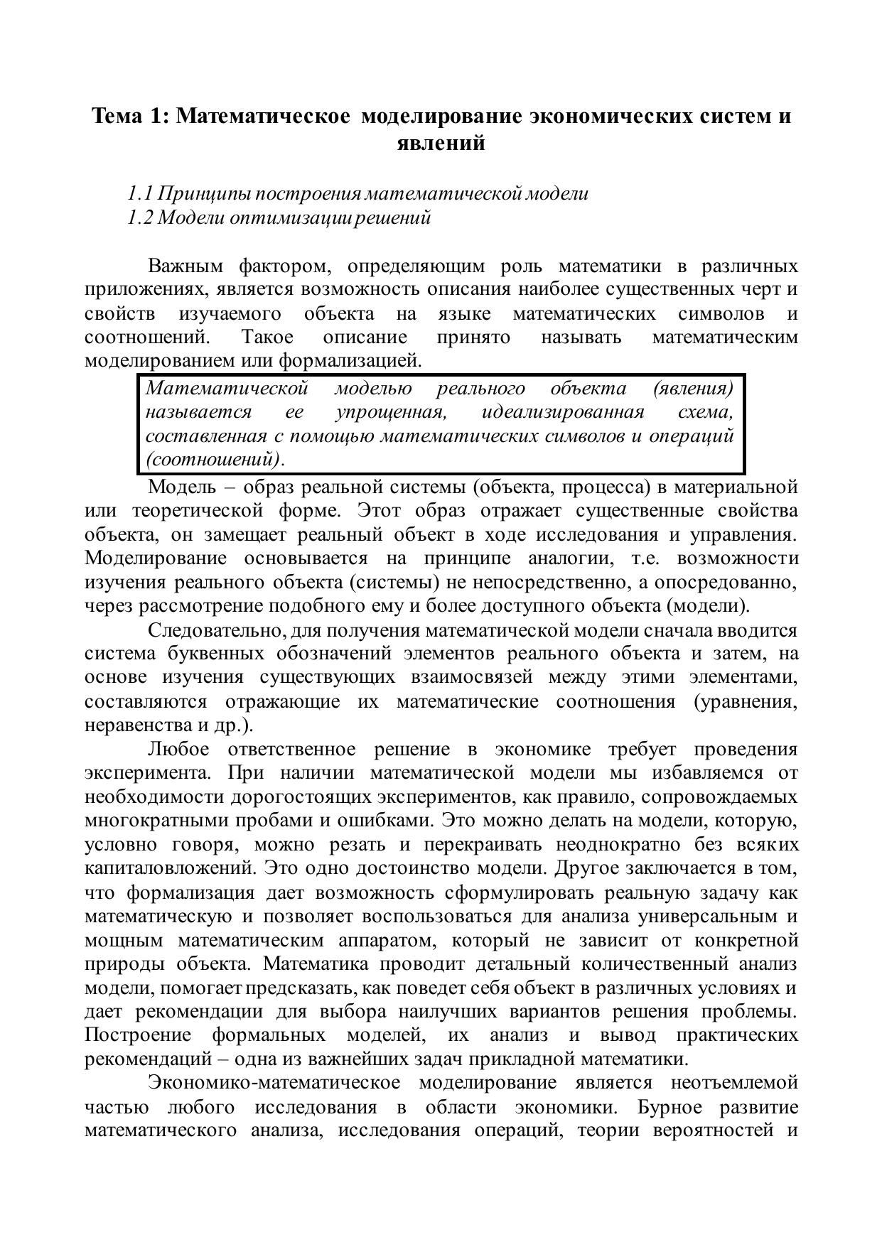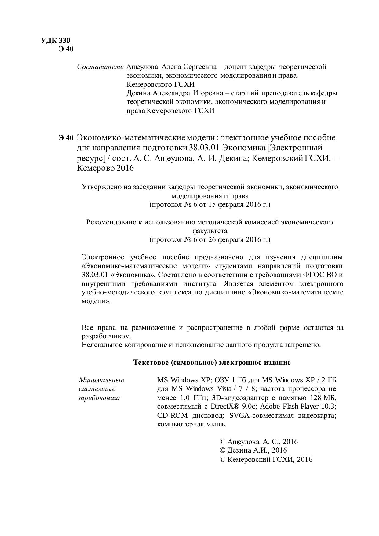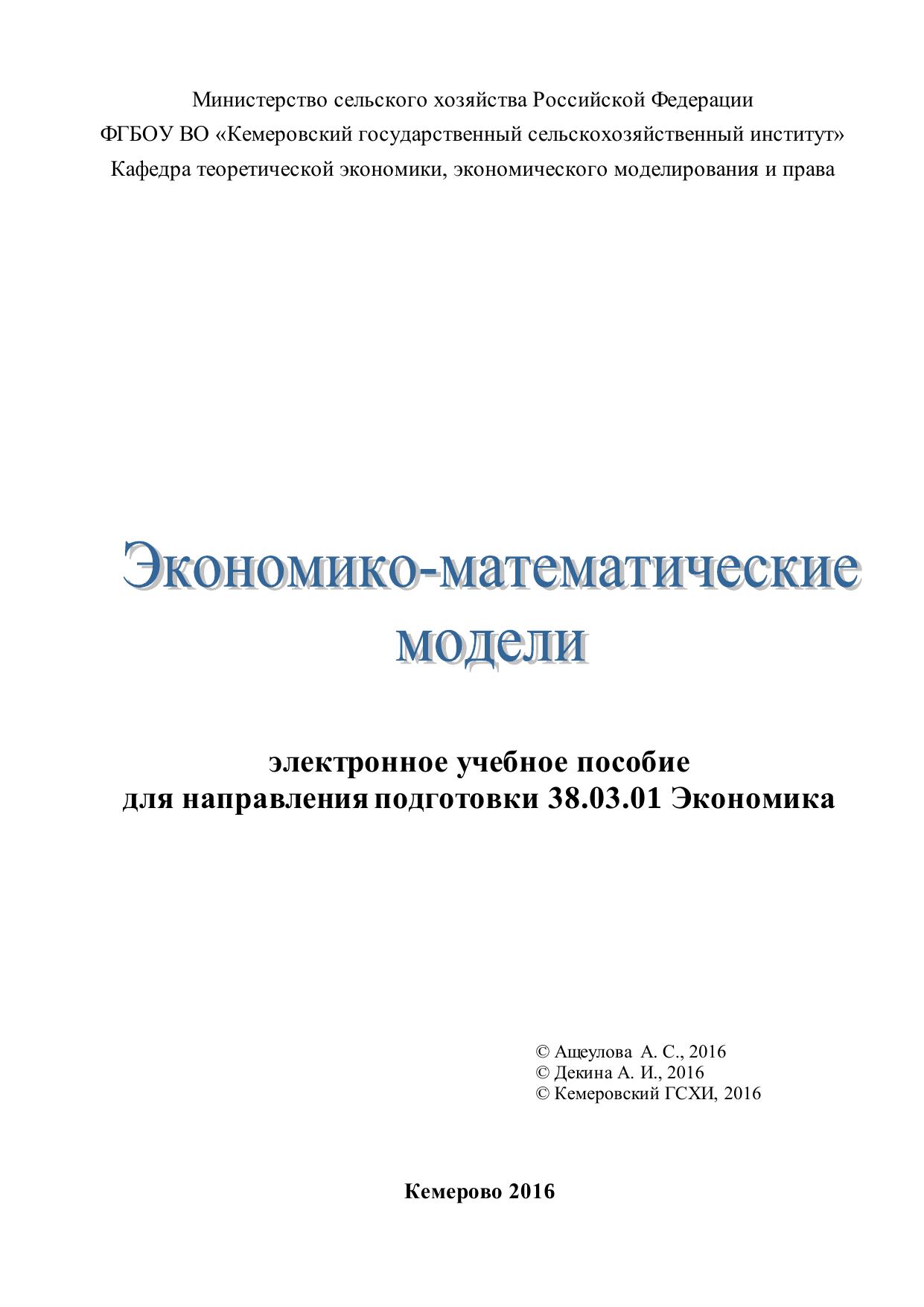 Электронное учебное пособие предназначено для изучения дисциплины «Экономико-математические модели» студентами направлений подготовки 38.03.01 «Экономика». Составлено в соответствии с требованиями ФГОС ВО и внутренними требованиями института. Является элементом электронного учебно-методического комплекса по дисциплине «Экономико-математические модели».