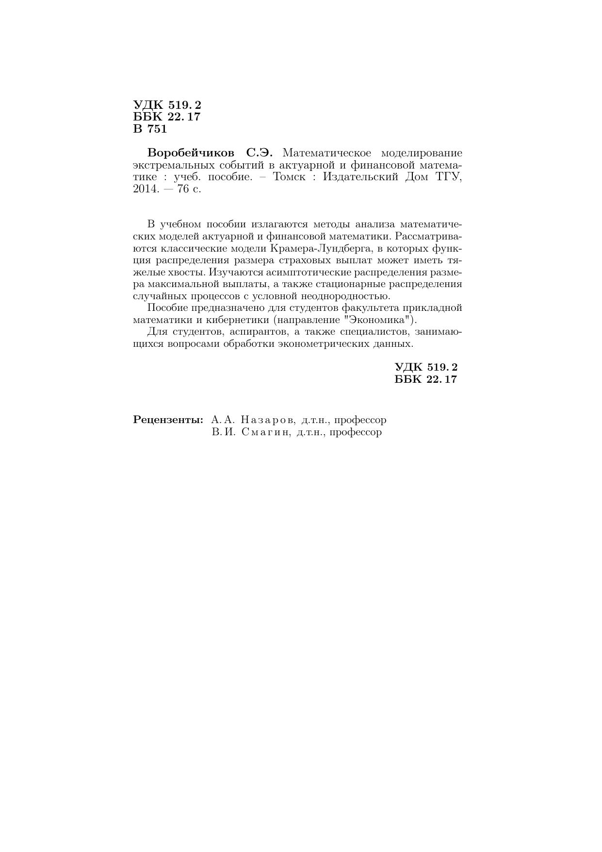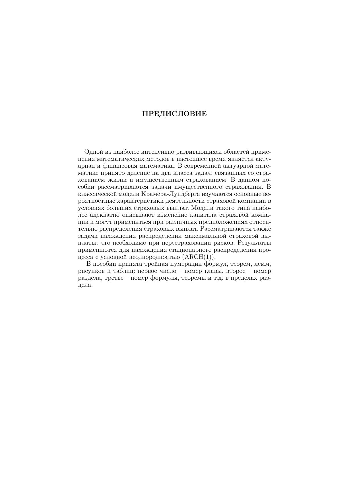В учебном пособии излагаются методы анализа математических моделей актуарной и финансовой математики. Рассматриваются классические модели Крамера-Лундберга, в которых функция распределения размера страховых выплат может иметь тяжелые хвосты. Изучаются асимптотические распределения размера максимальной выплаты, а также стационарные распределения случайных процессов с условной неоднородностью. Пособие предназначено для студентов факультета прикладной математики и кибернетики (направление "Экономика"). Для студентов, аспирантов, а также специалистов, занимающихся вопросами обработки эконометрических данных.