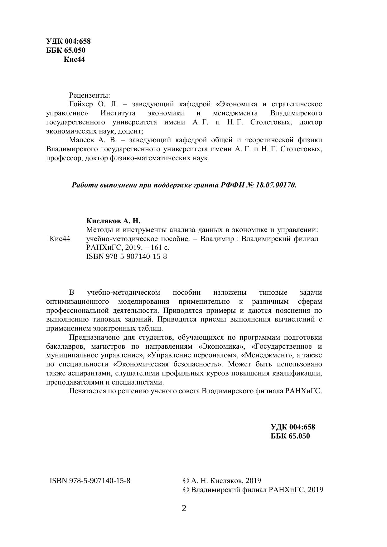 В учебно-методическом пособии изложены типовые задачи оптимизационного моделирования применительно к различным сферам профессиональной деятельности. Приводятся примеры и даются пояснения по выполнению типовых заданий. Приводятся приемы выполнения вычислений с применением электронных таблиц. Предназначено для студентов, обучающихся по программам подготовки бакалавров, магистров по направлениям «Экономика», «Государственное и муниципальное управление», «Управление персоналом», «Менеджмент», а также по специальности «Экономическая безопасность». Может быть использовано также аспирантами, слушателями профильных курсов повышения квалификации, преподавателями и специалистами. Печатается по решению ученого совета Владимирского филиала РАНХиГС.