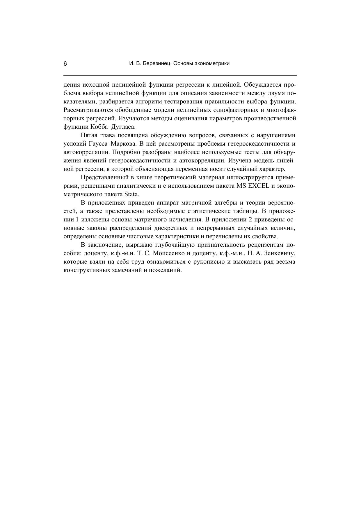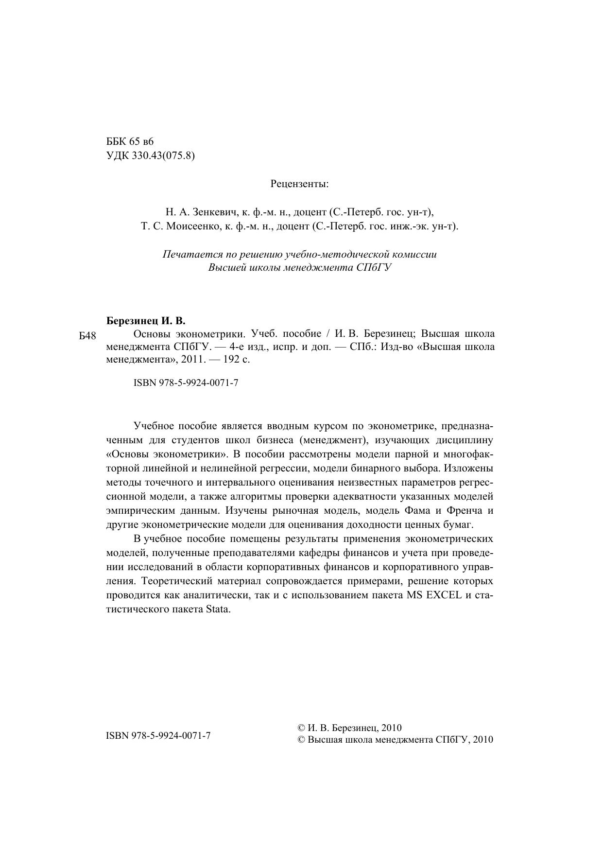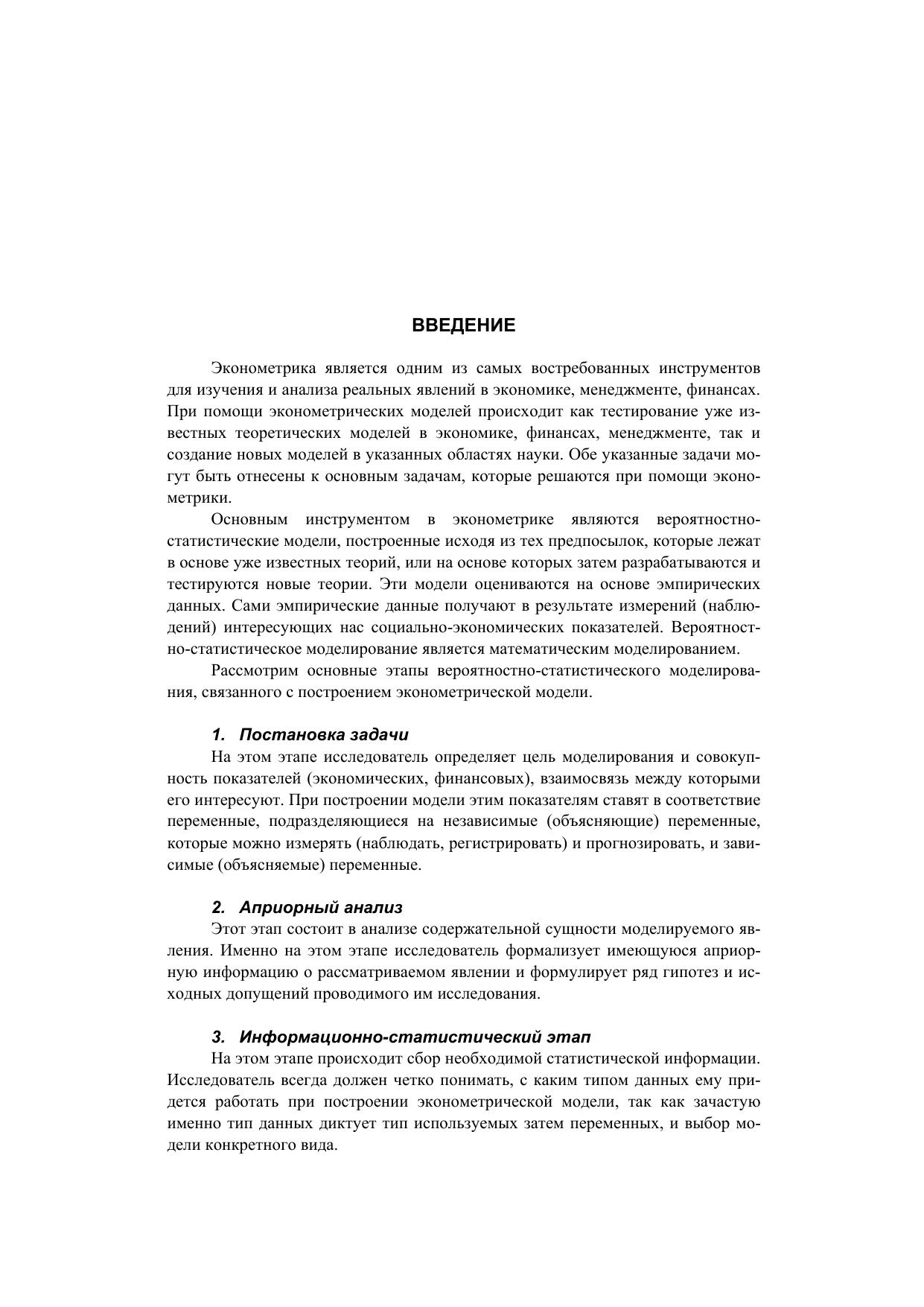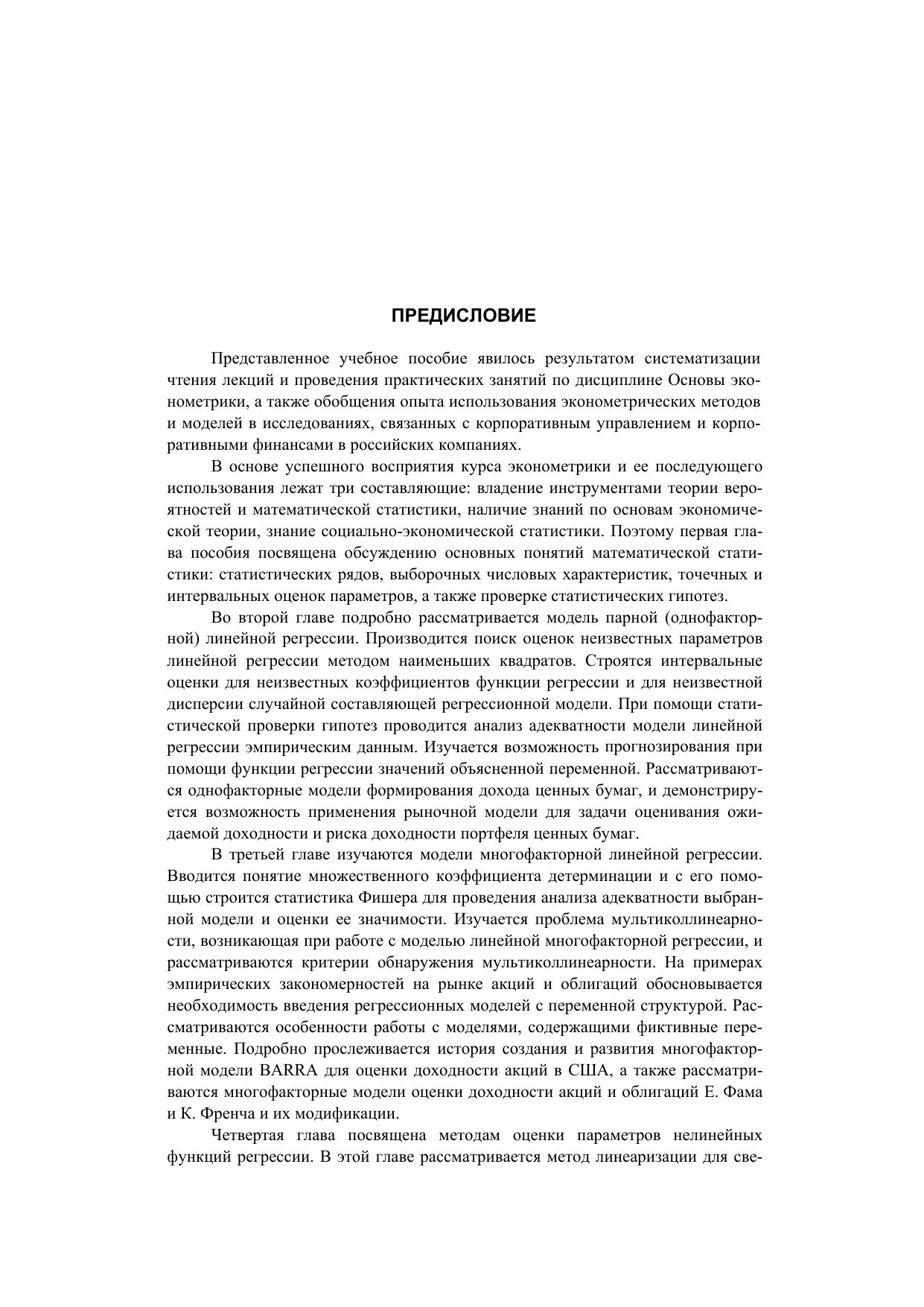 Учебное пособие является вводным курсом по эконометрике, предназначенным для студентов Высшей школы менеджмента, изучающим дисциплину «Основы эконометрики». В пособии рассмотрены модели парной и многофакторной линейной и нелинейной регрессии, модели бинарного выбора. Изложены методы точечного и интервального оценивания неизвестных параметров регрессионной модели, а также алгоритмы проверки адекватности указанных моделей эмпирическим данным. Изучены рыночная модель, модель Фама и Френча и другие эконометрические модели для оценивания доходности ценных бумаг. В учебное пособие помещены результаты применения эконометрических моделей, полученные преподавателями кафедры финансов и учета при проведении исследований в области корпоративных финансов и корпоративного управления. Теоретический материал сопровождается примерами, решение которых проводится как аналитически, так и с использованием пакета MS EXCEL и эконометрического пакета Stata.