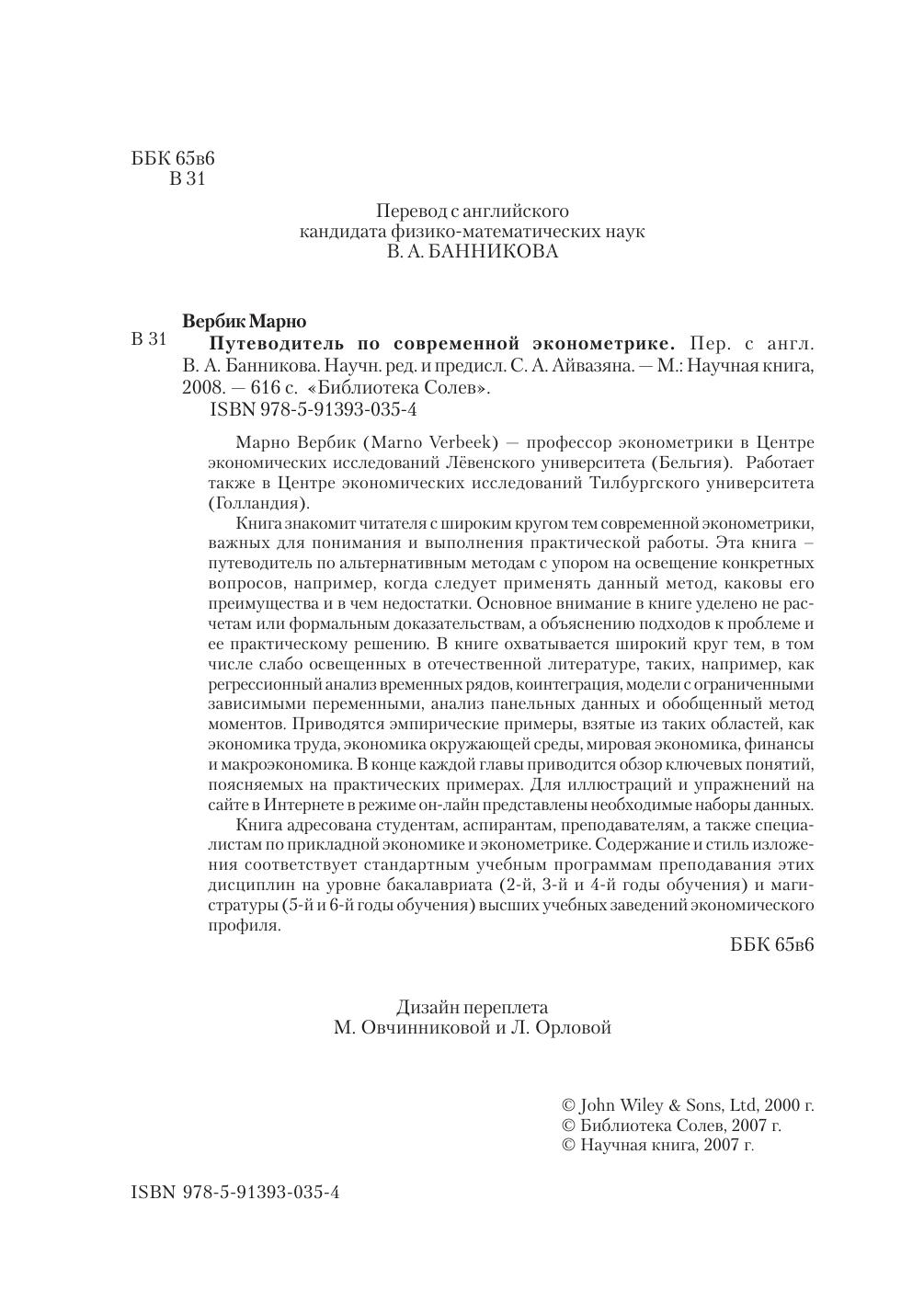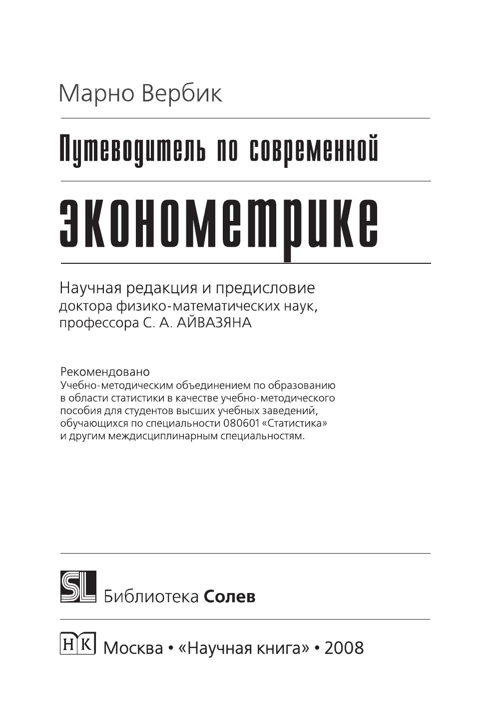Марно Вербик (Marno Verbeek) — профессор эконометрики в Центре экономических исследований Лёвенского университета (Бельгия). Работает также в Центре экономических исследований Тилбургского университета (Голландия). Книга знакомит читателя с широким кругом тем современной эконометрики, важных для понимания и выполнения практической работы. Эта книга – путеводитель по альтернативным методам с упором на освещение конкретных вопросов, например, когда следует применять данный метод, каковы его преимущества и в чем недостатки. Основное внимание в книге уделено не расчетам или формальным доказательствам, а объяснению подходов к проблеме и ее практическому решению. В книге охватывается широкий круг тем, в том числе слабо освещенных в отечественной литературе, таких, например, как регрессионный анализ временных рядов, коинтеграция, модели с ограниченными зависимыми переменными, анализ панельных данных и обобщенный метод моментов. Приводятся эмпирические примеры, взятые из таких областей, как экономика труда, экономика окружающей среды, мировая экономика, финансы и макроэкономика. В конце каждой главы приводится обзор ключевых понятий, поясняемых на практических примерах. Для иллюстраций и упражнений на сайте в Интернете в режиме он?лайн представлены необходимые наборы данных. Книга адресована студентам, аспирантам, преподавателям, а также специалистам по прикладной экономике и эконометрике. Содержание и стиль изложения соответствует стандартным учебным программам преподавания этих дисциплин на уровне бакалавриата (2?й, 3?й и 4?й годы обучения) и магистратуры (5-й и 6-й годы обучения) высших учебных заведений экономического профиля.