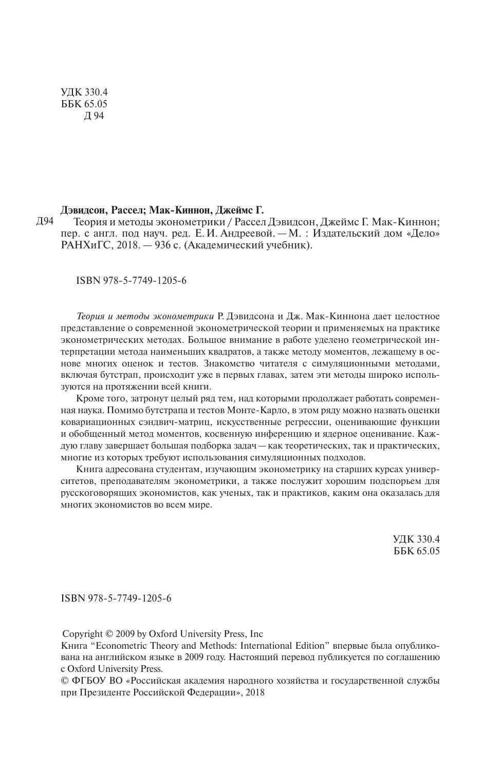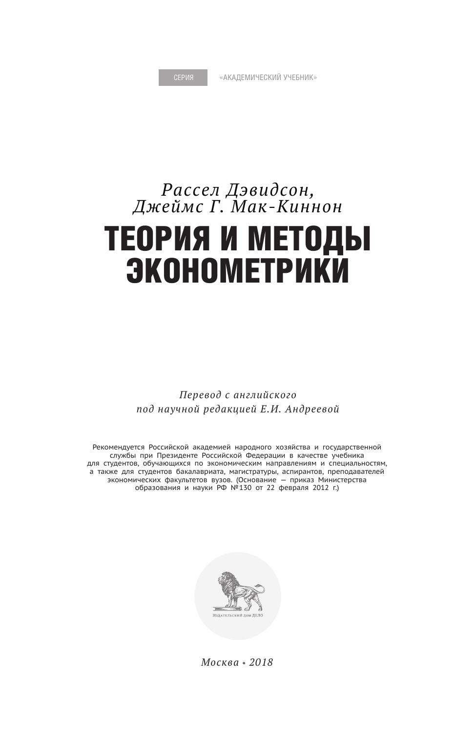 Теория и методы эконометрики Р. Дэвидсона и Дж. Мак-Киннона дает целостное представление о современной эконометрической теории и применяемых на практике эконометрических методах. Большое внимание в работе уделено геометрической интерпретации метода наименьших квадратов, а также методу моментов, лежащему в основе многих оценок и тестов. Знакомство читателя с симуляционными методами, включая бутстрап, происходит уже в первых главах, затем эти методы широко используются на протяжении всей книги. Кроме того, затронут целый ряд тем, над которыми продолжает работать современная наука. Помимо бутстрапа и тестов Монте-Карло, в этом ряду можно назвать оценки ковариационных сэндвич-матриц, искусственные регрессии, оценивающие функции и обобщенный метод моментов, косвенную инференцию и ядерное оценивание. Каждую главу завершает большая подборка задач — как теоретических, так и практических, многие из которых требуют использования симуляционных подходов. Книга адресована студентам, изучающим эконометрику на старших курсах университетов, преподавателям эконометрики, а также послужит хорошим подспорьем для русскоговорящих экономистов, как ученых, так и практиков, каким она оказалась для многих экономистов во всем мире.