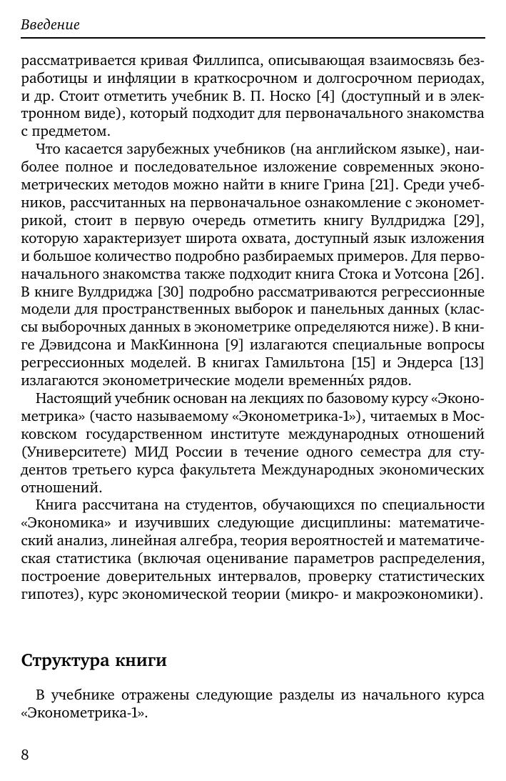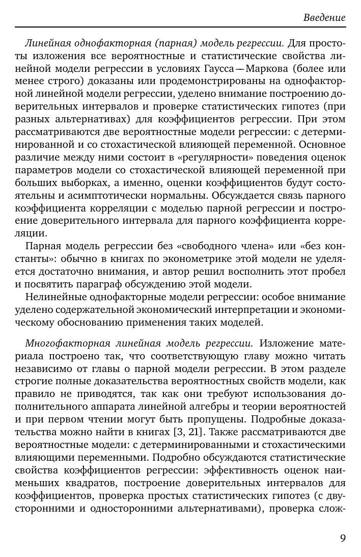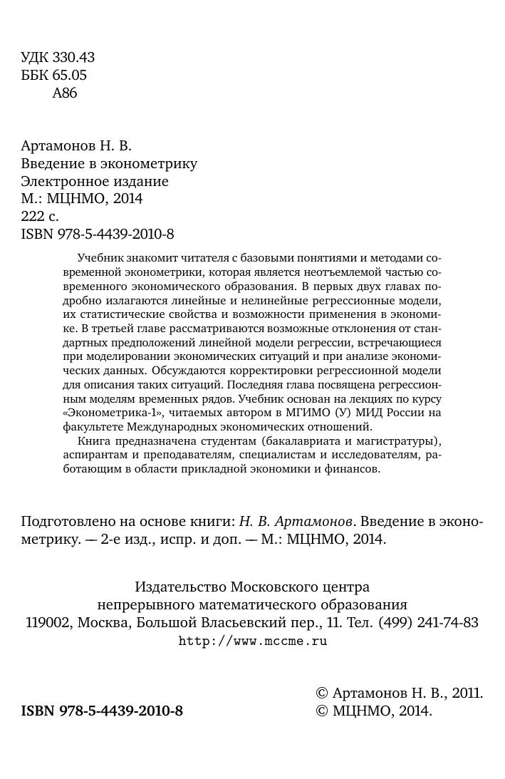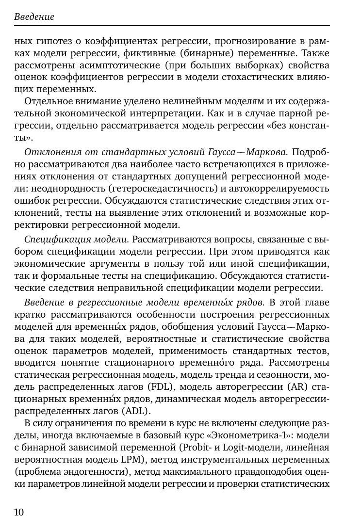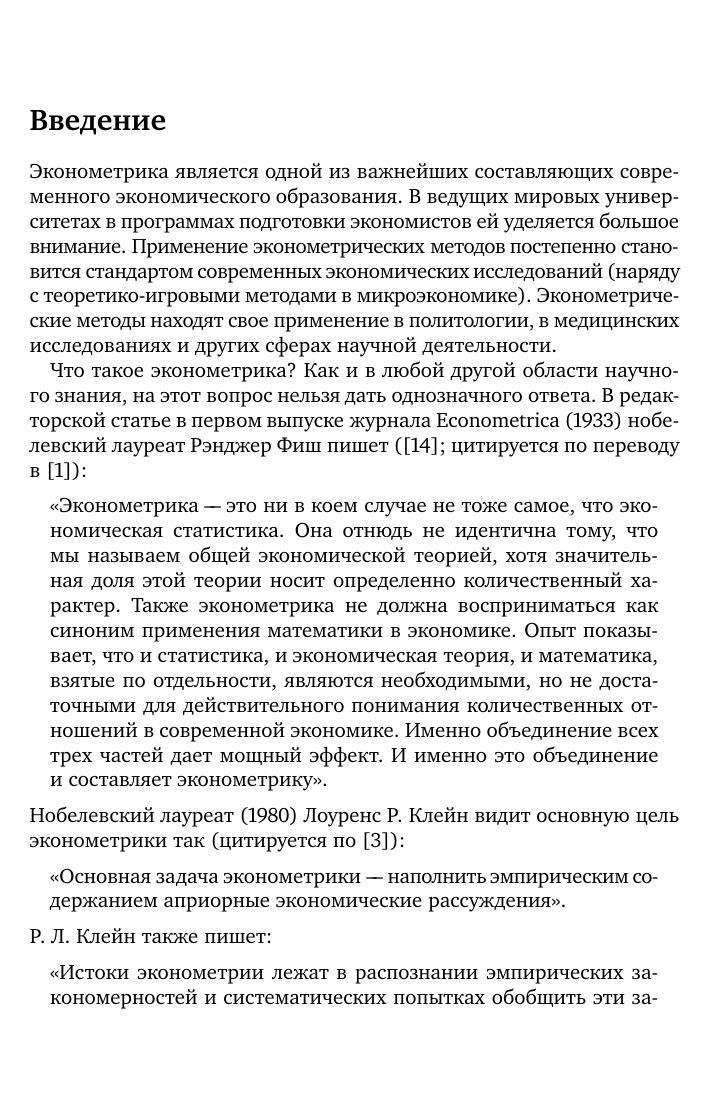 Учебник знакомит читателя с базовыми понятиями и методами современной эконометрики, которая является неотъемлемой частью современного экономического образования. В первых двух главах подробно излагаются линейные и нелинейные регрессионные модели, их статистические свойства и возможности применения в экономике. В третьей главе рассматриваютсявозможные отклонения от стандартных предположений линейной модели регрессии, встречающиеся при моделировании экономических ситуаций и при анализе экономических данных. Обсуждаются корректировки регрессионной модели для описания таких ситуаций. Последняя глава посвящена регрессионным моделям временных рядов. Учебник основан на лекциях по курсу «Эконометрика-1», читаемых автором в МГИМО (У) МИД России на факультете Международных экономических отношений. Книга предназначена студентам (бакалавриата и магистратуры), аспирантам и преподавателям, специалистам и исследователям, работающим в области прикладной экономики и финансов.