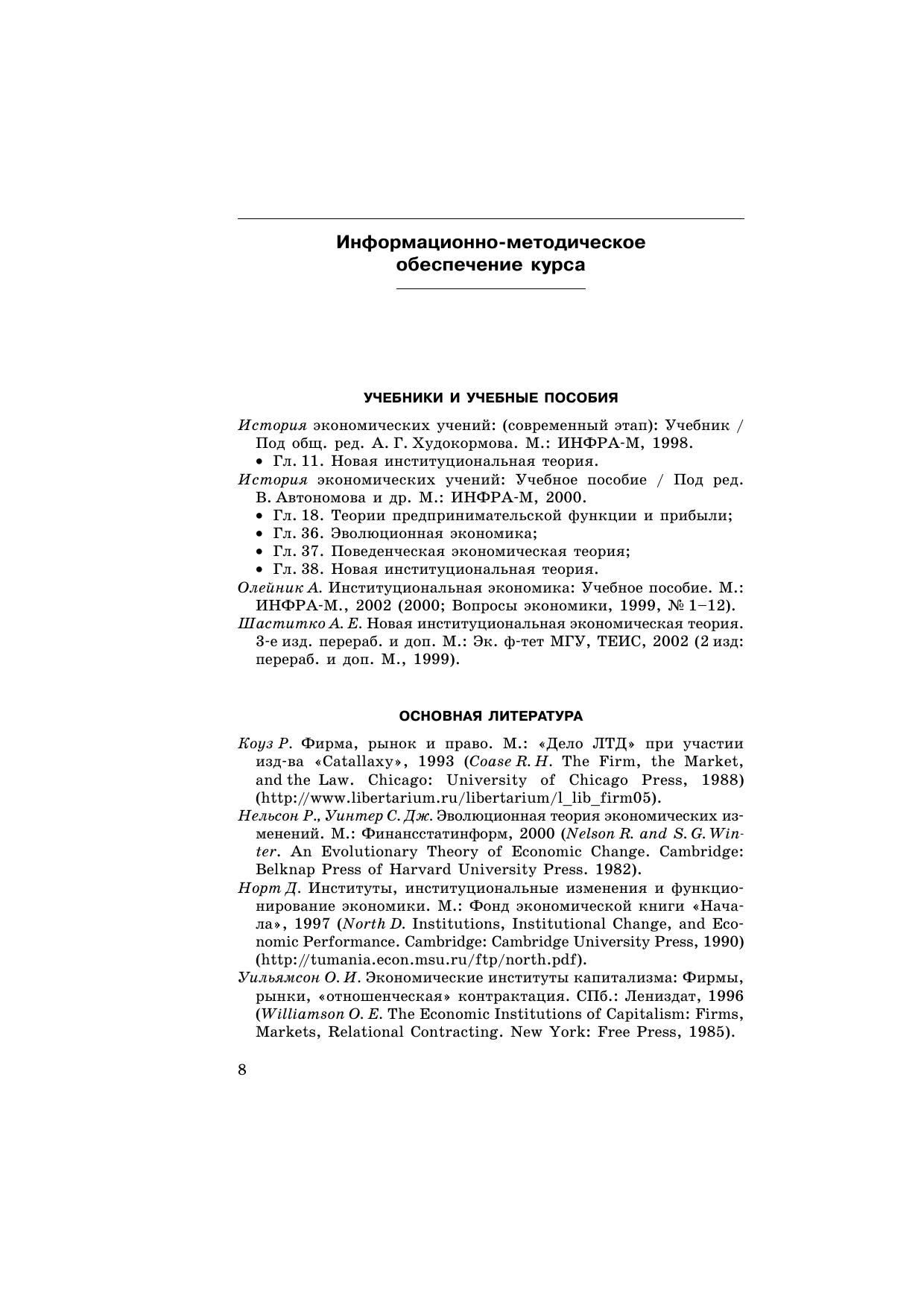 В настоящее время новая институциональная экономическая теория (НИЭТ) и эволюционная экономическая теория (ЭЭТ) представляют собой быстро прогрессирующие направления экономической науки. Предлагаемое издание является оригинальной авторской разработкой по учебно-методическому обеспечению преподавания и изучения данных предметных областей. Пособие включает в себя подробную программу курса, составленную с учетом современных мировых тенденций развития НИЭТ и ЭЭТ, материалы к лекциям по основополагающим методологическим вопросам, а также практические задания, рассчитанные на творческое применение теоретического материала: решение задач, анализ правовых актов, разбор мини-кейсов. Имеется глоссарий. Пособие предназначено для изучения и преподавания продвинутых курсов по институциональной экономике и эволюционной экономической теории.