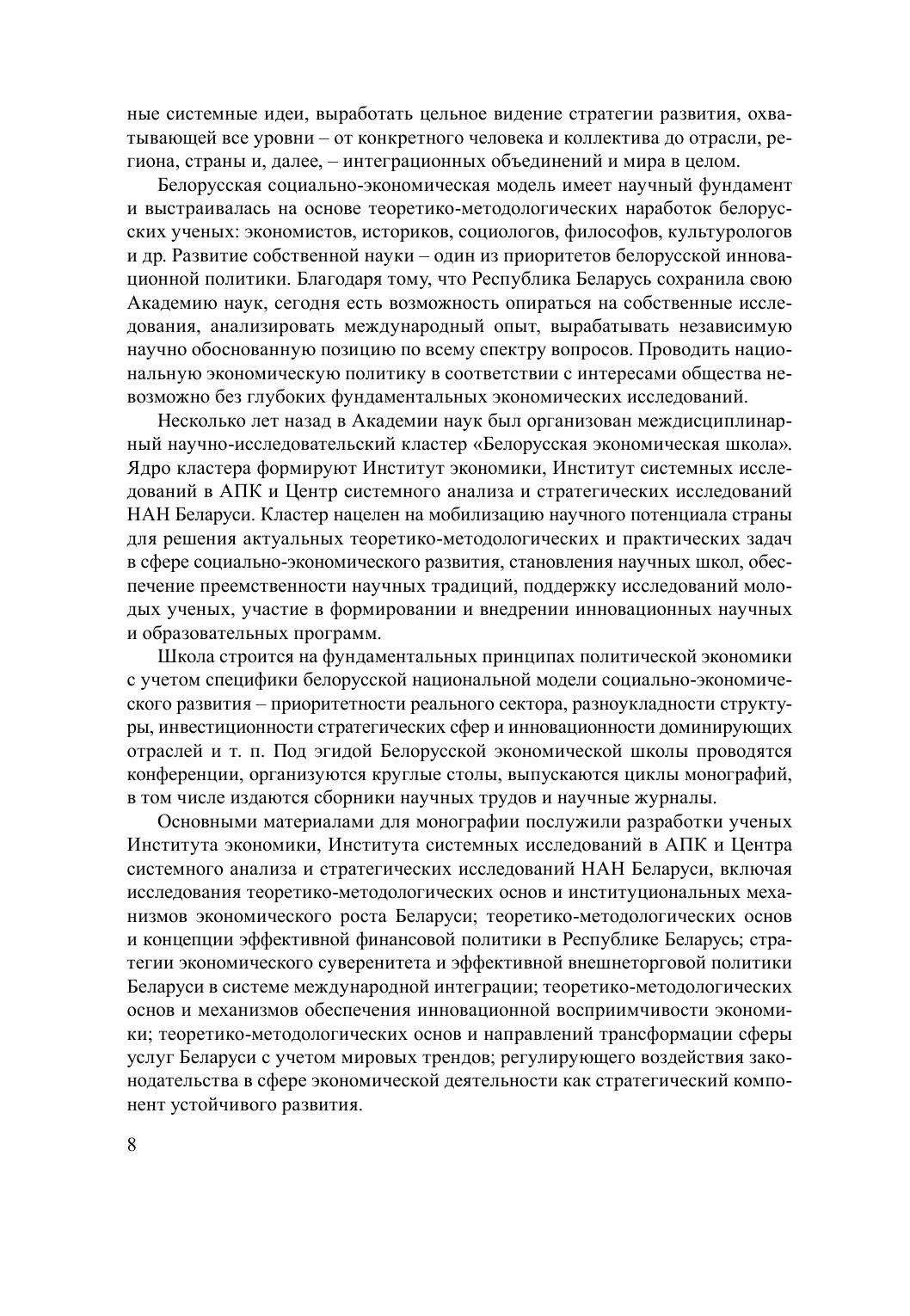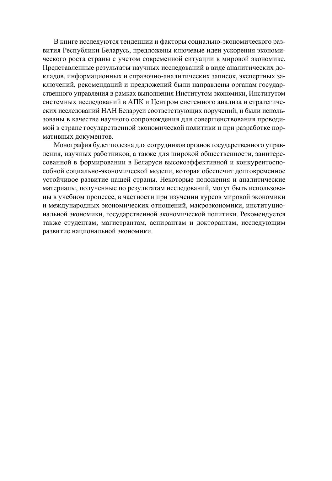 В монографии представлены основные результаты исследовательской работы ученых Белорусской экономической школы по наиболее актуальным проблемам развития белорусской социально-экономической модели. Отражены вопросы влияния институциональной среды, инновационной деятельности, внешнеторговой, финансовой, промышленной, агропромышленной и других политик на экономический рост. Определены целесообразные направления, риски, резервы и факторы развития национальной экономики на дальнейшую перспективу.