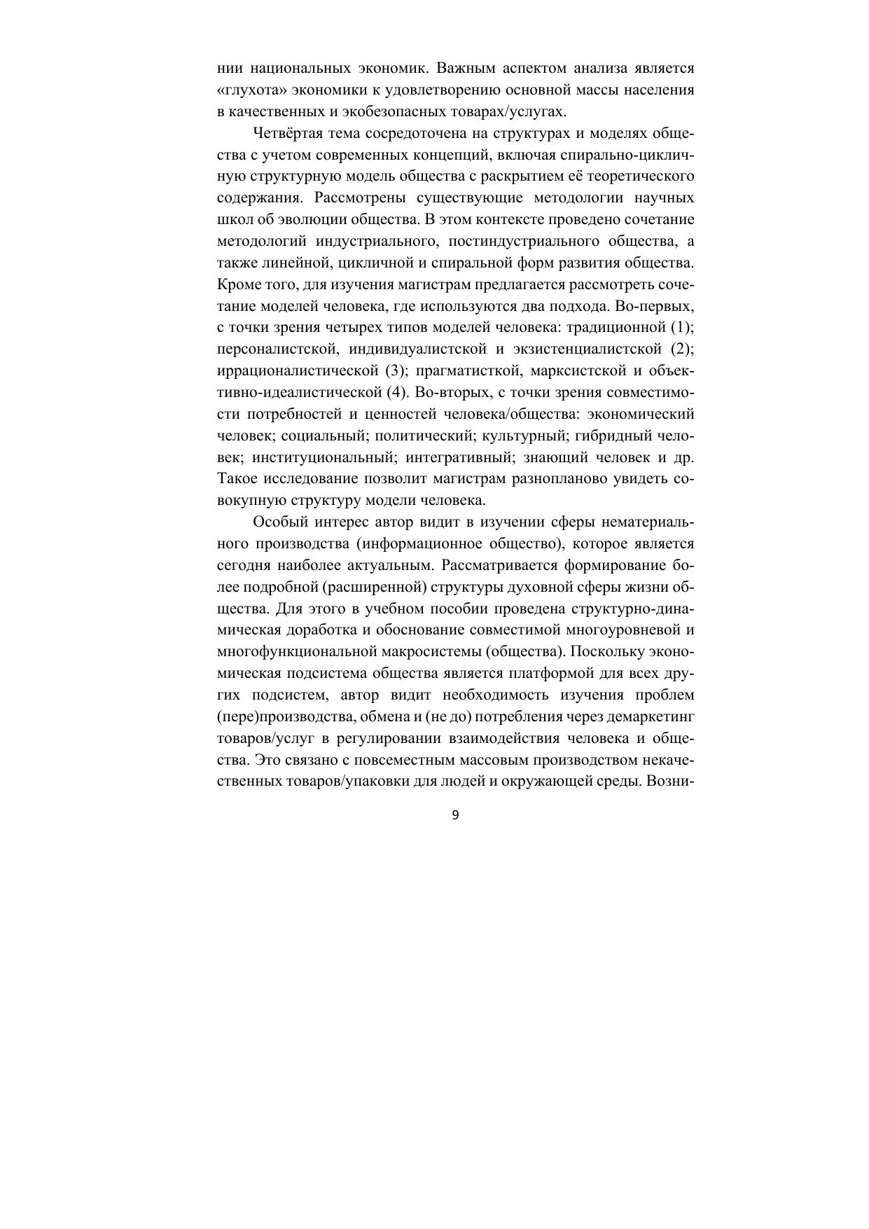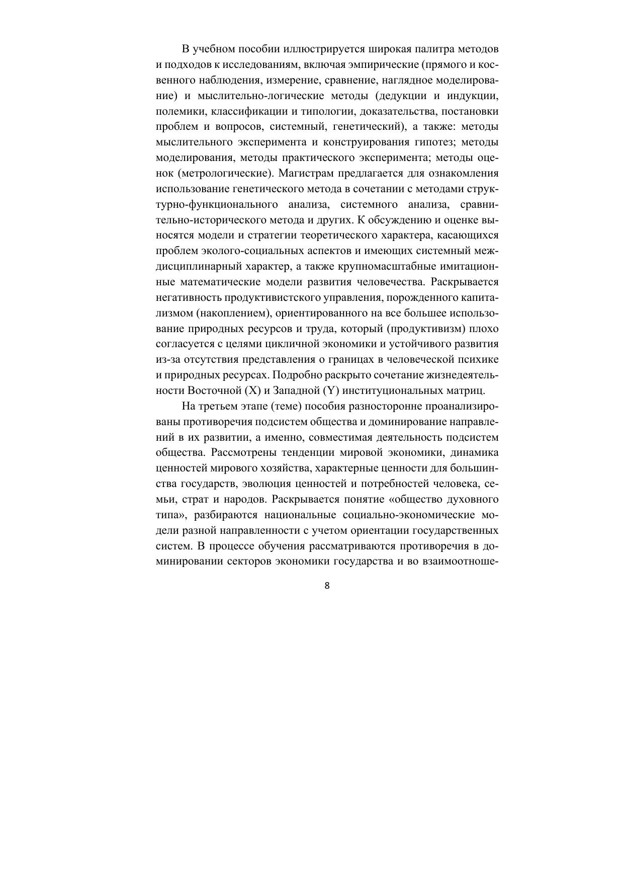 Широко и последовательно представлена методологическая основа совместимости систем, включая сферы политики, культуры, научно-познавательной подсистемы общества с их интеграцией в совокупную обновляемую структурную модель общества. Раскрыты теории, концепции и гипотезы развития: общества и человека; совместимости человеческих потребностей и общественных ценностей на платформе динамики ценностей; моральной, нравственной и духовной экономики; совместимости подсистем общества с окружающей средой. По каждой из тем предложена литература. В пособие включен список экзаменационных вопросов и заданий. Содержание работы учитывает профиль экономического факультета МГУ.