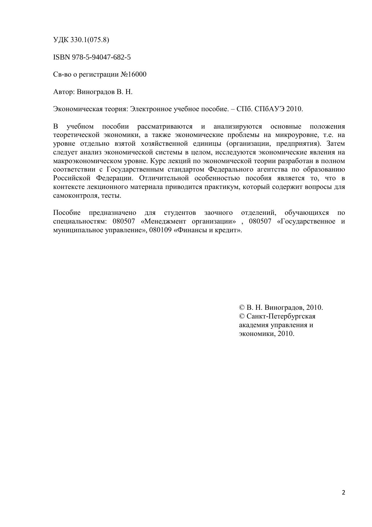 В учебном пособии рассматриваются и анализируются основные положения теоретической экономики, а также экономические проблемы на микроуровне, т.е. на уровне отдельно взятой хозяйственной единицы (организации, предприятия). Затем следует анализ экономической системы в целом, исследуются экономические явления на макроэкономическом уровне. Курс лекций по экономической теории разработан в полном соответствии с Государственным стандартом Федерального агентства по образованию Российской Федерации. Отличительной особенностью пособия является то, что в контексте лекционного материала приводится практикум, который содержит вопросы для самоконтроля, тесты. Пособие предназначено для студентов заочного отделений, обучающихся по специальностям: 080507 «Менеджмент организации», 080507 «Государственное и муниципальное управление», 080109 «Финансы и кредит». Электронное учебное пособие