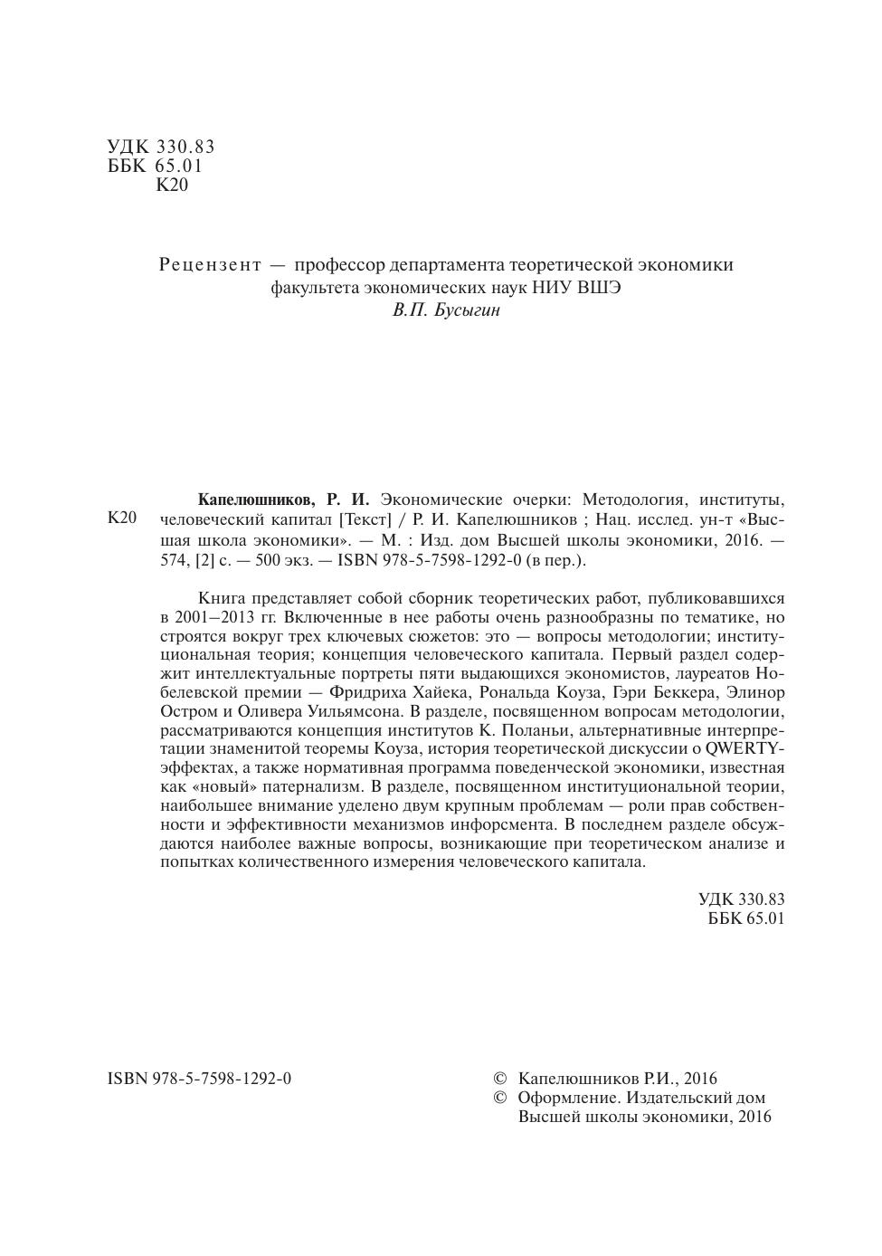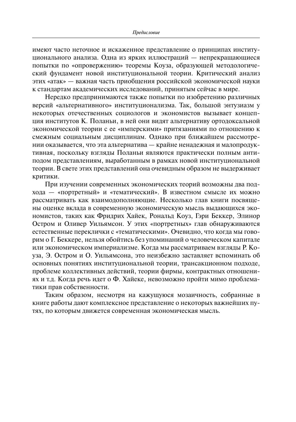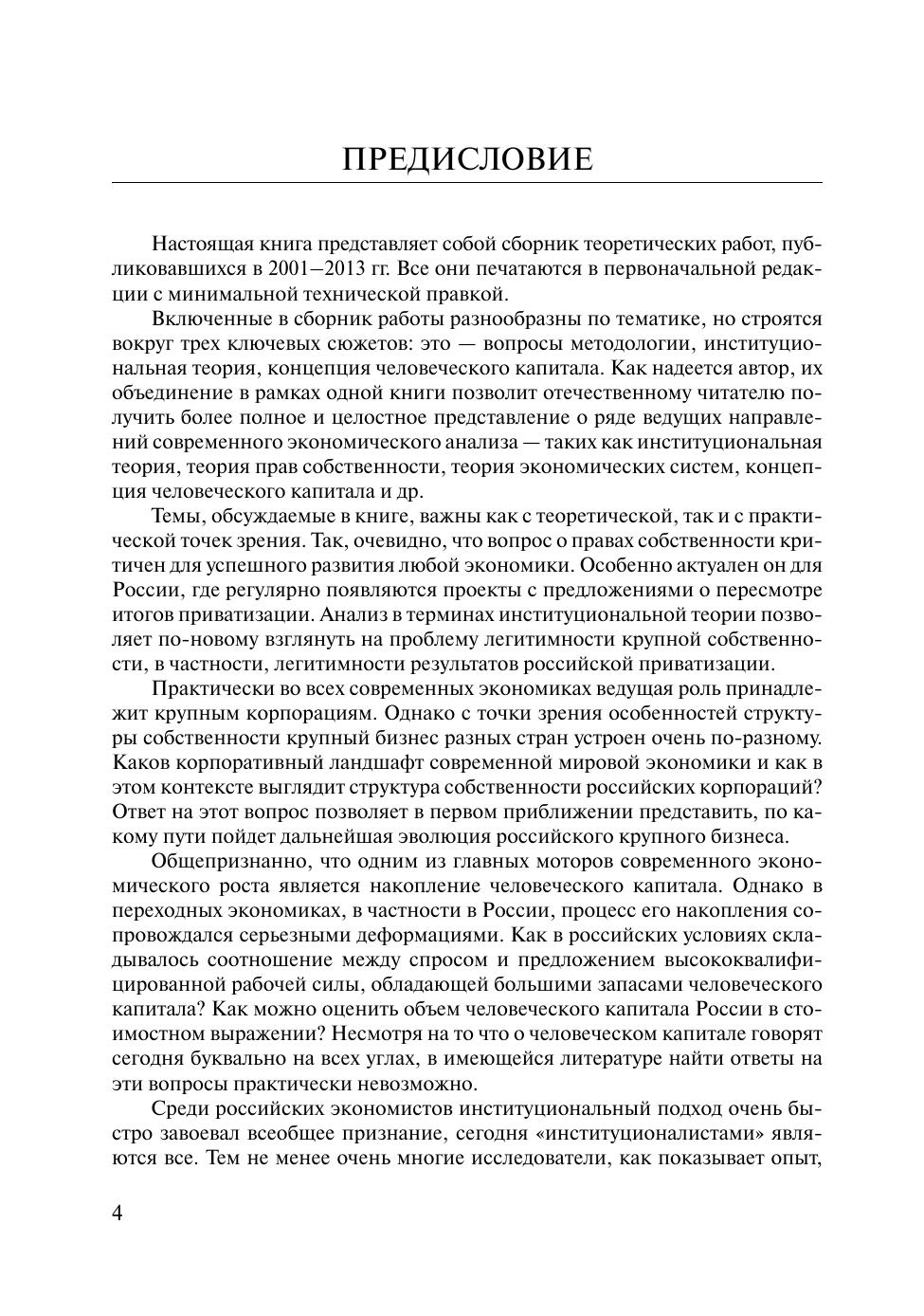 Книга представляет собой сборник теоретических работ, публиковавшихся в 2001–2013 гг. Включенные в нее работы очень разнообразны по тематике, но строятся вокруг трех ключевых сюжетов: это — вопросы методологии; институциональная теория; концепция человеческого капитала. Первый раздел содержит интеллектуальные портреты пяти выдающихся экономистов, лауреатов Нобелевской премии — Фридриха Хайека, Рональда Коуза, Гэри Беккера, Элинор Остром и Оливера Уильямсона. В разделе, посвященном вопросам методологии, рассматриваются концепция институтов К. Поланьи, альтернативные интерпретации знаменитой теоремы Коуза, история теоретической дискуссии о QWERTY-эффектах, а также нормативная программа поведенческой экономики, известная как «новый» патернализм. В разделе, посвященном институциональной теории, наибольшее внимание уделено двум крупным проблемам — роли прав собственности и эффективности механизмов инфорсмента. В последнем разделе обсуждаются наиболее важные вопросы, возникающие при теоретическом анализе и попытках количественного измерения человеческого капитала.