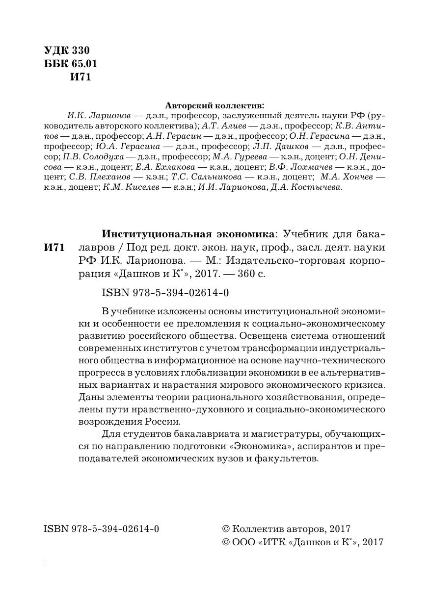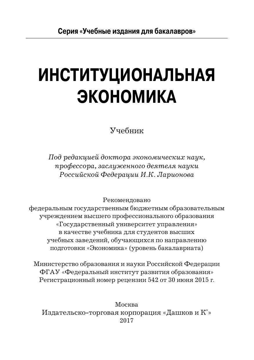 В учебнике изложены основы институциональной экономики и особенности ее преломления к социально-экономическому развитию российского общества. Освещена система отношений современных институтов с учетом трансформации индустриального общества в информационное на основе научно-технического прогресса в условиях глобализации экономики в ее альтернативных вариантах и нарастания мирового экономического кризиса. Даны элементы теории рационального хозяйствования, определены пути нравственно-духовного и социально-экономического возрождения России.