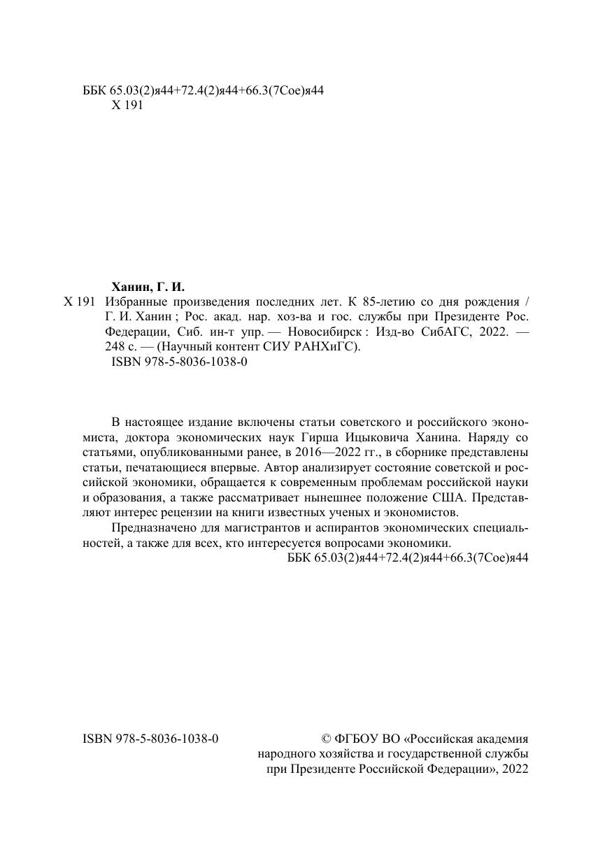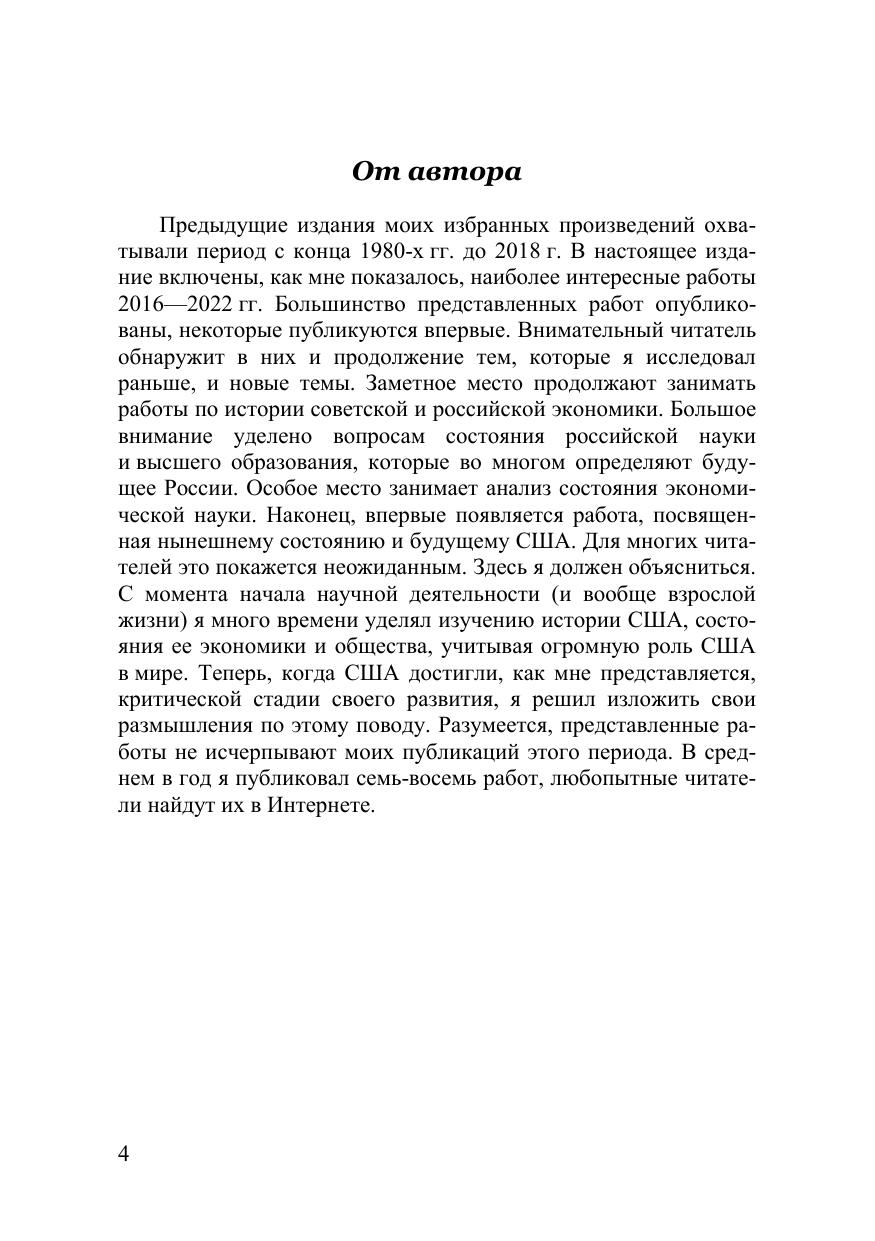 В настоящее издание включены статьи советского и российского экономиста, доктора экономических наук Гирша Ицыковича Ханина. Наряду со статьями, опубликованными ранее, в 2016—2022 гг., в сборнике представлены статьи, печатающиеся впервые. Автор анализирует состояние советской и российской экономики, обращается к современным проблемам российской науки и образования, а также рассматривает нынешнее положение США. Представляют интерес рецензии на книги известных ученых и экономистов. Предназначено для магистрантов и аспирантов экономических специальностей, а также для всех, кто интересуется вопросами экономики.