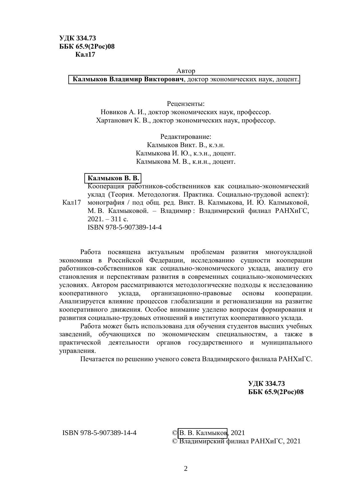 Работа посвящена актуальным проблемам развития многоукладной экономики в Российской Федерации, исследованию сущности кооперации работников-собственников как социально-экономического уклада, анализу его становления и перспективам развития в современных социально-экономических условиях. Автором рассматриваются методологические подходы к исследованию кооперативного уклада, организационно-правовые основы кооперации. Анализируется влияние процессов глобализации и регионализации на развитие кооперативного движения. Особое внимание уделено вопросам формирования и развития социально-трудовых отношений в институтах кооперативного уклада. Работа может быть использована для обучения студентов высших учебных заведений, обучающихся по экономическим специальностям, а также в практической деятельности органов государственного и муниципального управления. Печатается по решению ученого совета Владимирского филиала РАНХиГС.