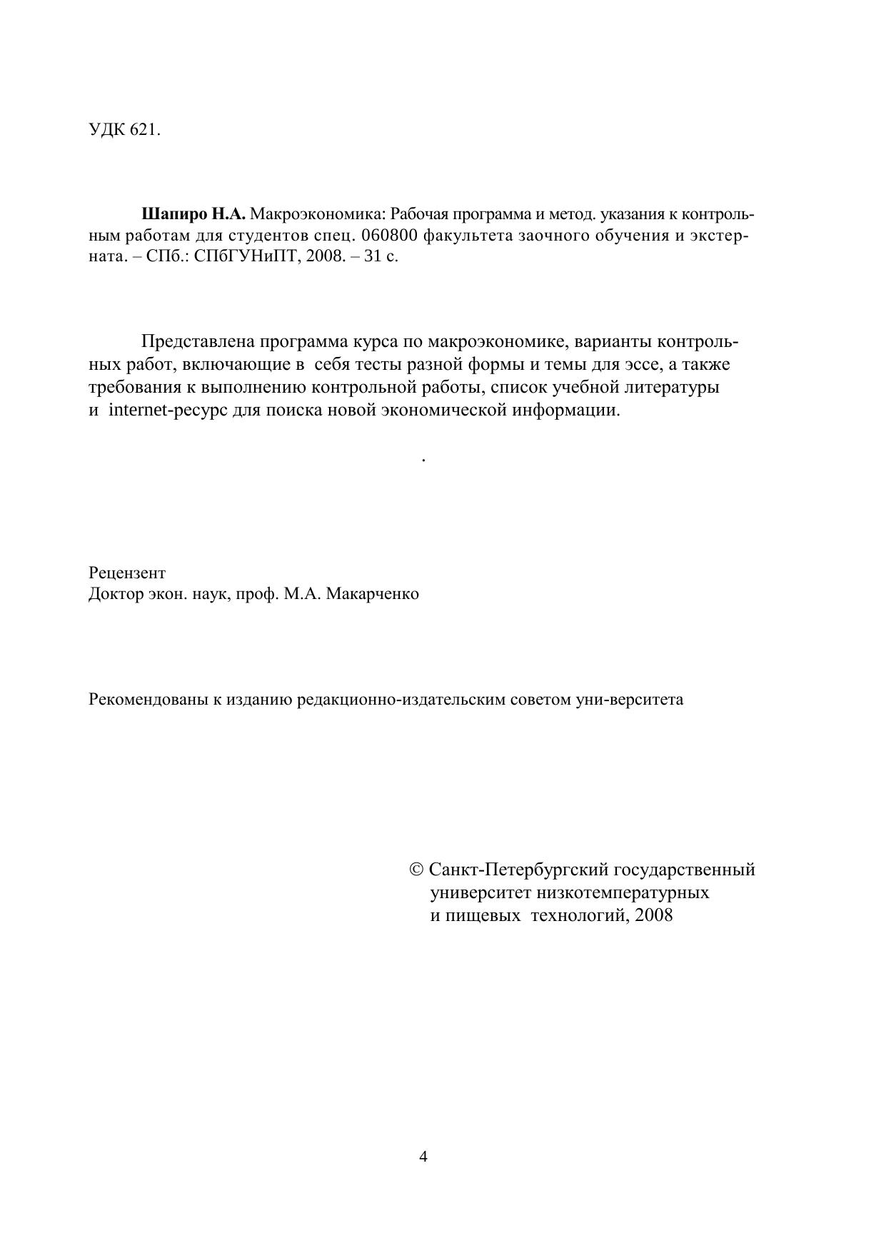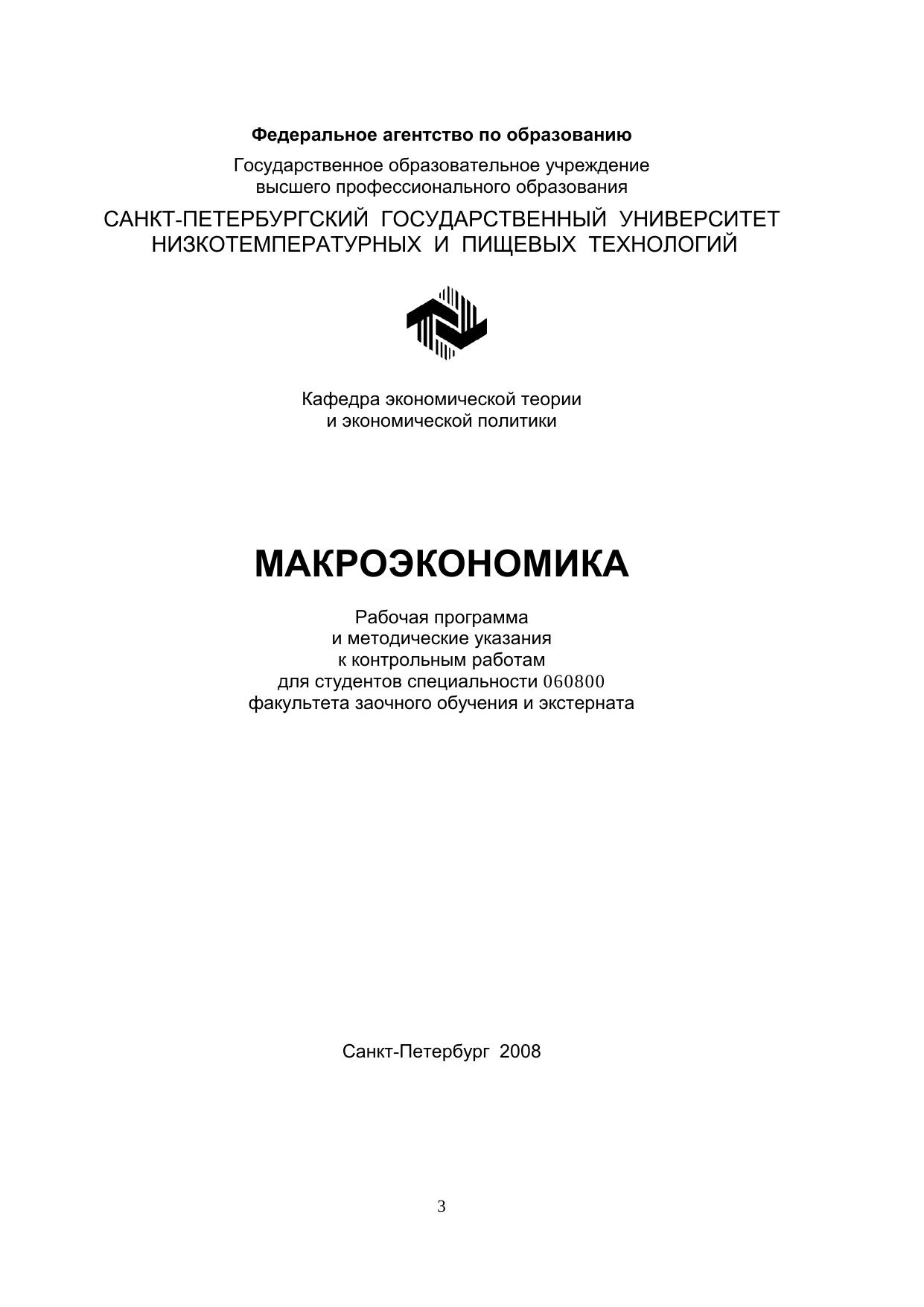 Макроэкономика: Рабочая программа и методические указания к контрольным работам для студентов спец. 060800 факультета заочного обучения и экстерната