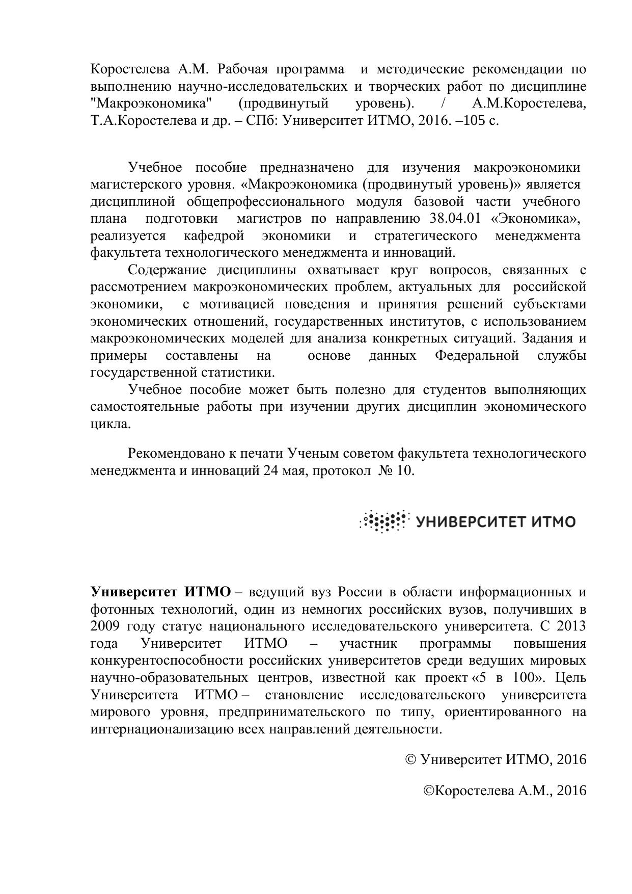 Рабочая программа и методические рекомендации по выполнению научно-исследовательских и творческих работ по дисциплине "Макроэкономика" (продвинутый уровень)