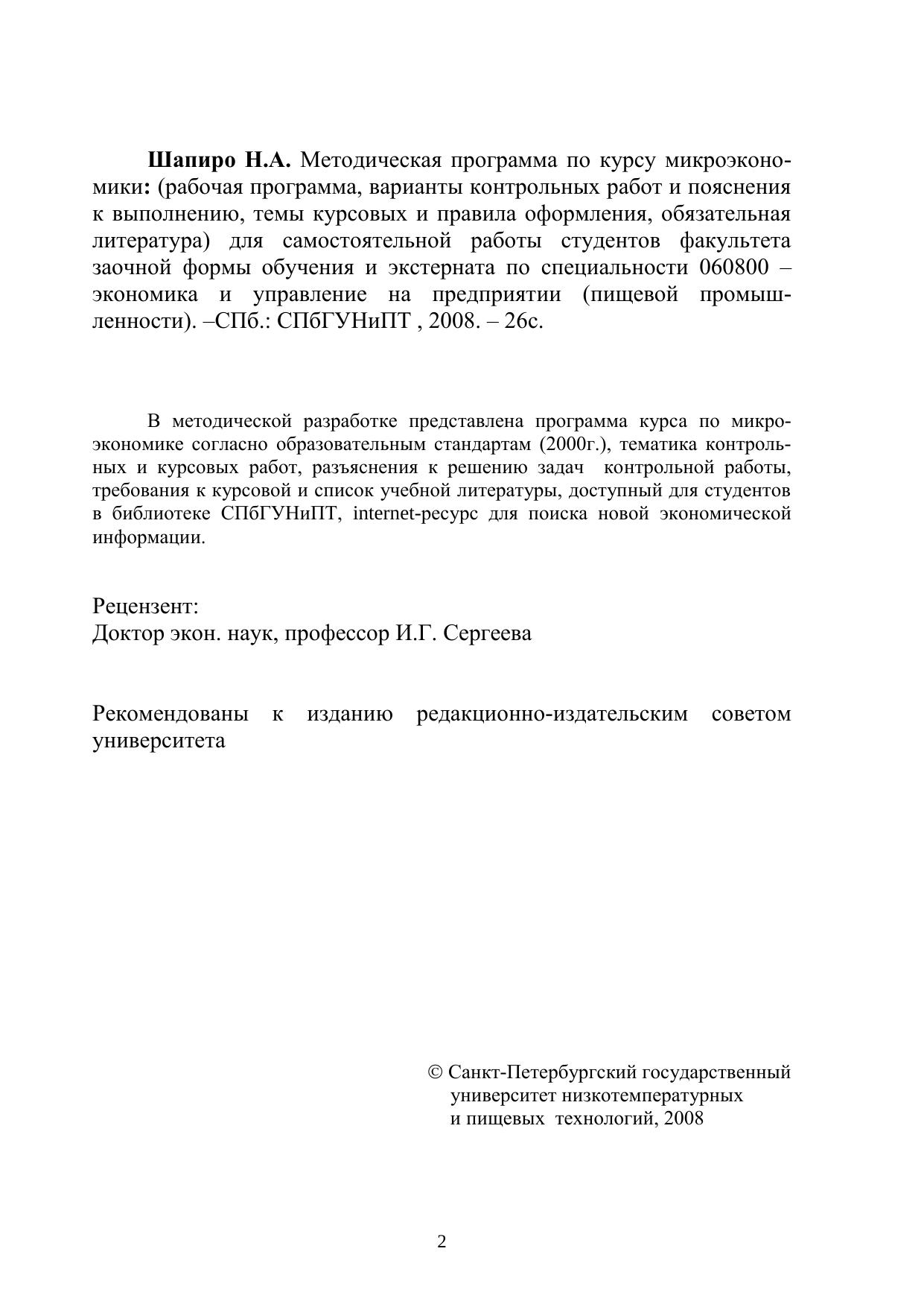 В методической разработке представлена программа курса по микроэкономике согласно образовательным стандартам (2000г.), тематика контрольных и курсовых работ, разъяснения к решению задач контрольной работы, требования к курсовой и список учебной литературы, доступный для студентов в библиотеке СПбГУНиПТ, internet-ресурс для поиска новой экономической информации.